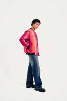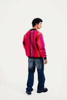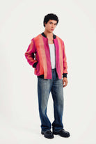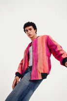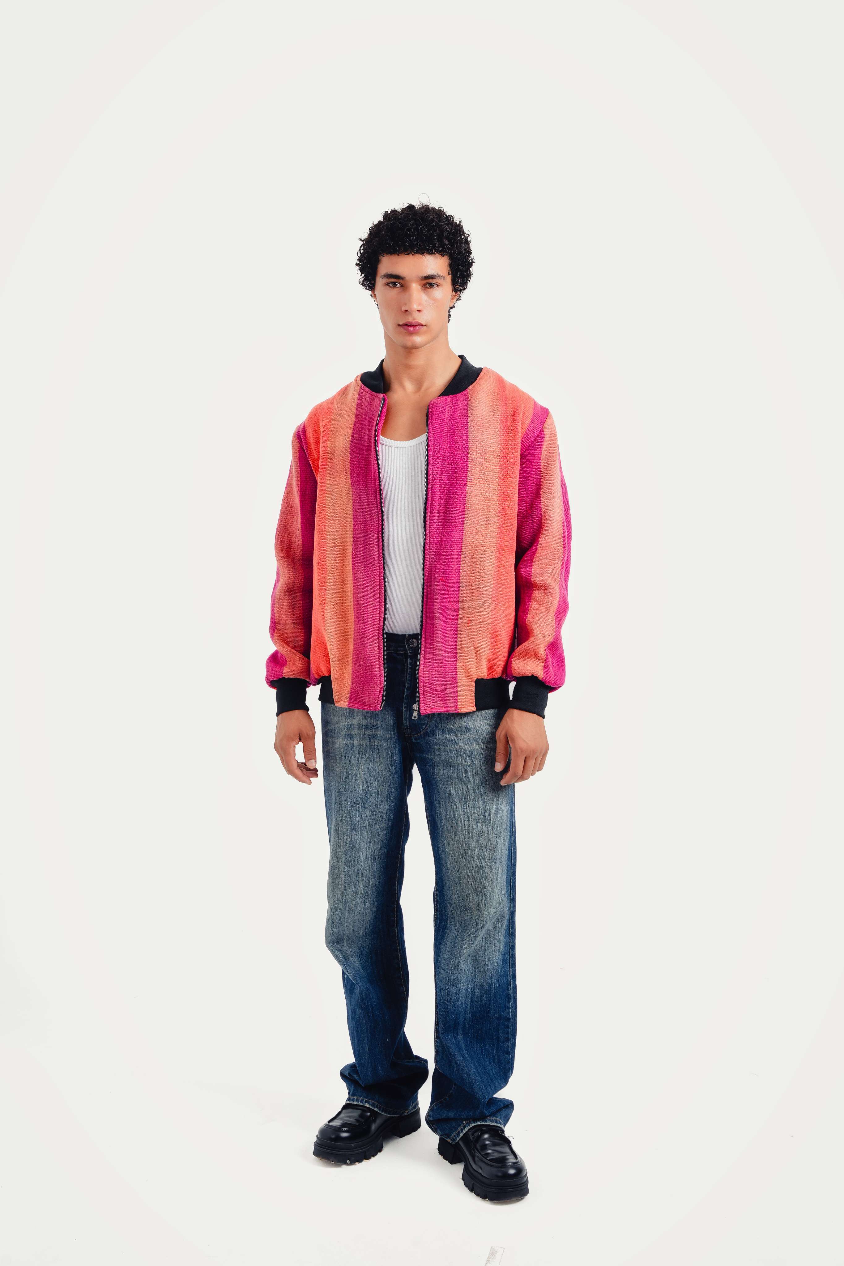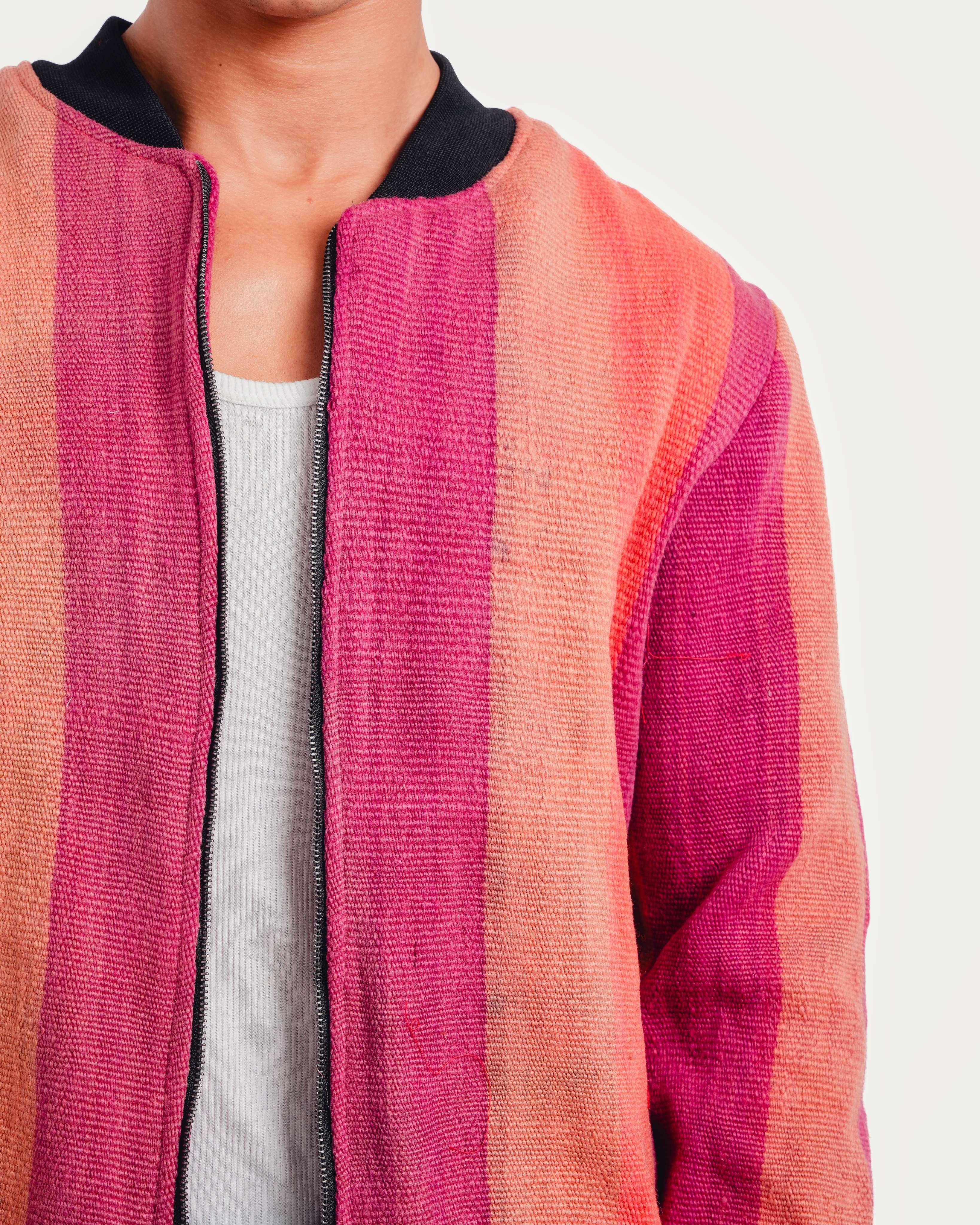- Vibrant Striped Fabric: The jacket is crafted from a thick, heavy, woven textile featuring bold, vertical stripes. The palette is a mix of vivid and warm tones, primarily bright pink, deep fuchsia/magenta, and a pale orange/salmon, contrasted with lines of black or very dark purple.