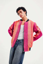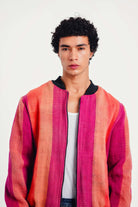 Add electric color and dynamic texture to your everyday look with this striking zip-up bomber jacket, a cropped piece that transforms a casual silhouette with bold, hand-loomed stripes.