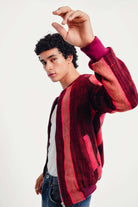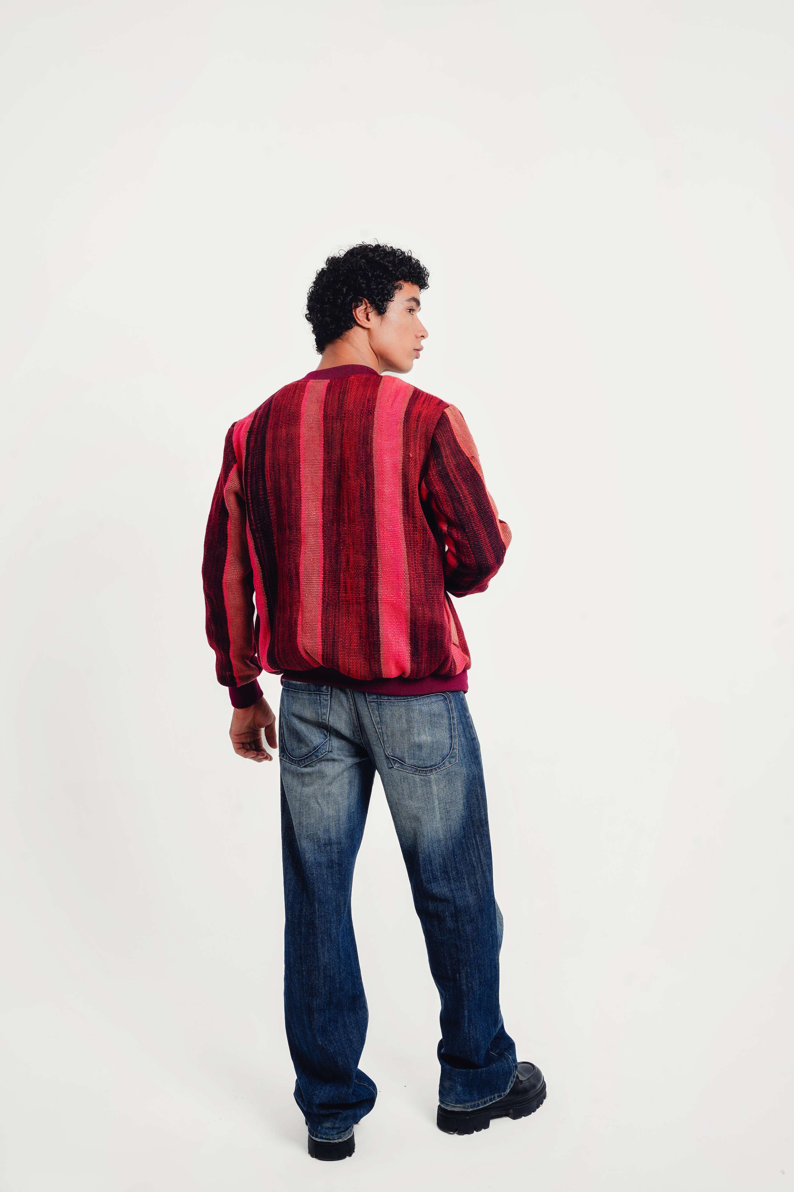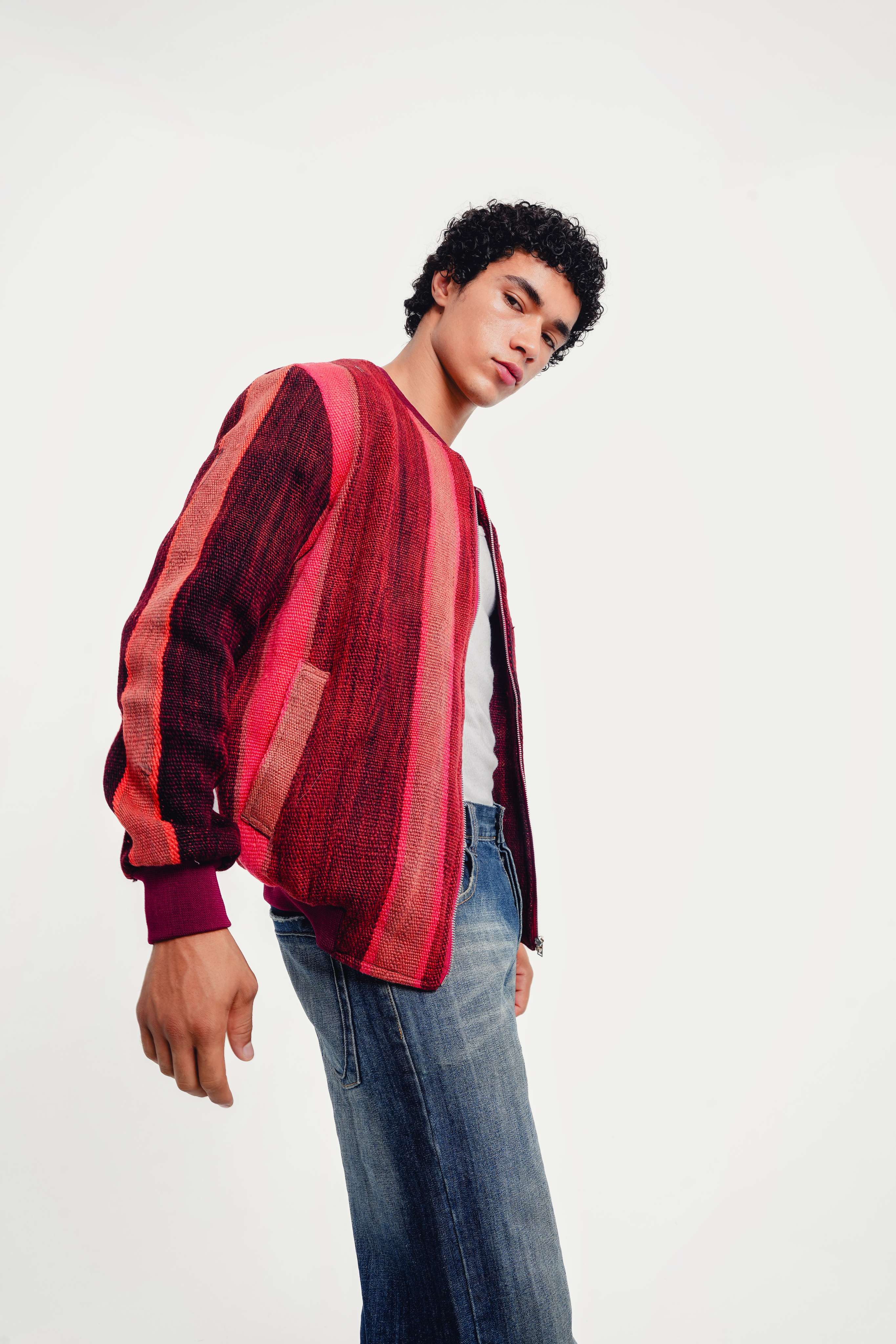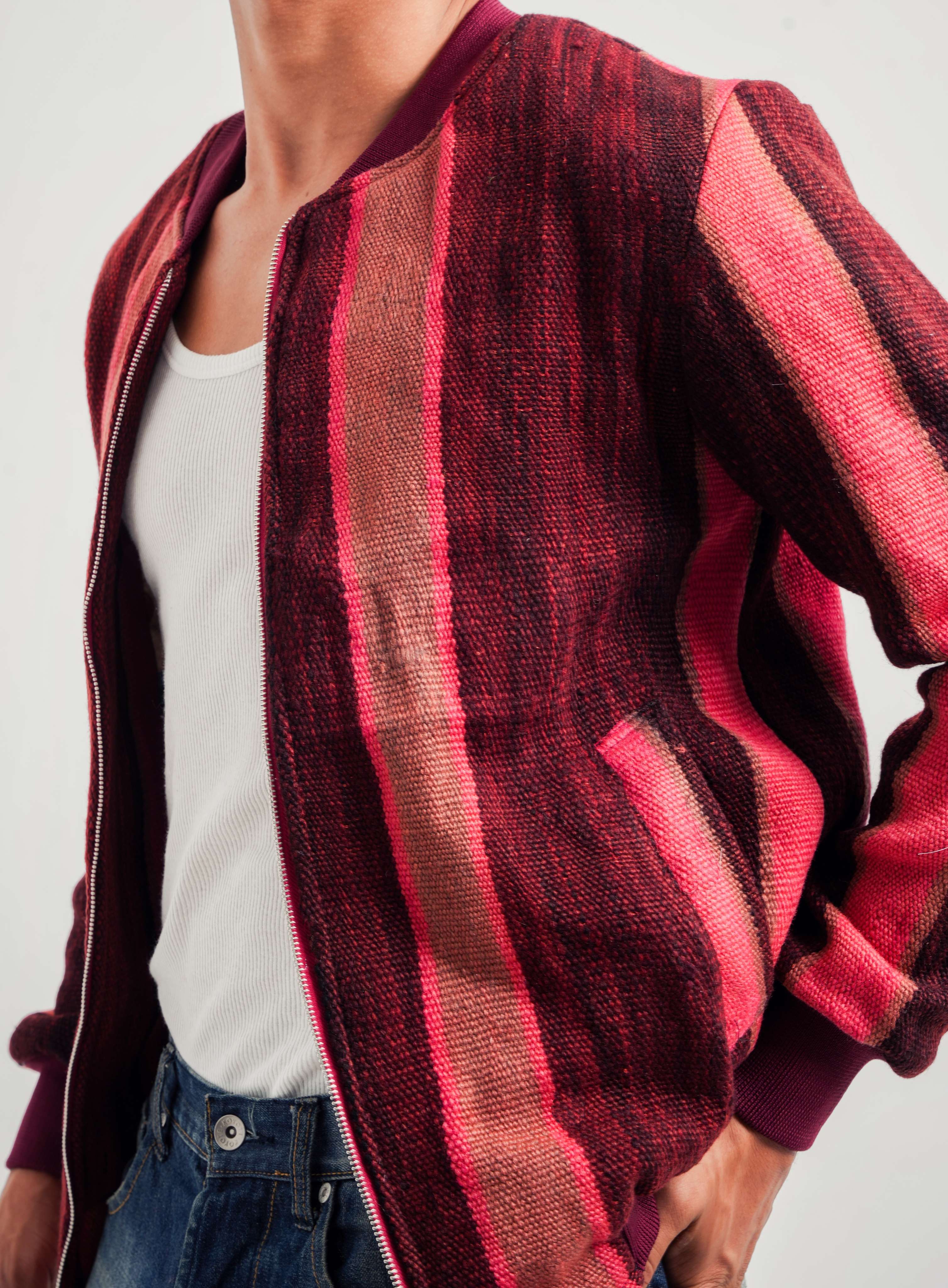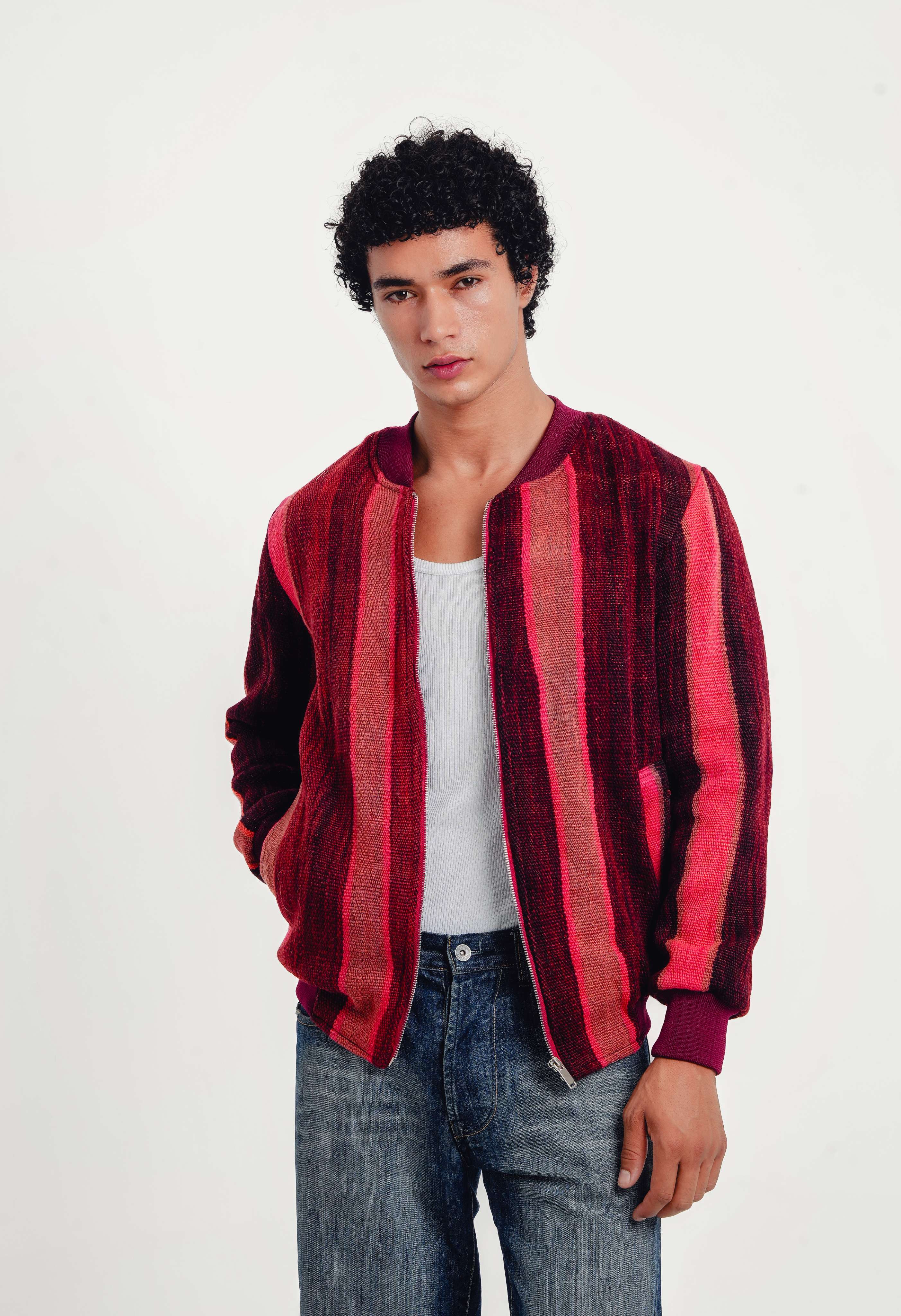 Inspired by the deep, gem-like tones of Moroccan pomegranates and the earthy warmth of desert landscapes at dusk, the Garnet bomber is an exercise in rich, tonal beauty. Our artisan partners in Morocco expertly wove this piece with thick, vertical stripes of deep garnet, rose, and maroon, creating a design that is both striking and sophisticated. It’s a versatile, timeless jacket that captures the soul of the country's natural palette.