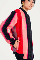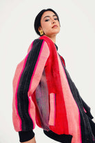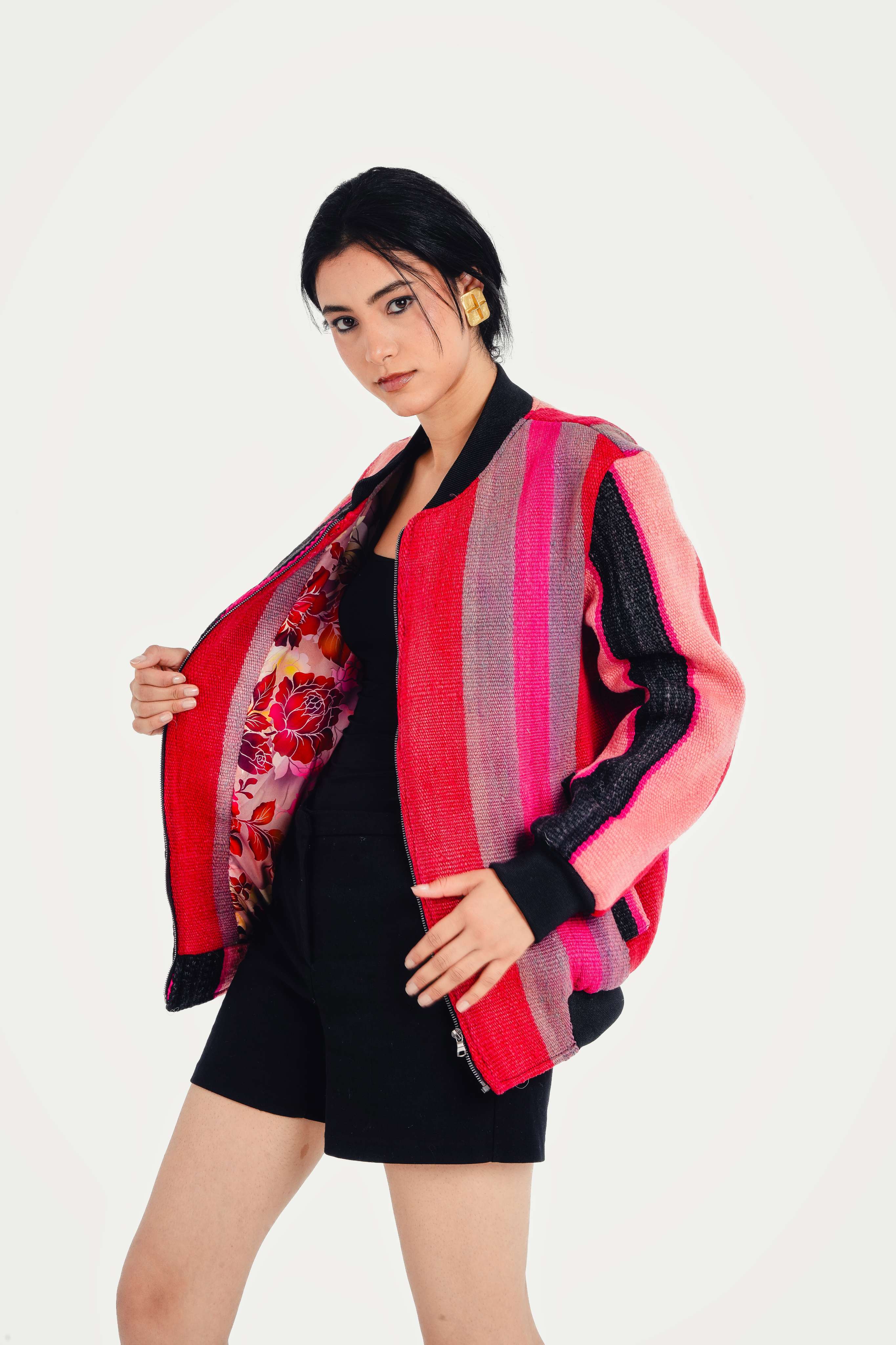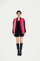 This statement bomber is incredibly versatile. For a chic, powerful look, pair it with simple black shorts and knee-high boots, as styled. It also layers beautifully over a black dress or with your favorite jeans for a more casual, artistic look that moves effortlessly from day to night.