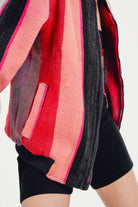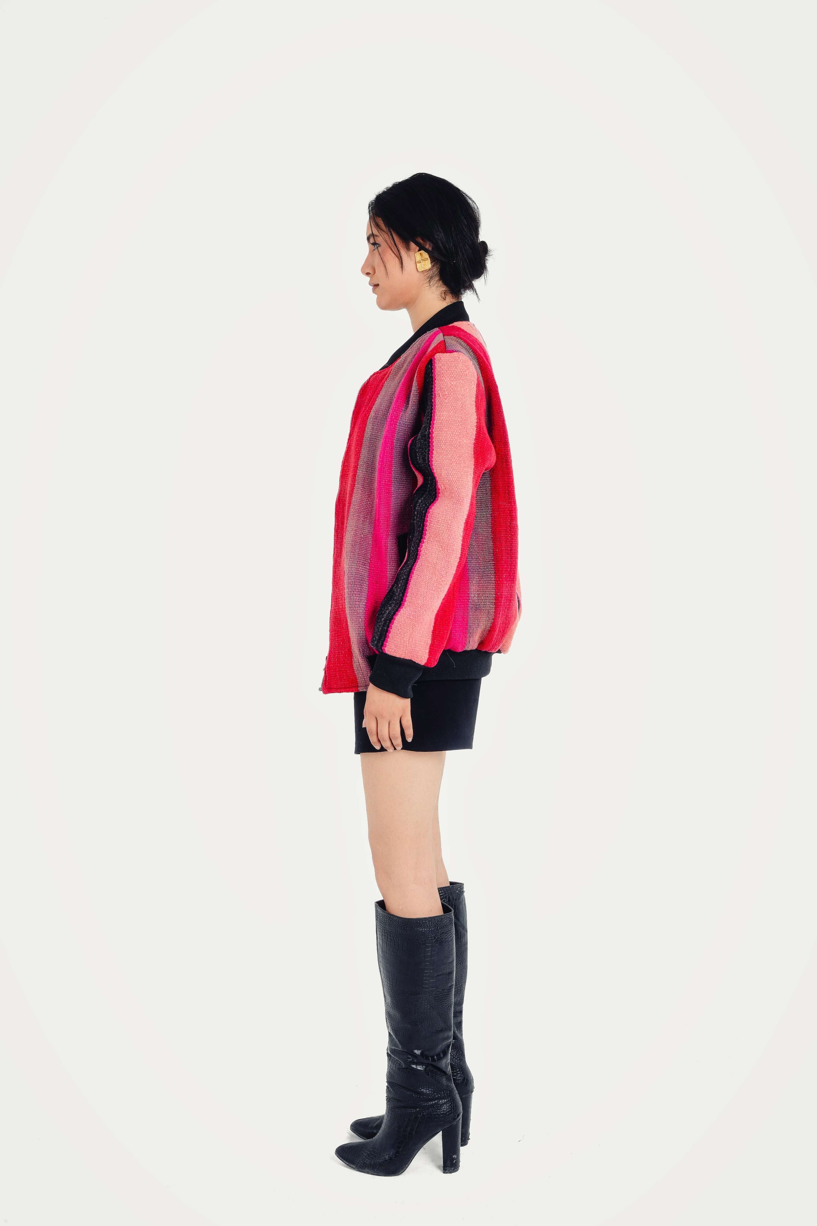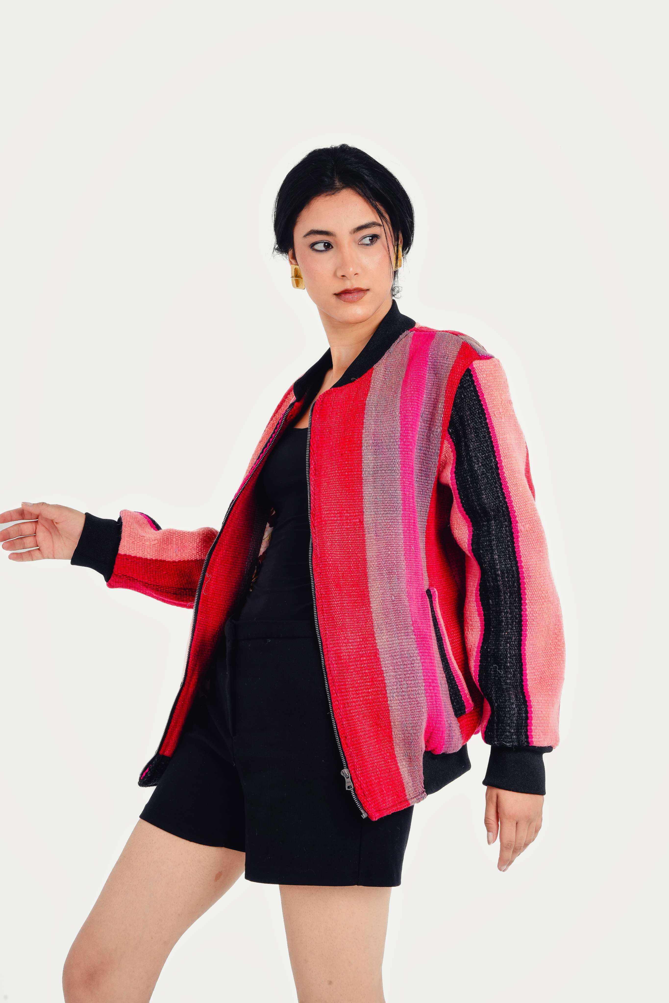 Inspired by the soft, hazy colors of the Moroccan landscape as the sun rises, this bomber is a tribute to the ancient art of Berber weaving. It evokes the feeling of wrapping yourself in a hand-loomed blanket, rich with the stories and symbols of nomadic life. Handcrafted in Morocco, its unique fabric is a masterpiece of texture and color, a soulful piece of wearable art for the modern traveler.