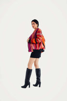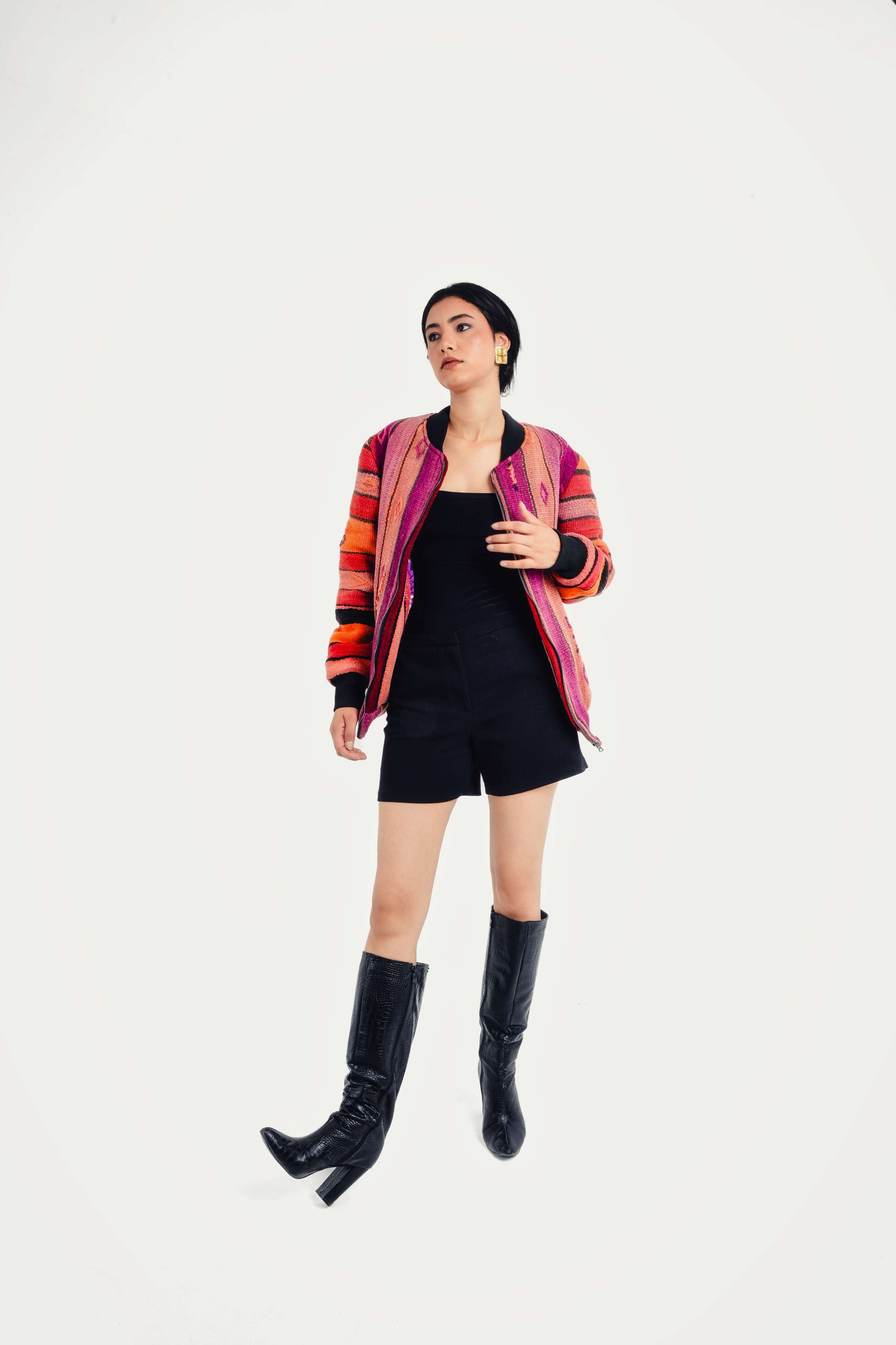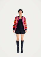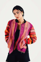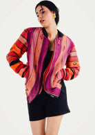 A vibrant, energetic bomber jacket that feels like a treasured textile discovered in a sun-drenched bazaar.