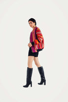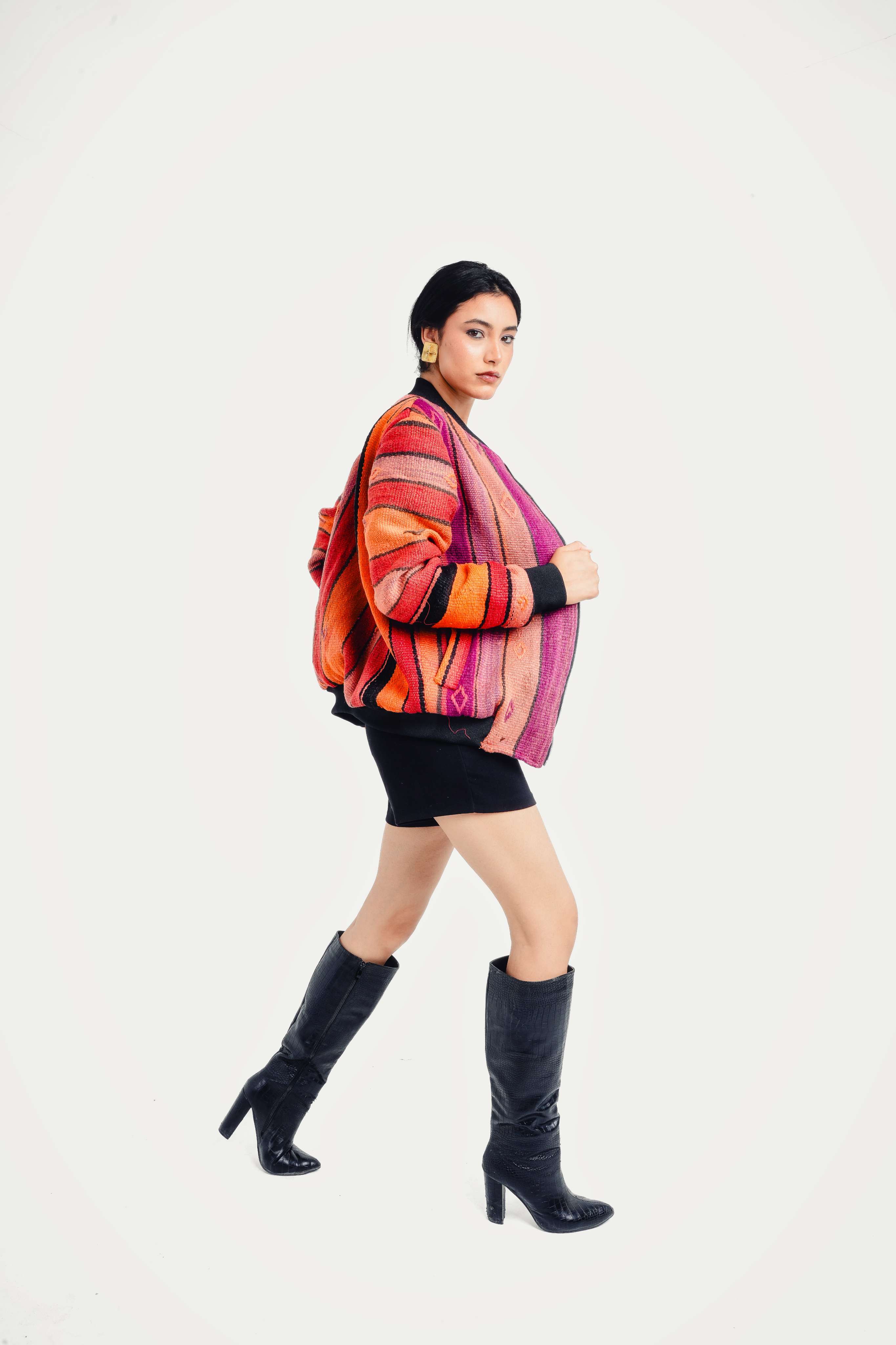 Inspired by the brilliant, jewel-toned colors of a Moroccan market, from glistening pomegranate seeds to piles of rich dye, this bomber is a tribute to the ancient art of Berber weaving. It evokes the feeling of wrapping yourself in a hand-loomed blanket, rich with the stories and symbols of nomadic life. Handcrafted in Morocco, its unique fabric is a masterpiece of texture and color, a soulful piece of wearable art for the modern traveler.