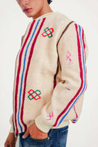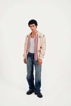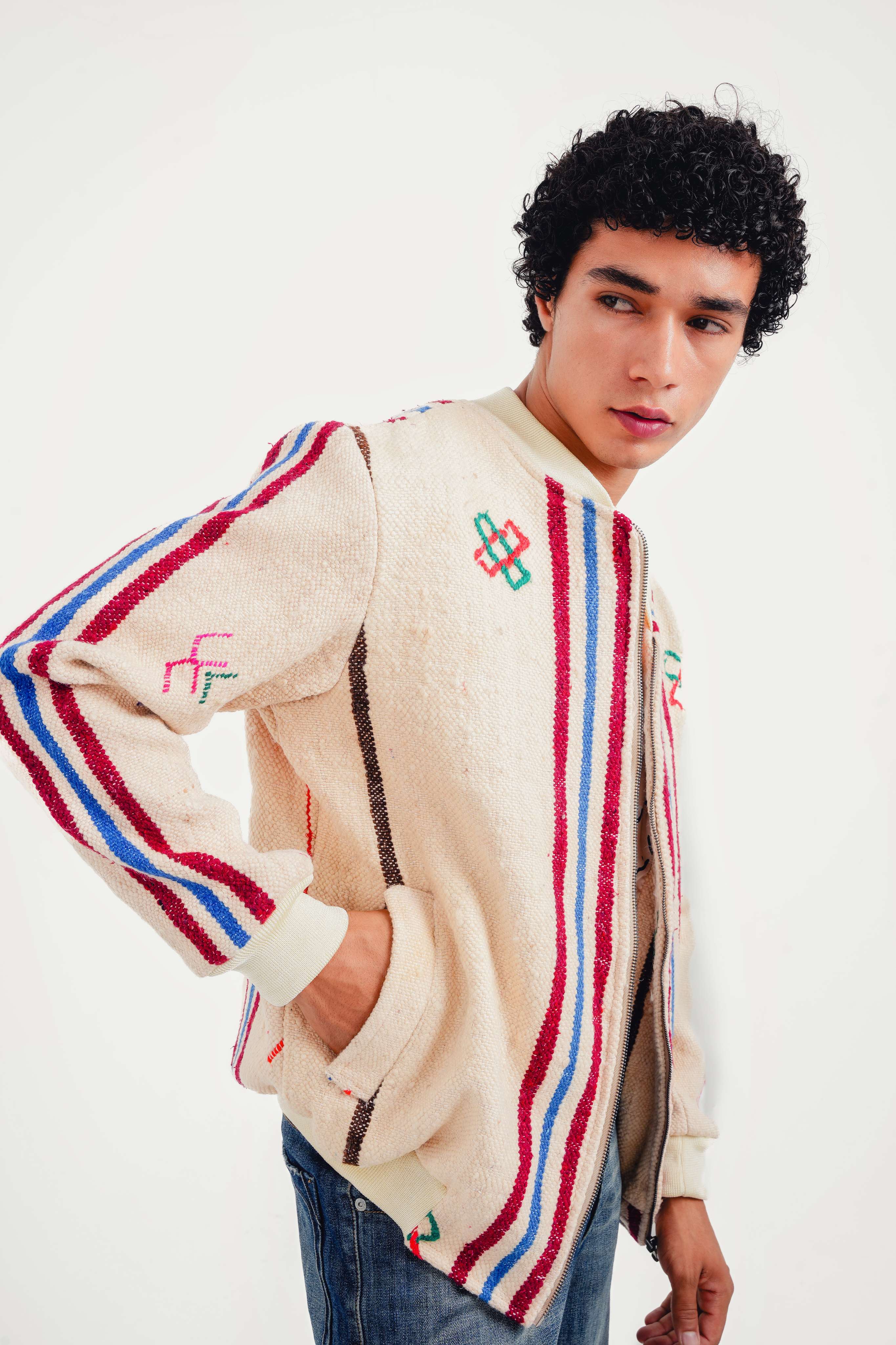 Inspired by the bold simplicity of geometric patterns and the raw elegance of handwoven textiles, the Berber Weave Bomber - Bone takes the classic athletic silhouette and transforms it into a polished, textural statement piece.
