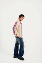 - High-Contrast Woven Fabric: The jacket is crafted from a thick, heavy, woven textile featuring bold, vertical stripes. The palette is a classic, clean mix of creamy off-white/bone and deep black or charcoal gray stripes for sharp contrast.