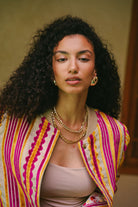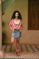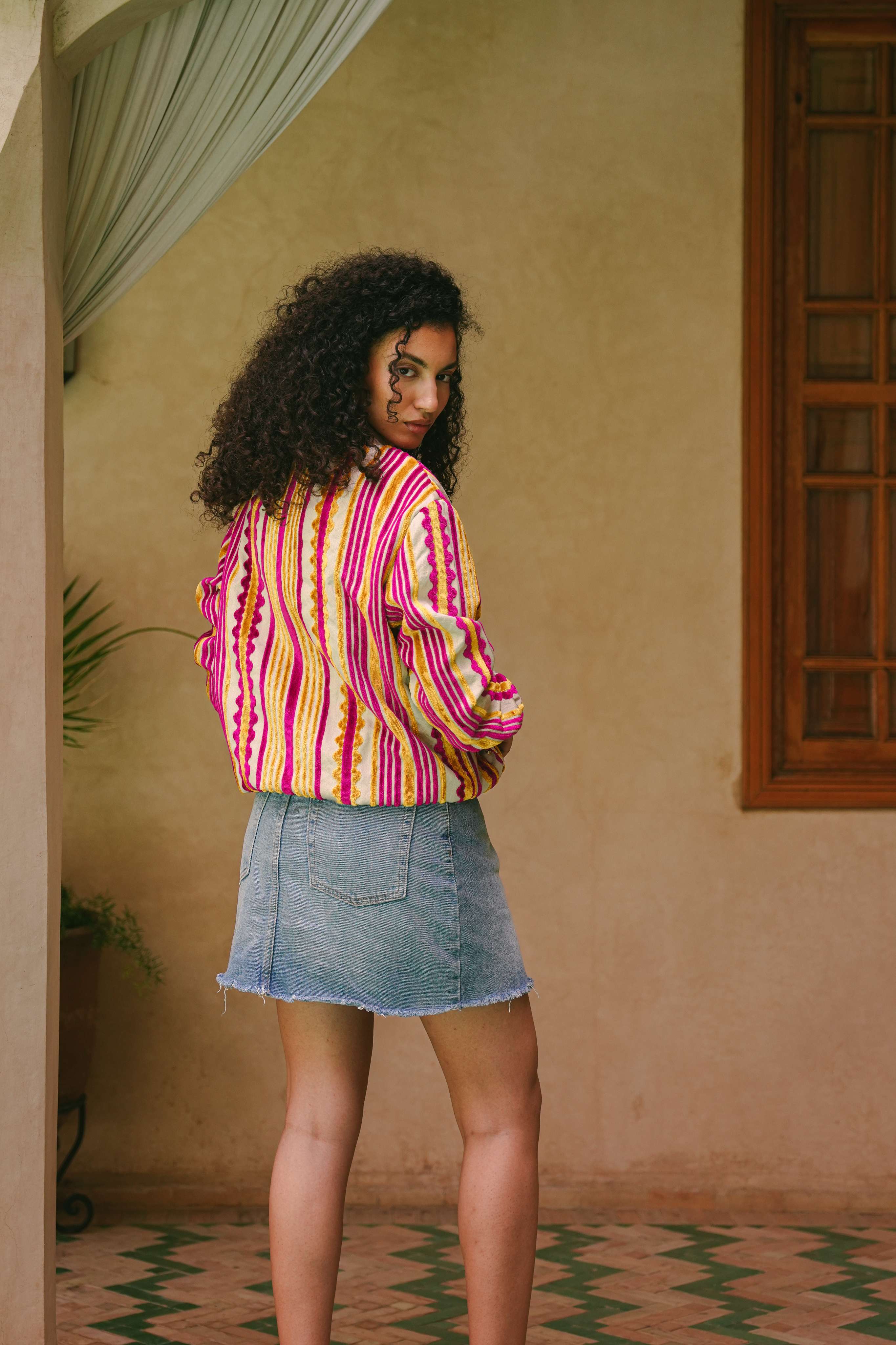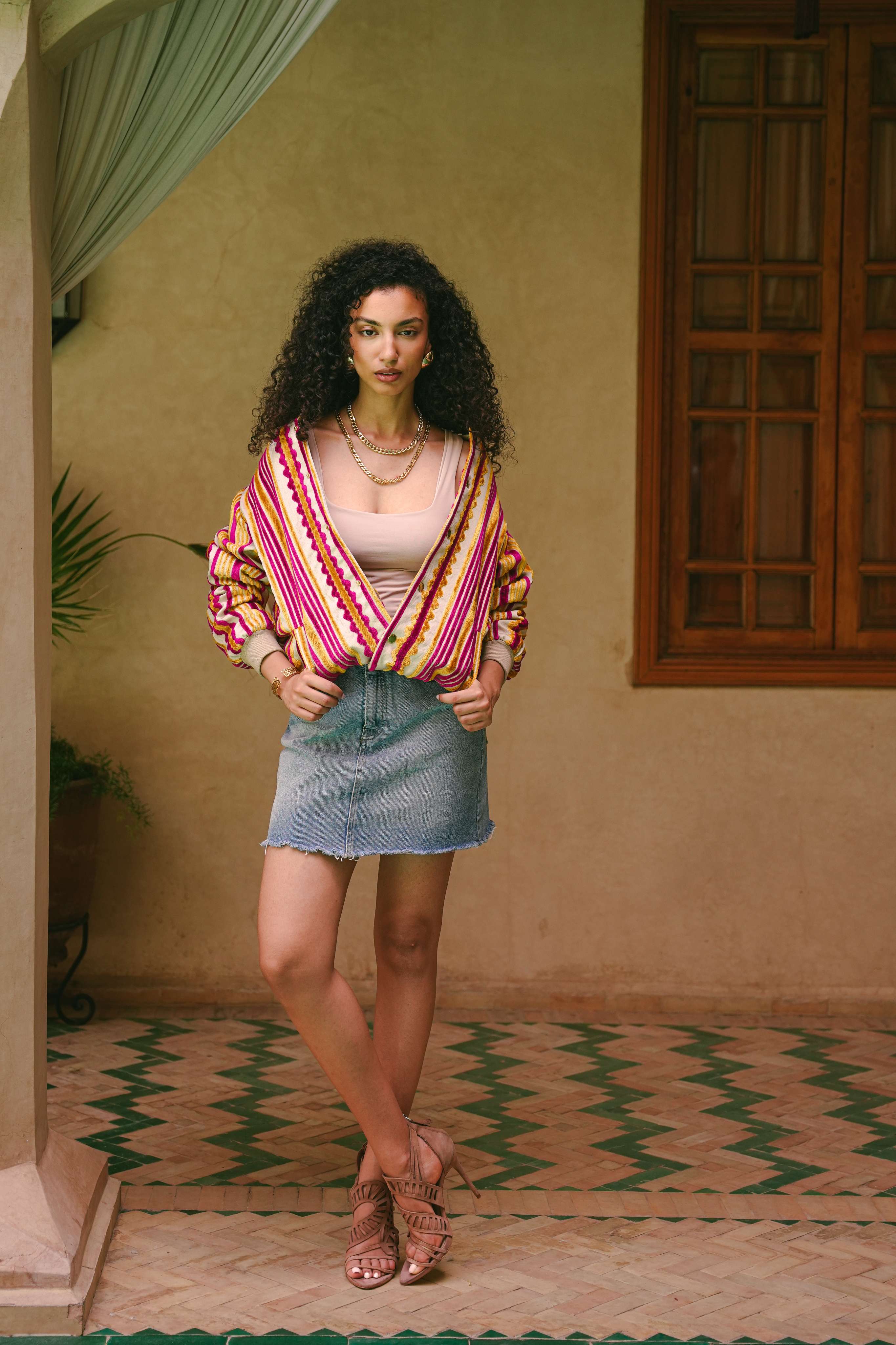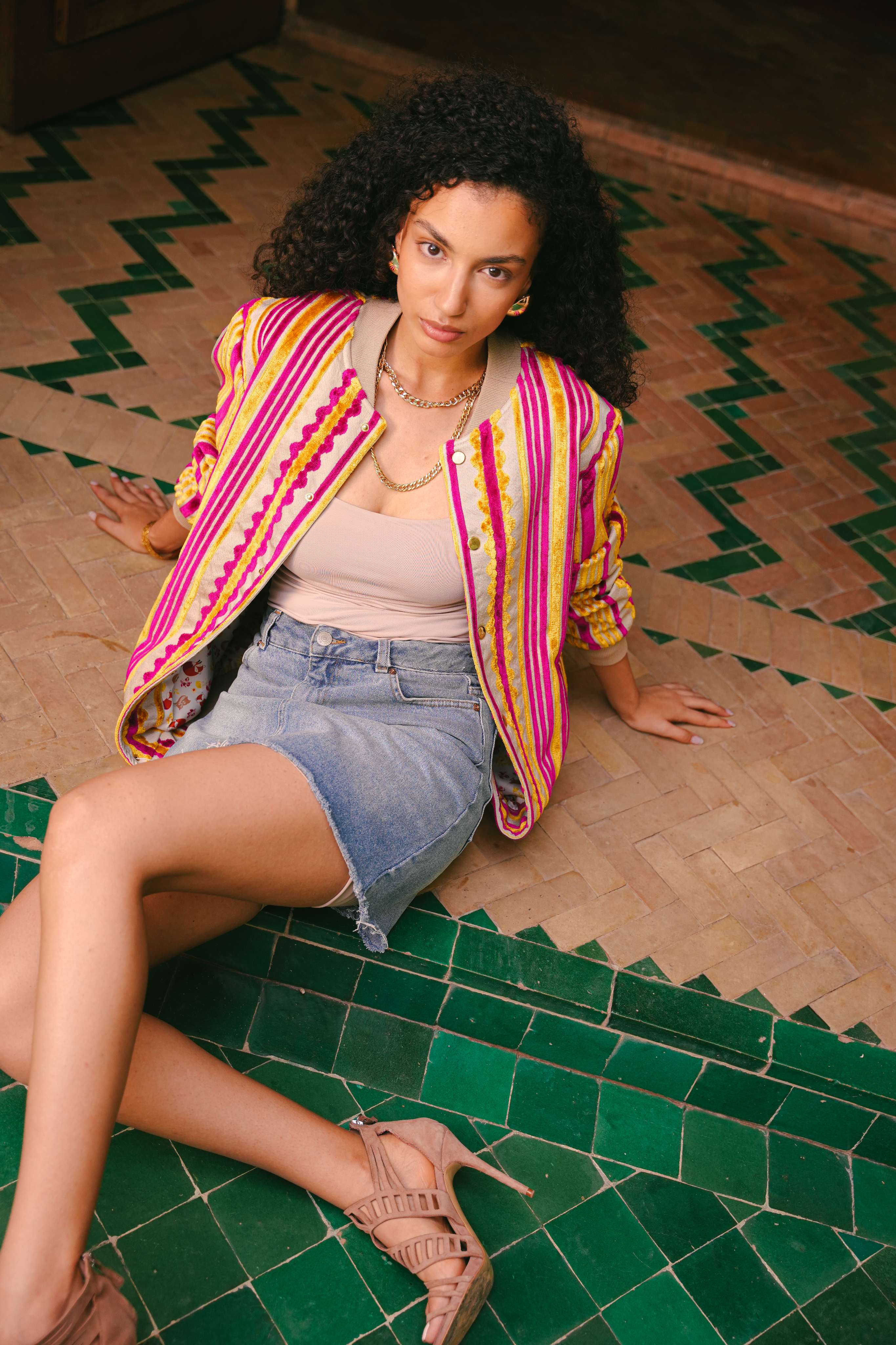 Find inspiration in the vivid colors that paint the Moroccan sky at dusk. The Tamarisk Bomber Jacket is a tribute to this magical moment, its unique fabric a masterpiece of texture and color, reminiscent of the hand-woven textiles found in the bustling souks of Marrakech. Handcrafted in Morocco, it’s a piece of relaxed, artistic luxury, perfect for adding a touch of worldly glamour to any look.