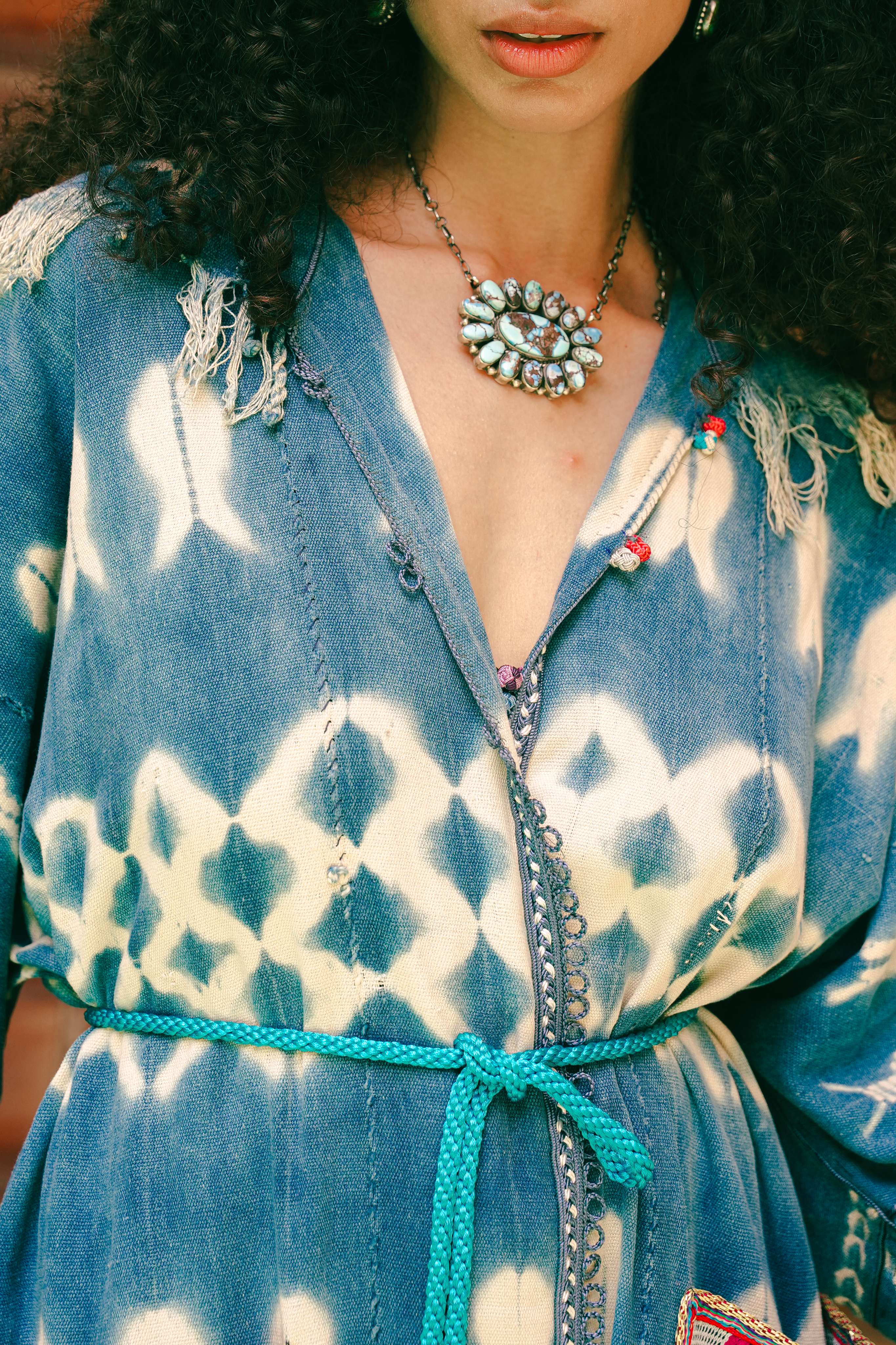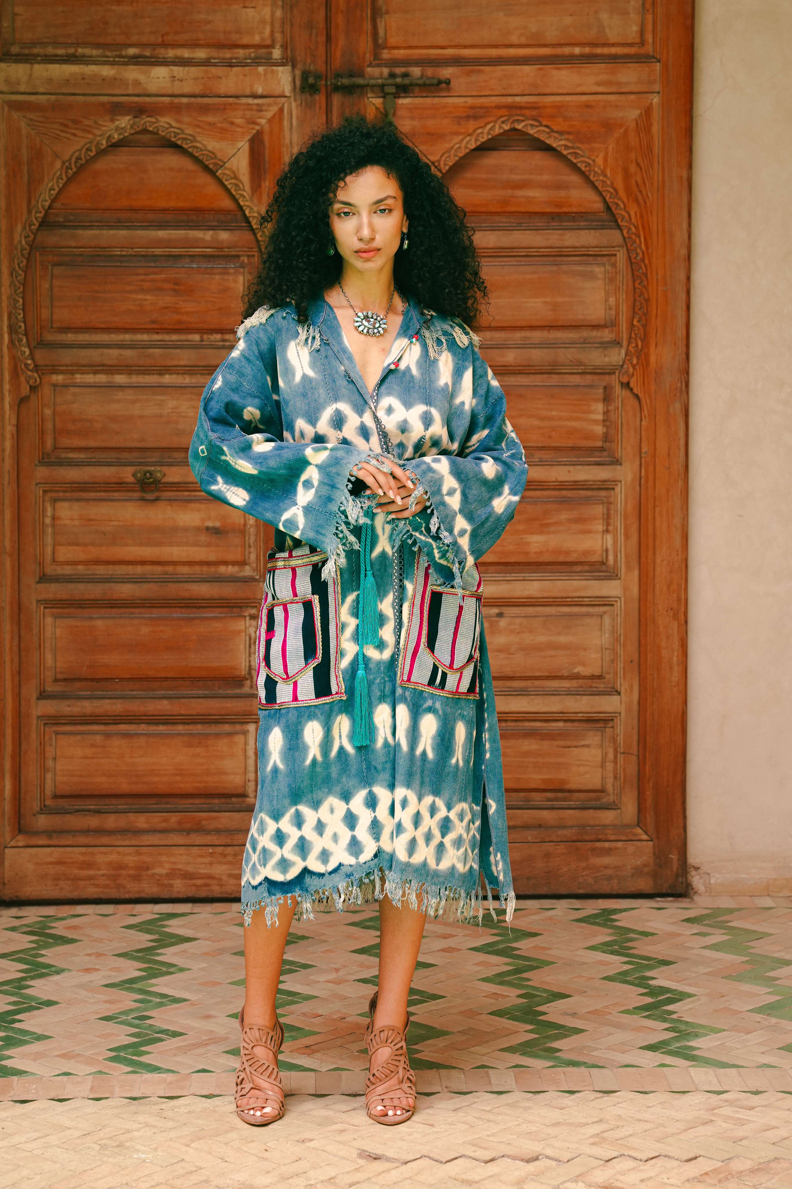 Inspired by the endless, cloud-streaked skies over the Moroccan desert, this wrap coat is a dream in indigo. It captures the soulful beauty of the ancient art of resist-dyeing, where patterns emerge like shifting clouds against a deep blue canvas. Handcrafted in Morocco, every detail—from the frayed edges to the intricate pockets—tells a story of time, artistry, and the beauty of imperfection. It’s a soulful garment for the free-spirited collector.