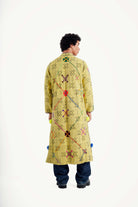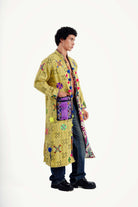 The 'Ochre Oasis' duster is an unforgettable statement of pure joy. Its sunny color and playful details are an instant mood-lifter. Wear it open and flowing, or use the discreet hook and eye closure for a more composed silhouette. It’s best showcased by layering it over dark denim and a simple t-shirt. This gender-neutral piece is perfect for festivals, creative events, or any day you want to radiate happiness and embody the spirit of a true original.