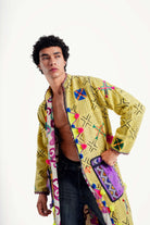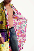 Step into your own personal oasis with this joyfully brilliant duster, a sun-drenched canvas of ochre yellow and a playful explosion of color and texture.