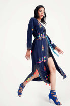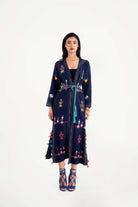Completely out of the blue, this stunning duster coat combines timeless navy elegance with an unexpected explosion of joyful, artistic embroidery.