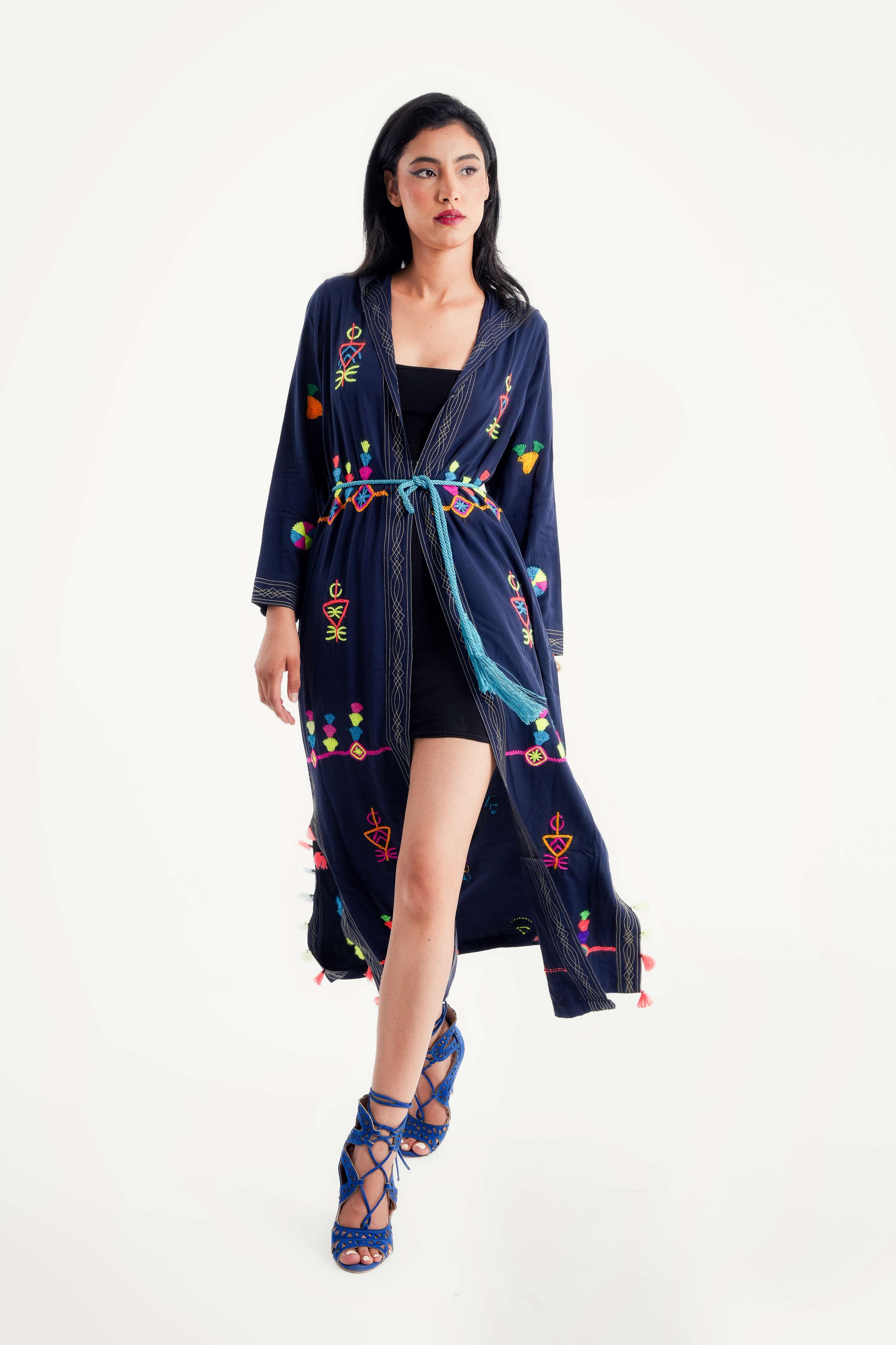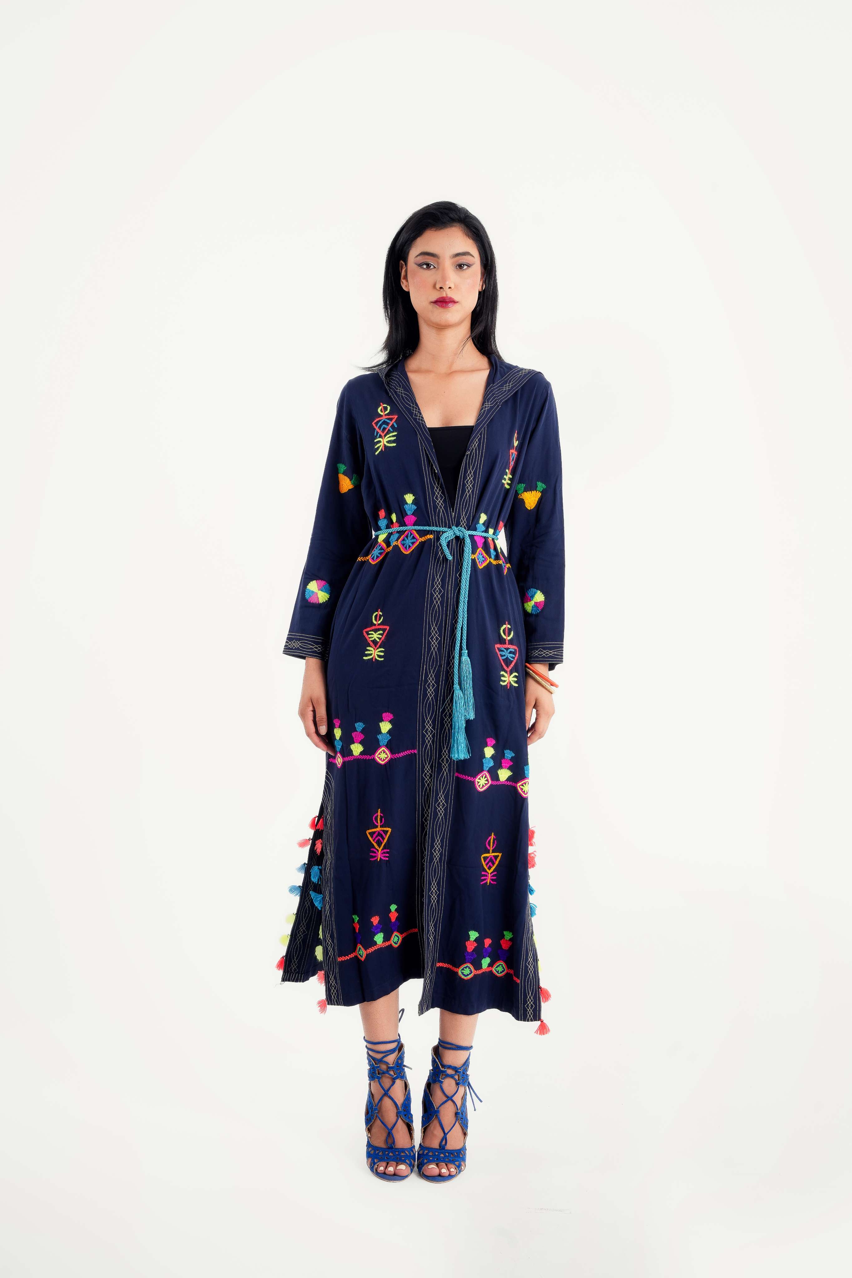 Inspired by the deep, infinite blue of a Moroccan night sky suddenly illuminated by a festival of lights, this duster is a study in beautiful surprises. Our artisans in Morocco started with a canvas of classic, sophisticated navy blue. Then, they brought it to life with an unexpected burst of creative energy, scattering vibrant, hand-embroidered symbols and playful tassels like joyful constellations. This coat is a reminder that beauty often comes from the unexpected, made for the woman who carries a secret spark of creativity.