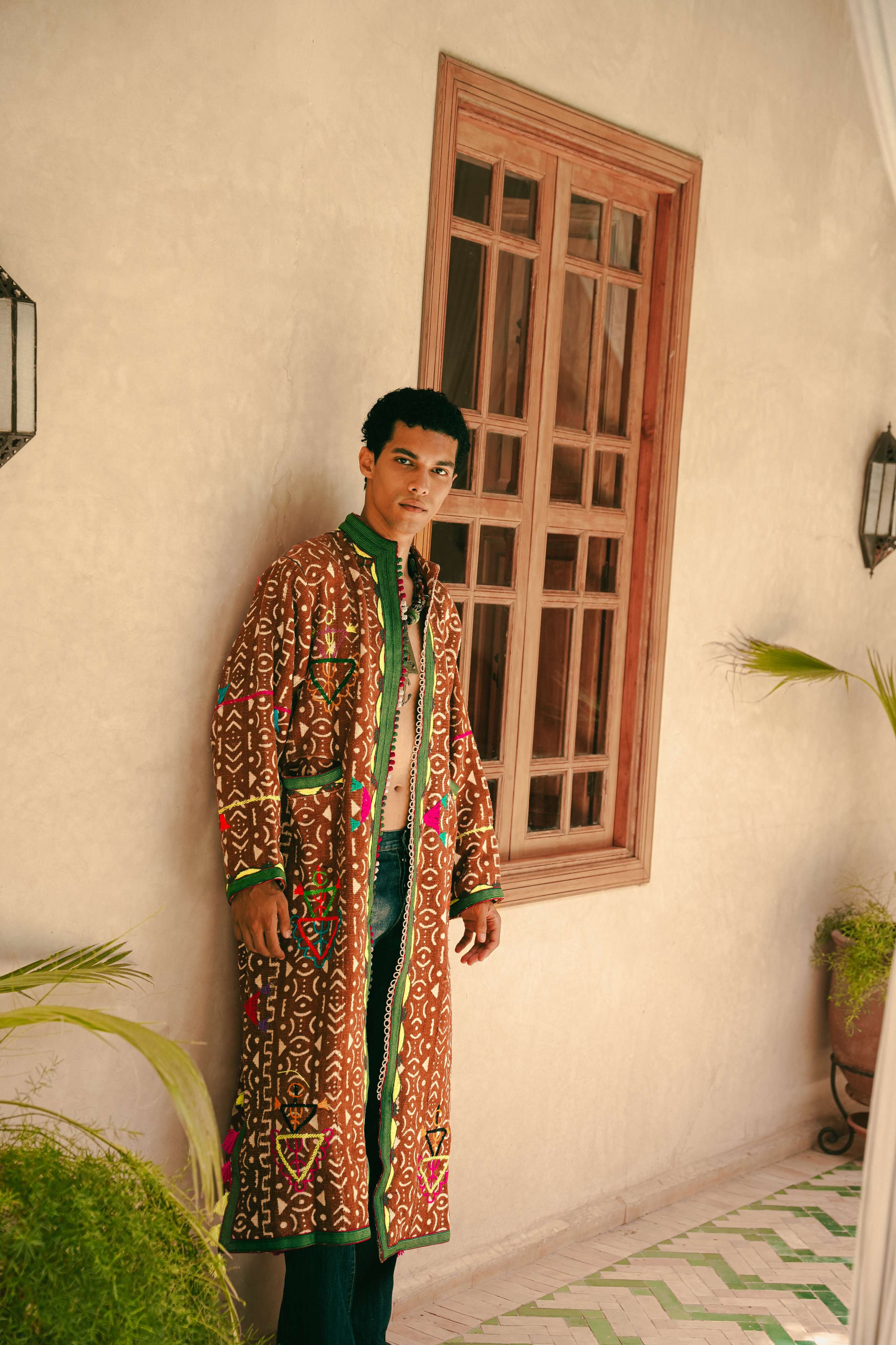 Inspired by the shimmering heat and shifting light of the Marrakesh desert, this duster is a tribute to the earth's natural artistry. It evokes the rich, baked-clay color of the landscape and the intricate, symbolic language of Berber textiles. Handcrafted in Morocco, its unique pattern and vibrant embroidery tell a story of ancient traditions and timeless, nomadic style. It’s a soulful garment for the creative spirit who finds poetry in the heat.