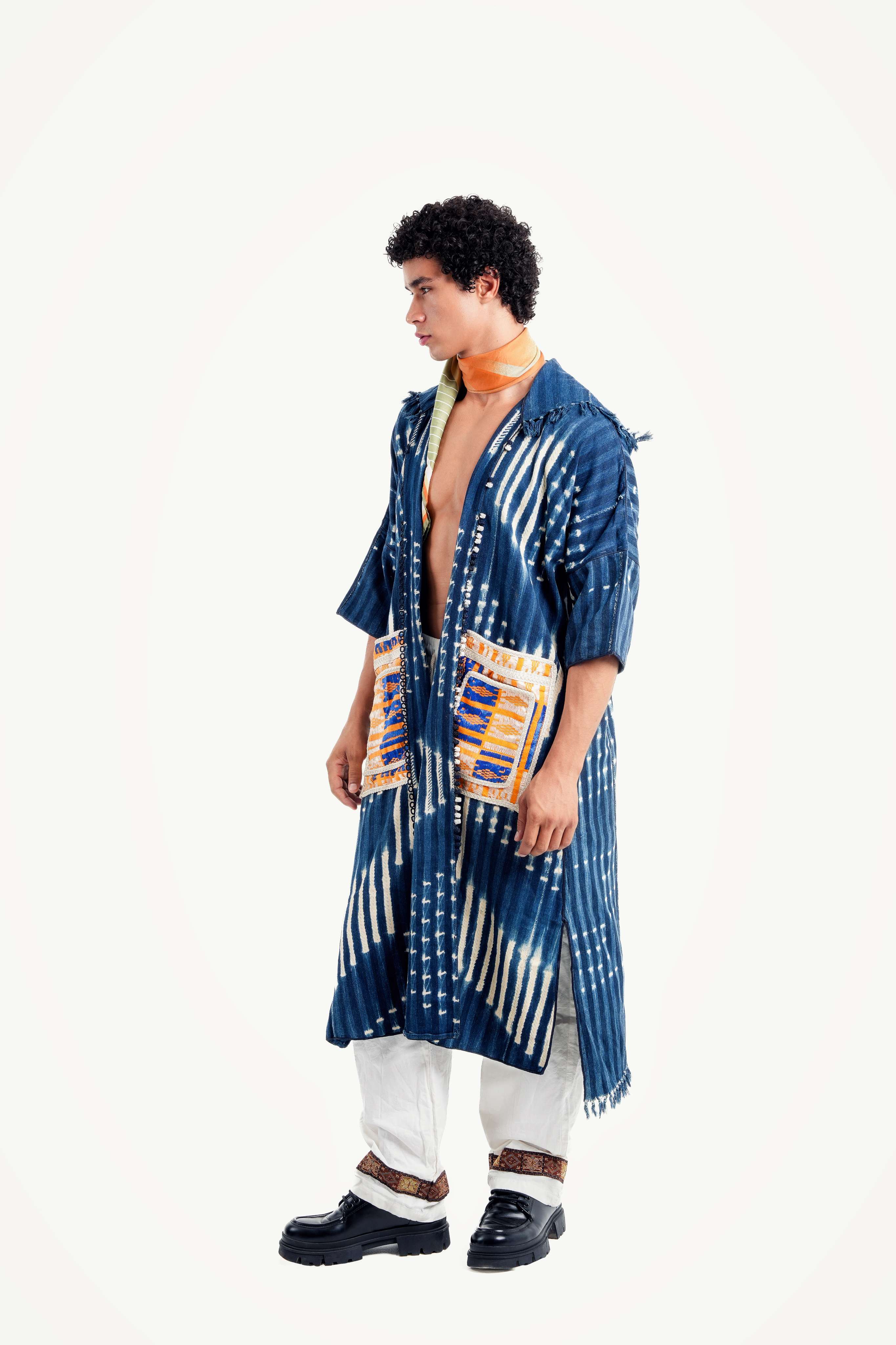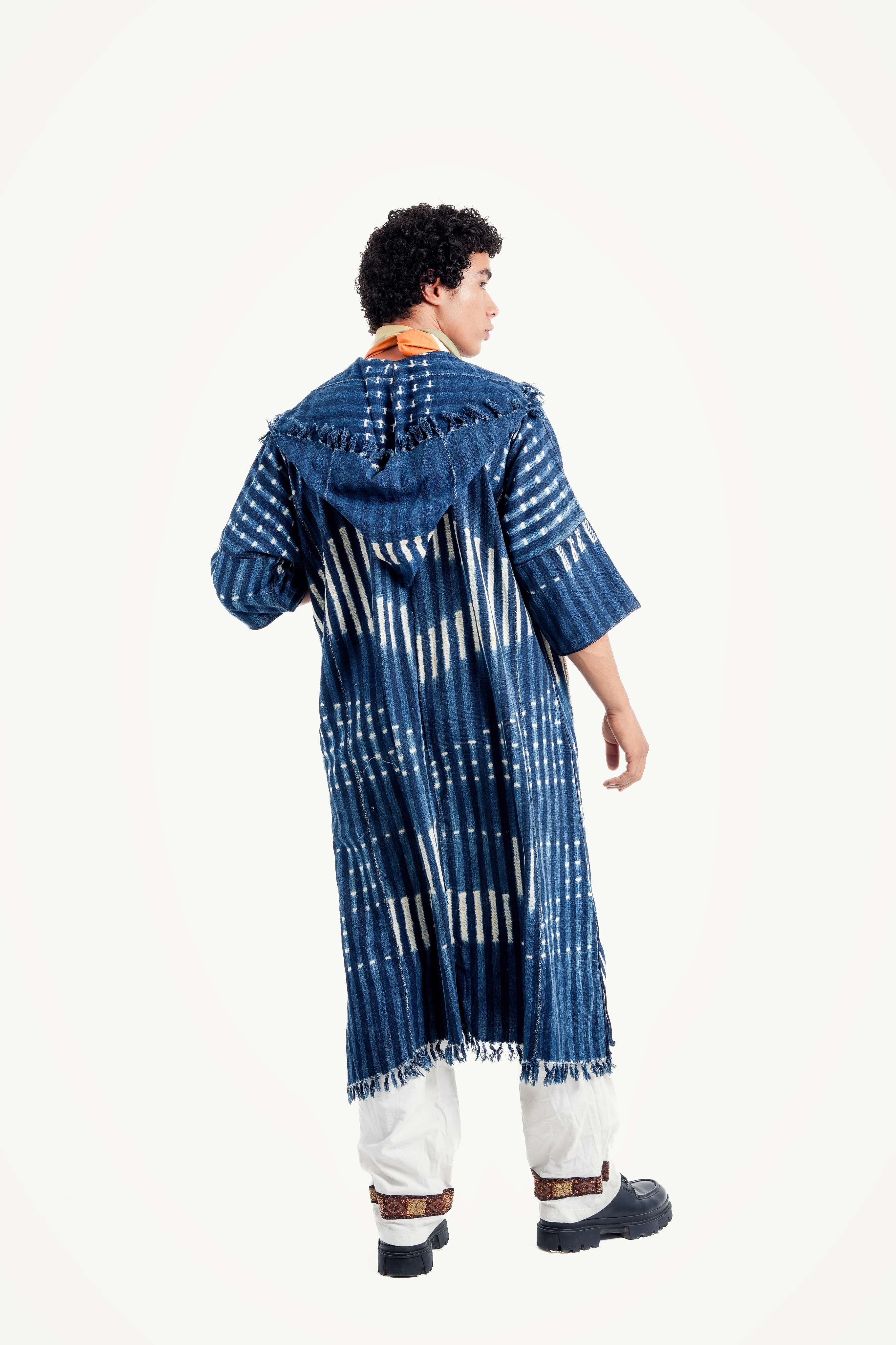 Inspired by the deep, magical blue of indigo and the powerful symbols of Berber craft, this poncho is a wearable collector's item. It feels like a treasured garment passed down through generations, each frayed edge and hand-dyed mark telling a story of a life lived under the vast Sahara sky. Handcrafted in Morocco, this is not just a piece of clothing, but a piece of history, reimagined for the modern wanderer with a poetic soul.
