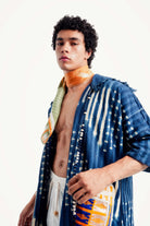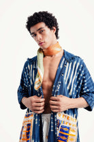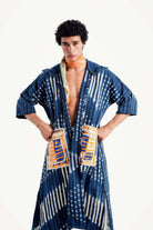 - Artisanal Indigo Tie-Dye: Crafted from a sturdy cotton textile that has been hand-dyed using traditional resist-dyeing techniques, creating a unique, watery stripe and dot pattern in a rich, deep indigo.