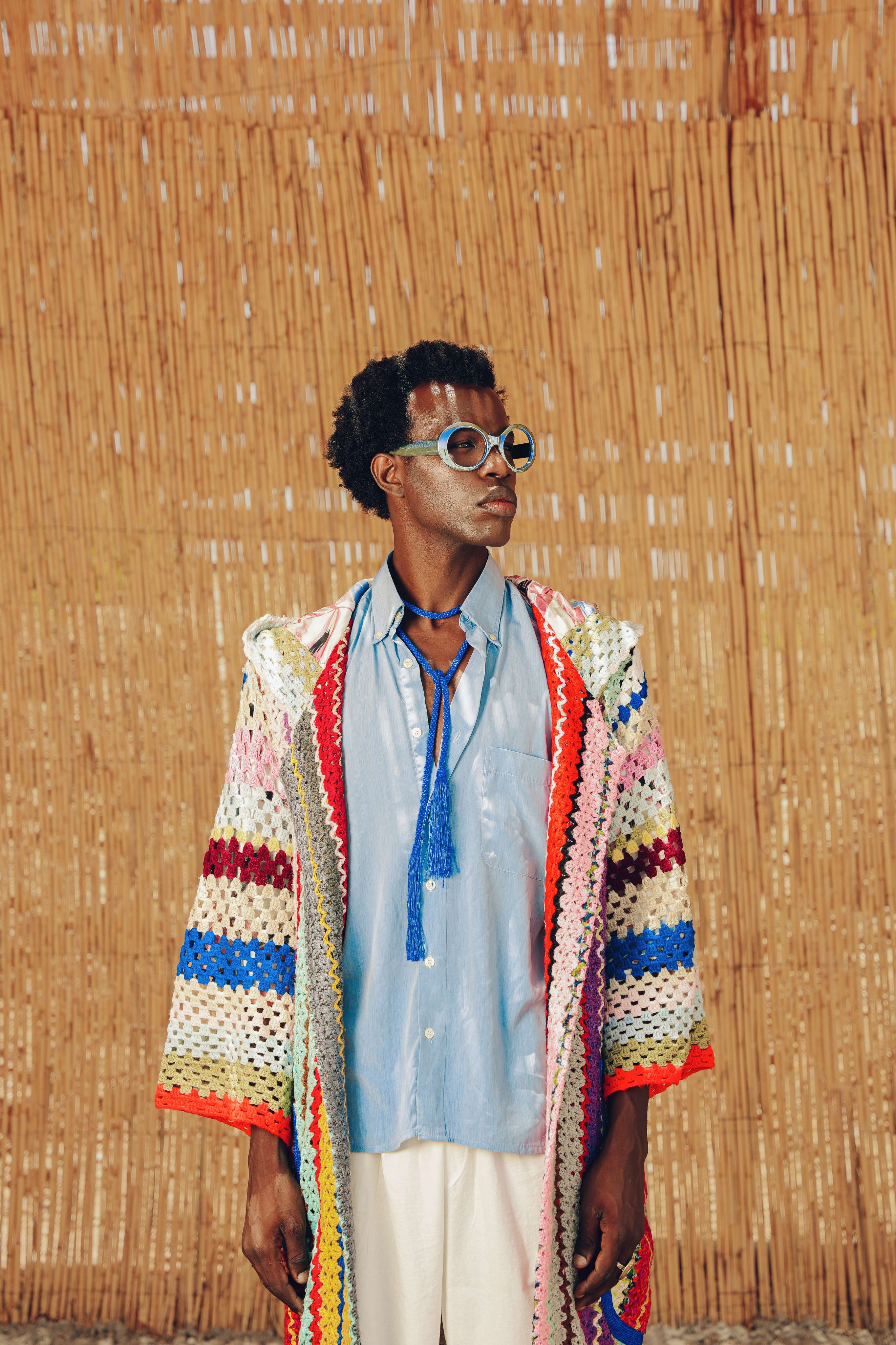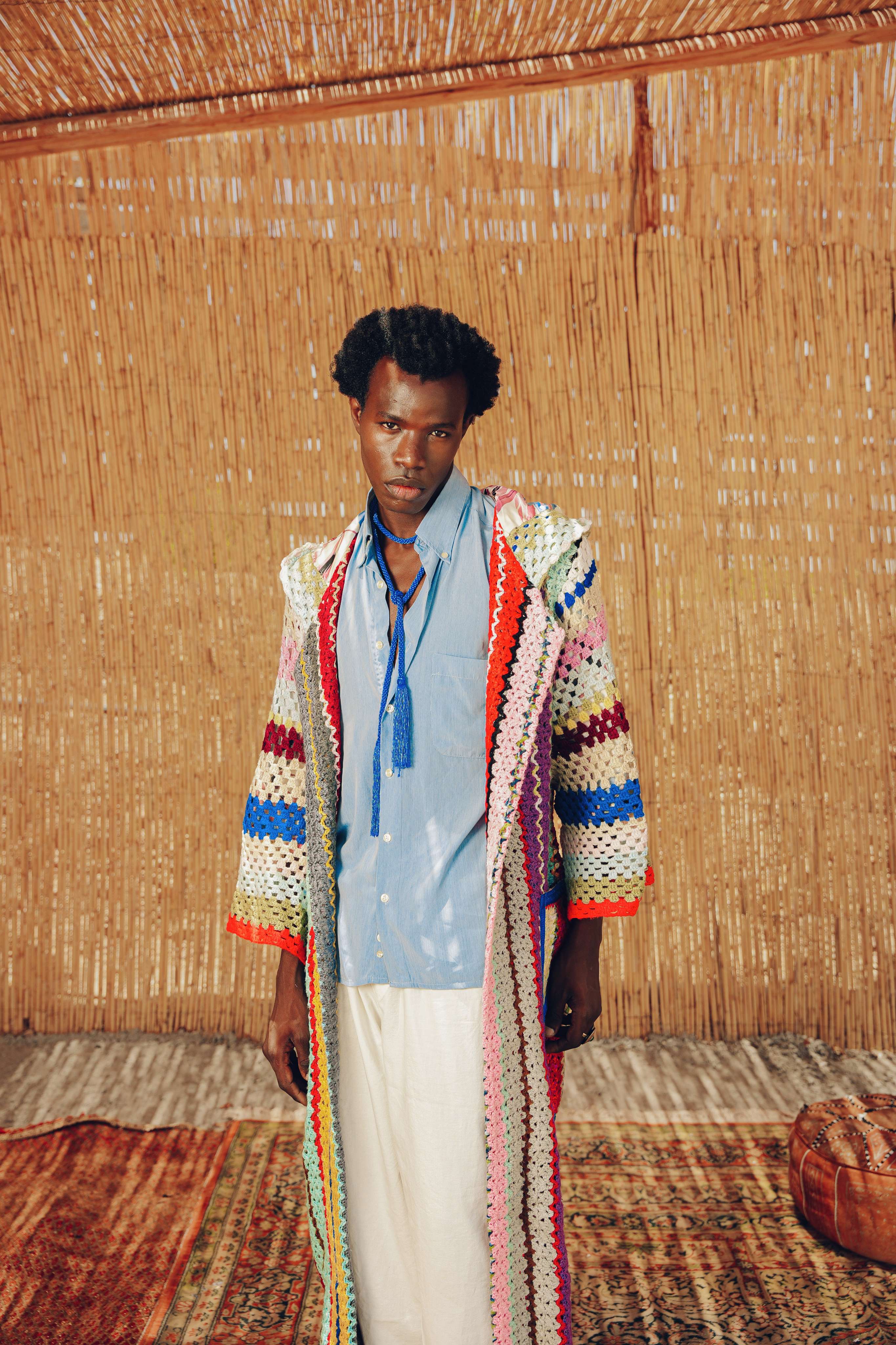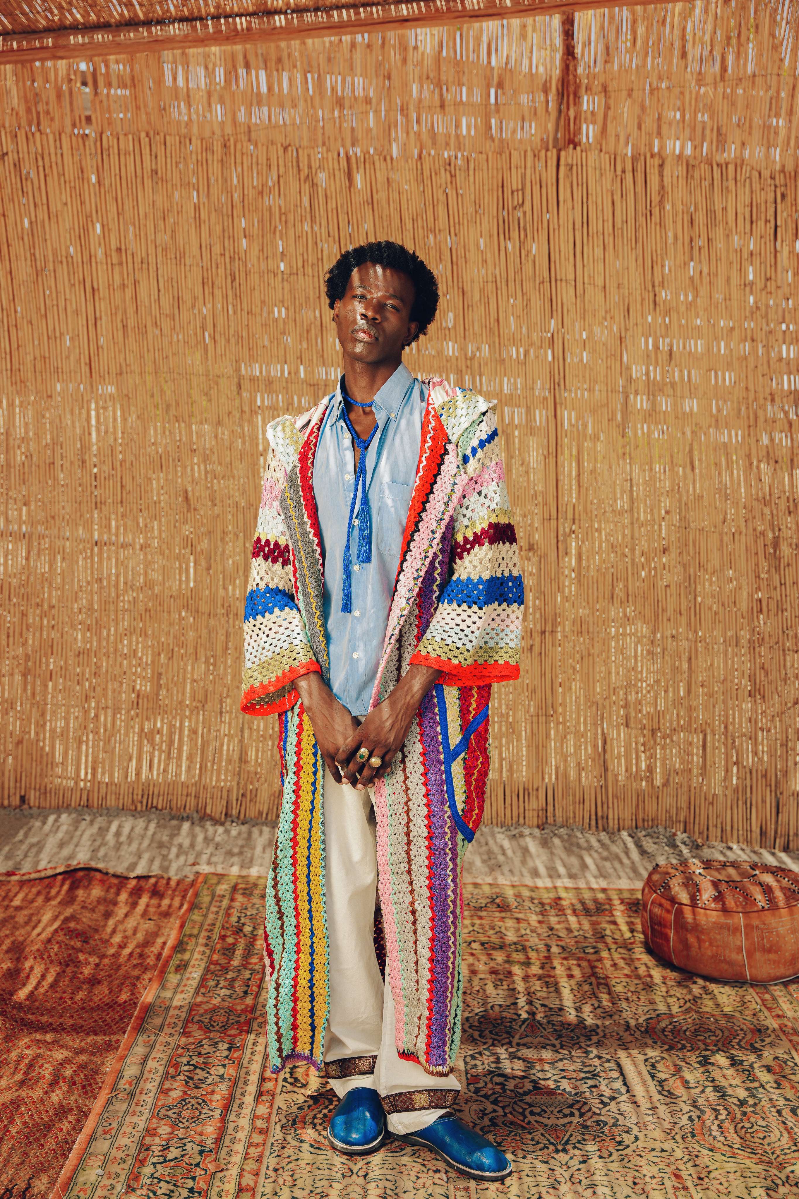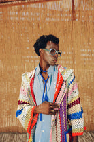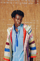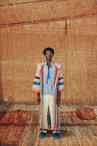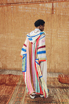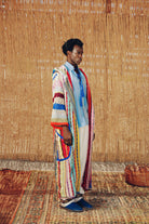 This stunning piece is inspired by the secret courtyard gardens of Marrakech, where countless flowers burst into life in the spring sun. Each vertical stripe of chunky, hand-crocheted yarn is like a different row of blossoms—from soft rose to vibrant marigold and cool sky blue—creating a harmonious and cheerful rainbow. Handcrafted in Morocco with incredible artistry, this coat is a piece of pure joy for the free-spirited wanderer who carries their own sunshine.