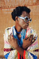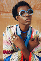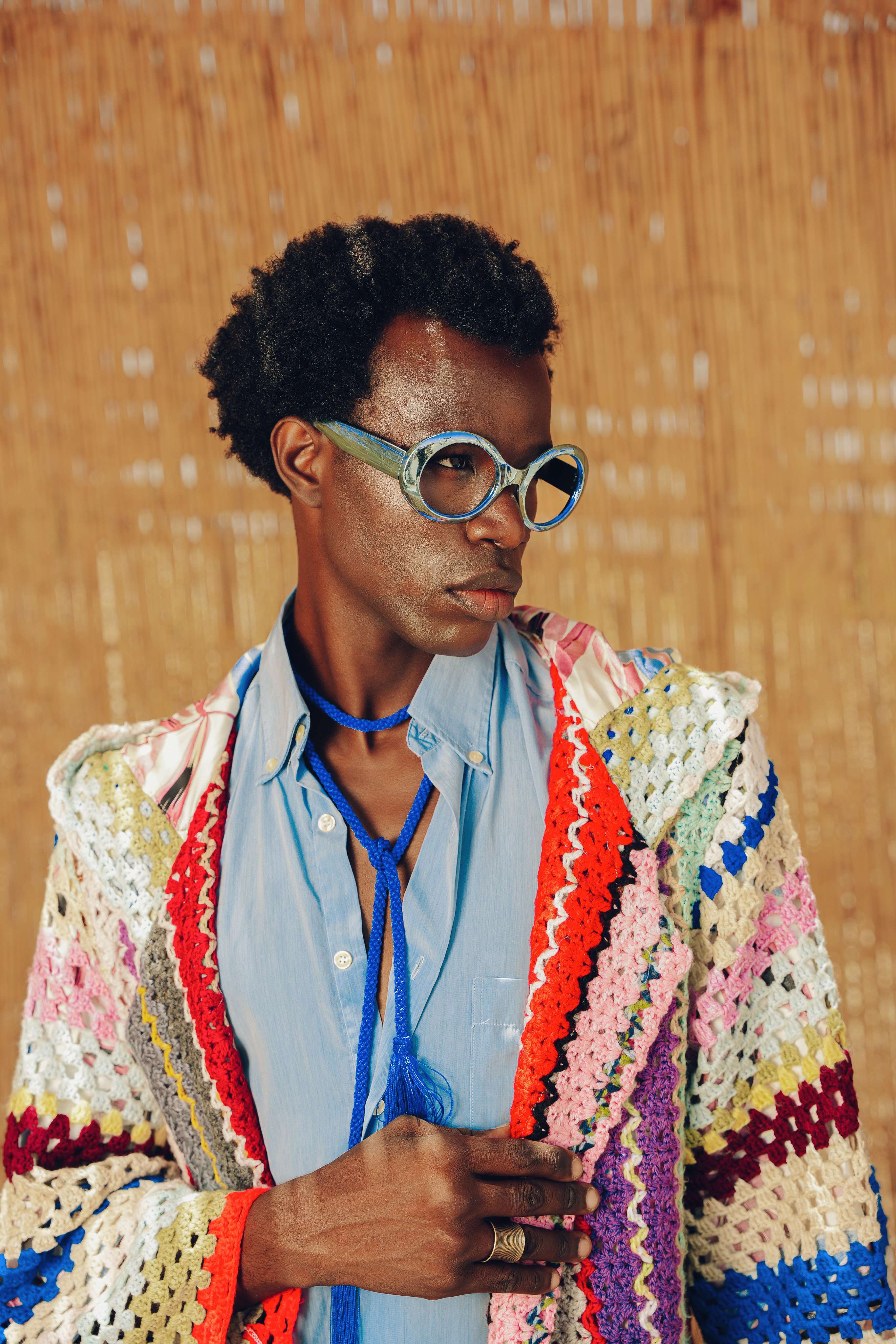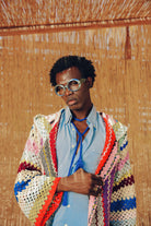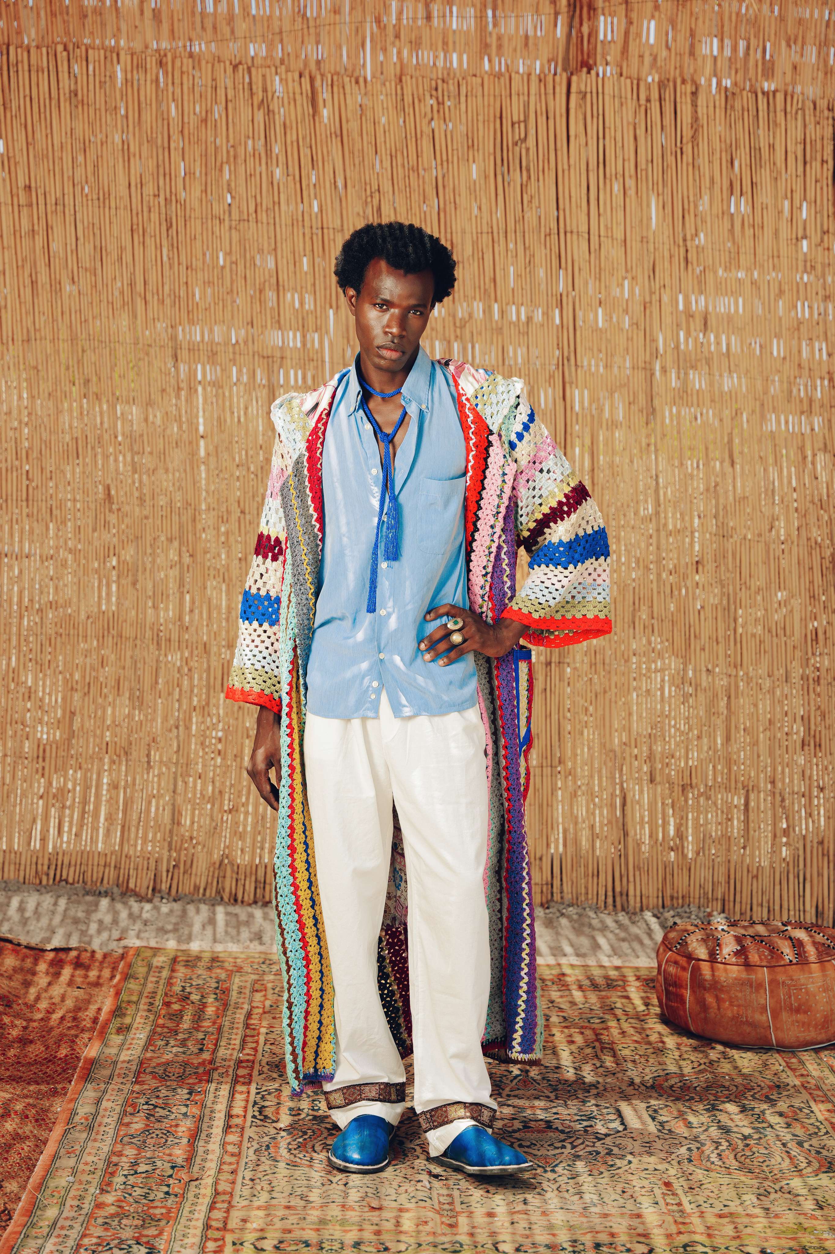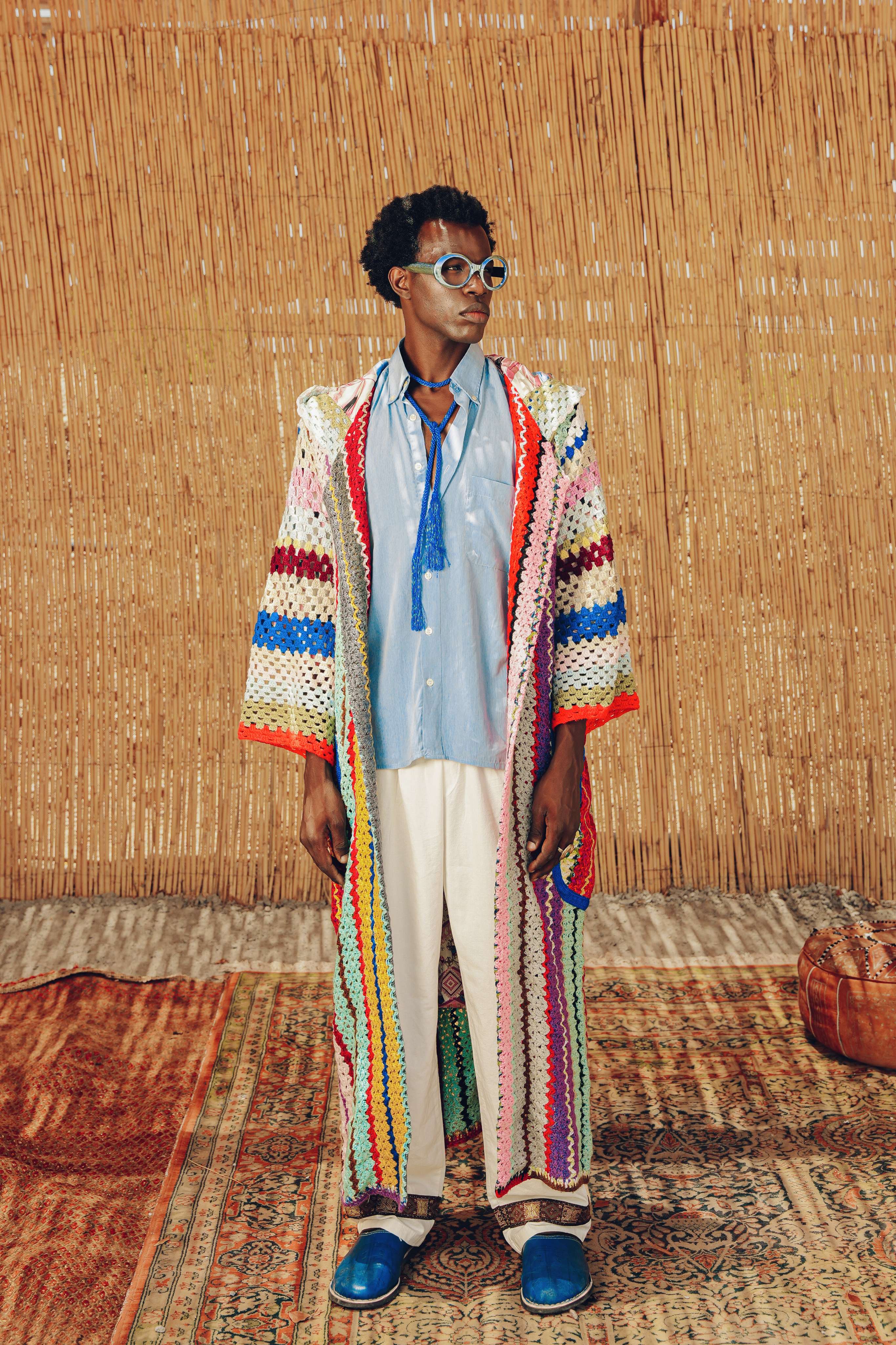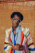 This stunning piece is inspired by the secret courtyard gardens of Marrakech, where countless flowers burst into life in the spring sun. Each vertical stripe of chunky, hand-crocheted yarn is like a different row of blossoms—from soft rose to vibrant marigold and cool sky blue—creating a harmonious and cheerful rainbow. Handcrafted in Morocco with incredible artistry, this coat is a piece of pure joy for the free-spirited wanderer who carries their own sunshine.