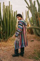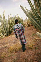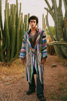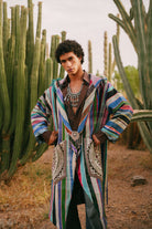 Inspired by the surprising spectrum of colors found in a Moroccan cactus grove, where vibrant flowers and deep purple fruit bloom against a backdrop of resilient green. The Cactus Grove Trench is a celebration of this tenacious beauty. Handcrafted in Morocco from a substantial, hand-loomed blanket weave, its joyful stripes are a painterly ode to the desert's flora. It’s a soulful, artistic piece for the modern nomad with a wanderer's heart.