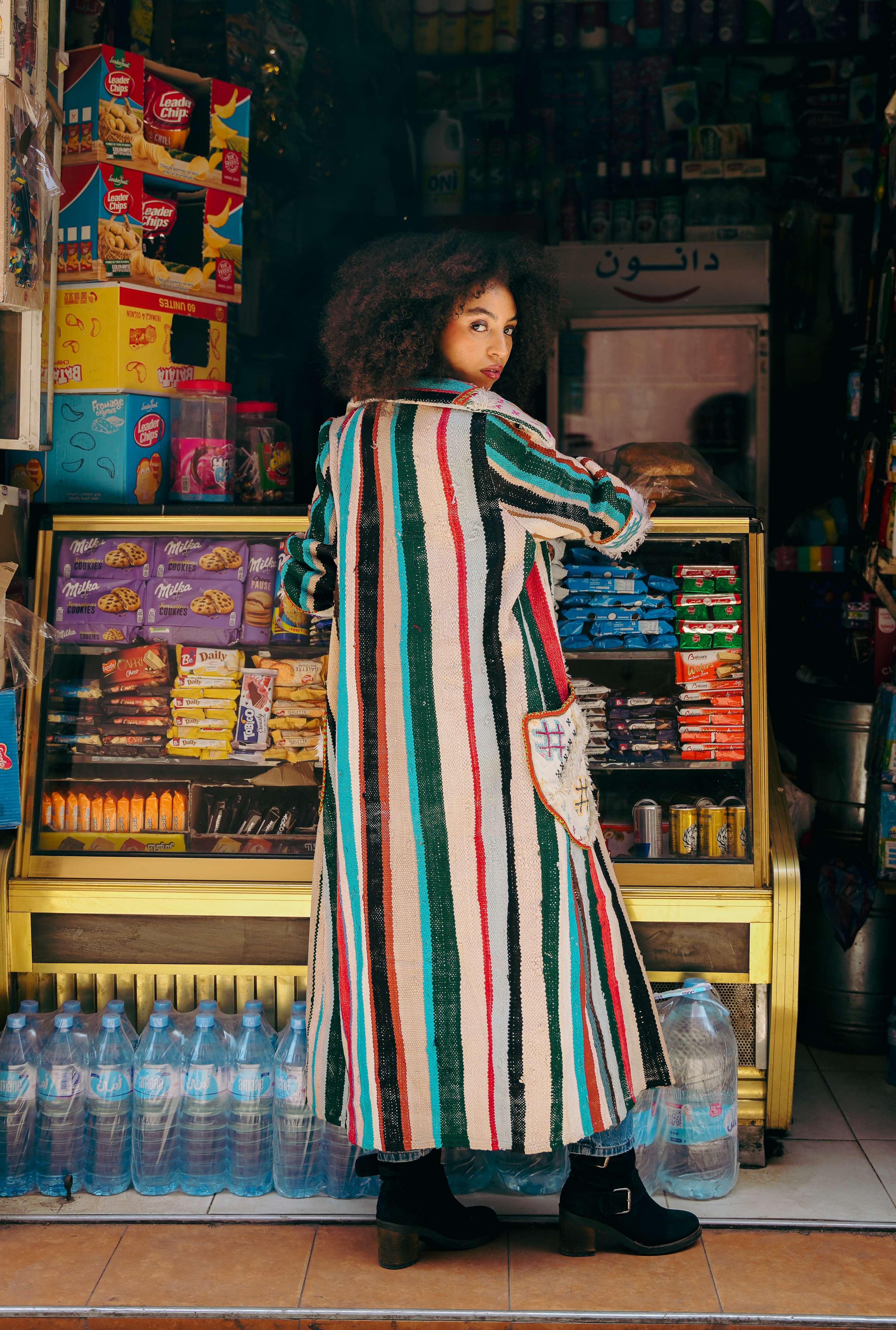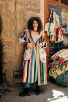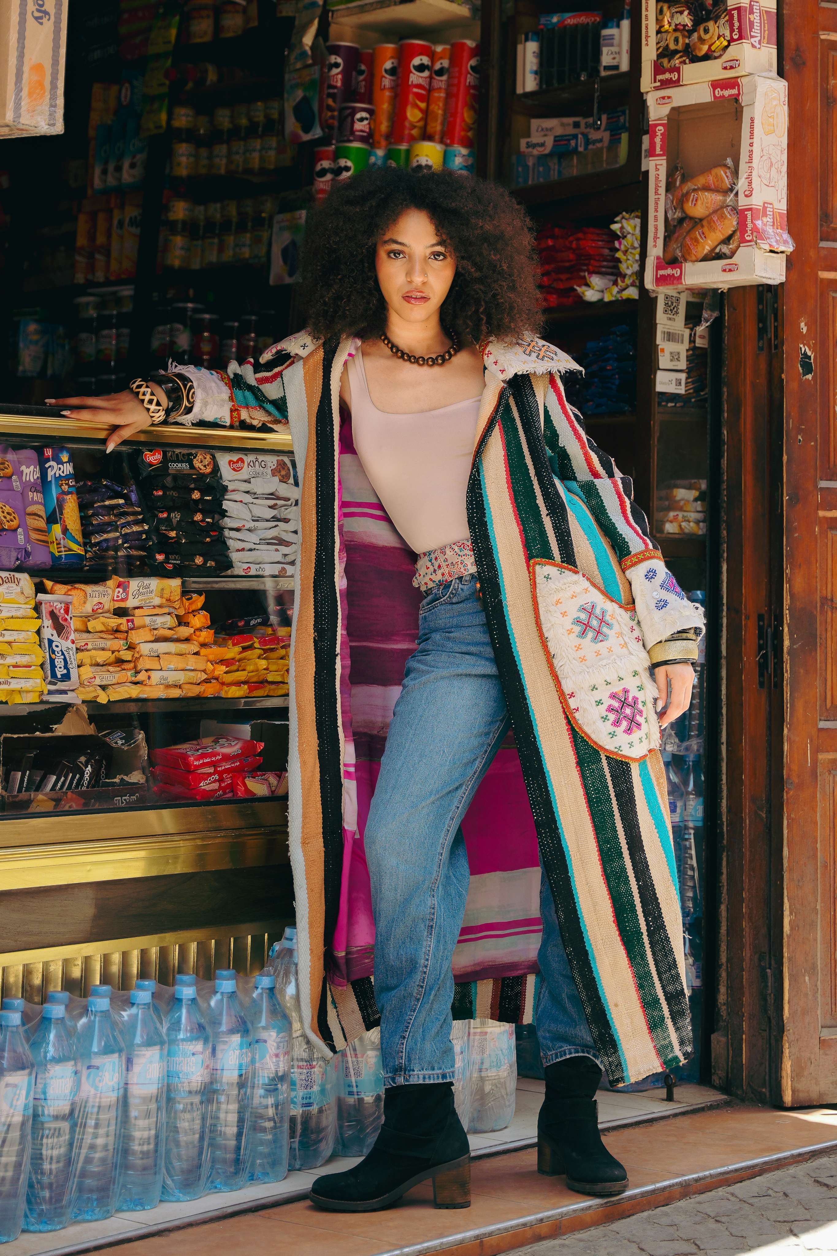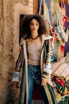 A coat born from the spirit of adventure, the Camel Caravan Trench is for the true nomad at heart. Its rustic, heavy stripes are inspired by the hand-loomed Berber blankets that have traversed the desert for centuries, offering warmth and protection on long caravan journeys. Each panel tells a story of vast dunes and endless skies, while the heavily embellished pockets and cuffs are like treasure pouches, adorned with symbols and colors collected from oasis to oasis. Handcrafted in Morocco, this is a grounding, powerful piece that carries the wisdom of the desert.