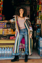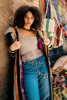This powerful, gender-neutral coat layers beautifully over simple basics, allowing its incredible artistry to take center stage. As seen in our photos, it pairs perfectly with a neutral top and your favorite pair of classic blue jeans. Add a statement belt to your jeans and leave the coat open to showcase its flowing, nomadic silhouette.