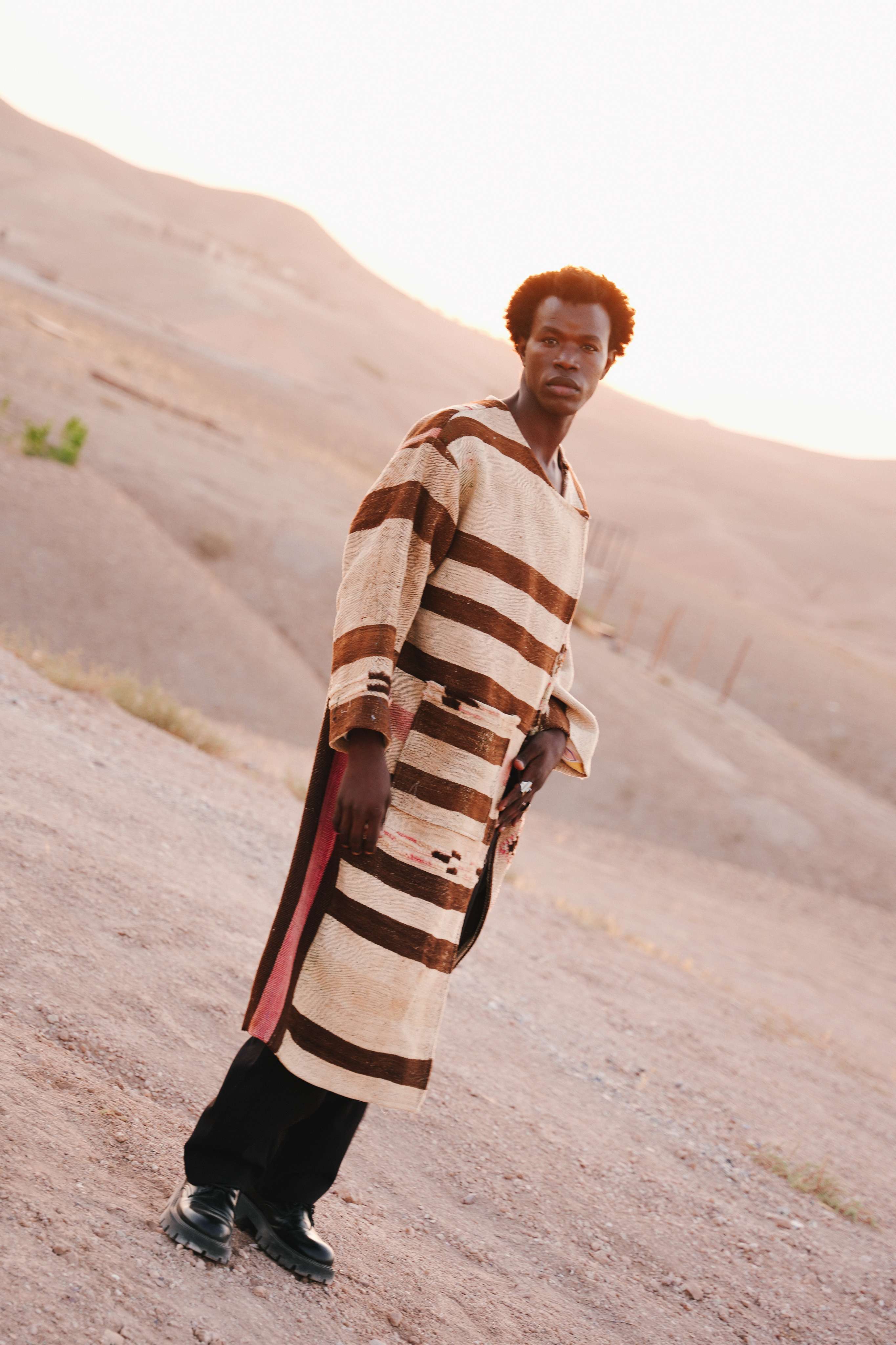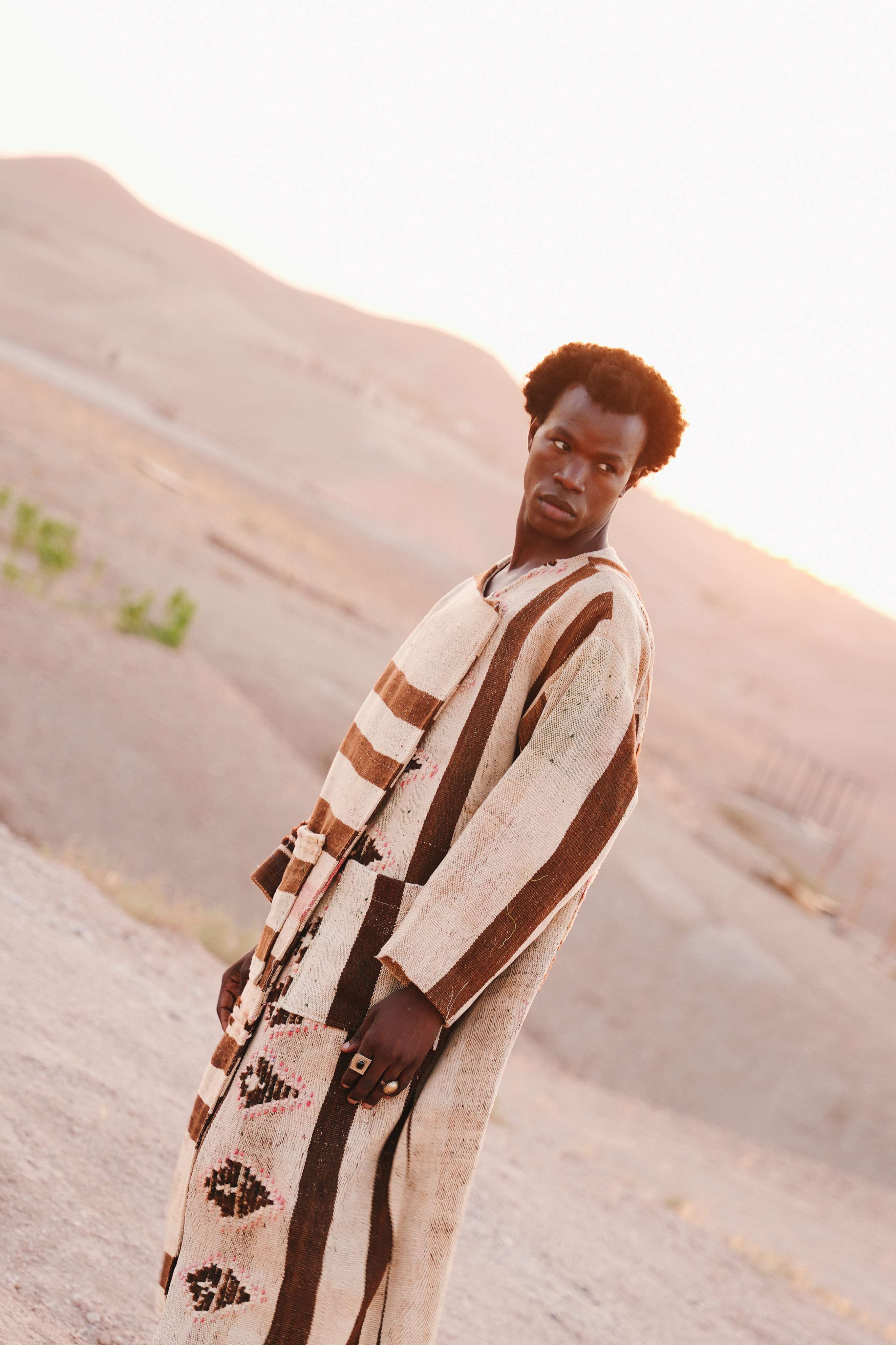 Breathe in the rich, warm air of a Marrakech spice souk, where mountains of cinnamon, saffron, and clove create a tapestry of scent and color. This coat is inspired by that sensory journey. Handcrafted in Morocco from a substantial, rustic textile, its earthy stripes and intricate patterns echo the textures of hand-woven sacks and the raw beauty of the spices themselves. It’s a garment that feels grounded and soulful, a piece of wearable comfort for the worldly traveler.