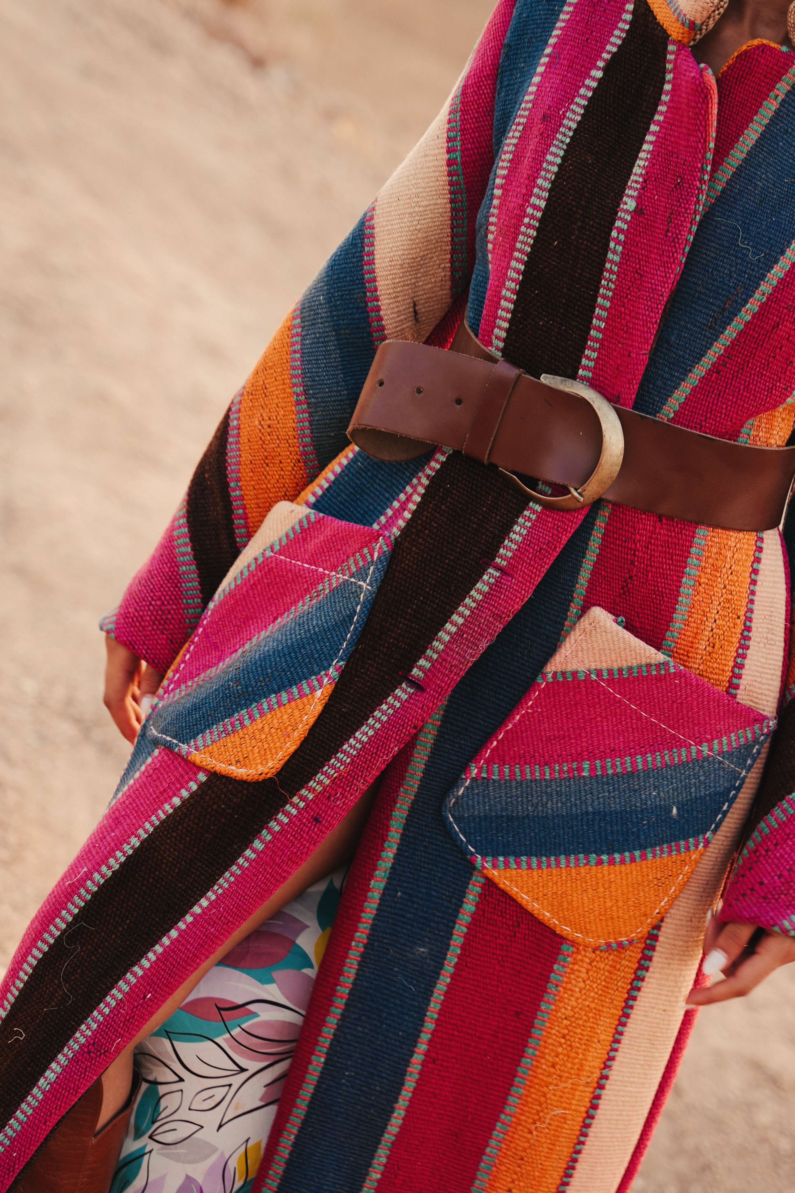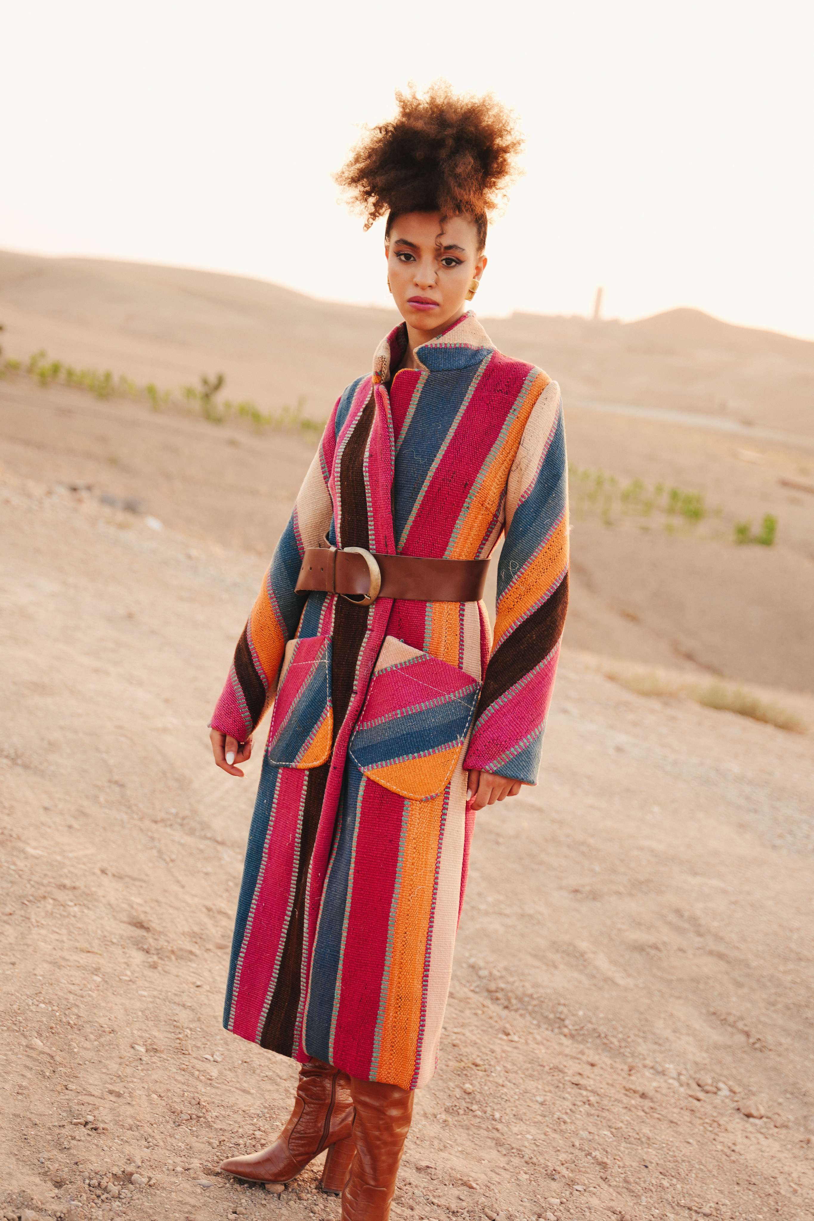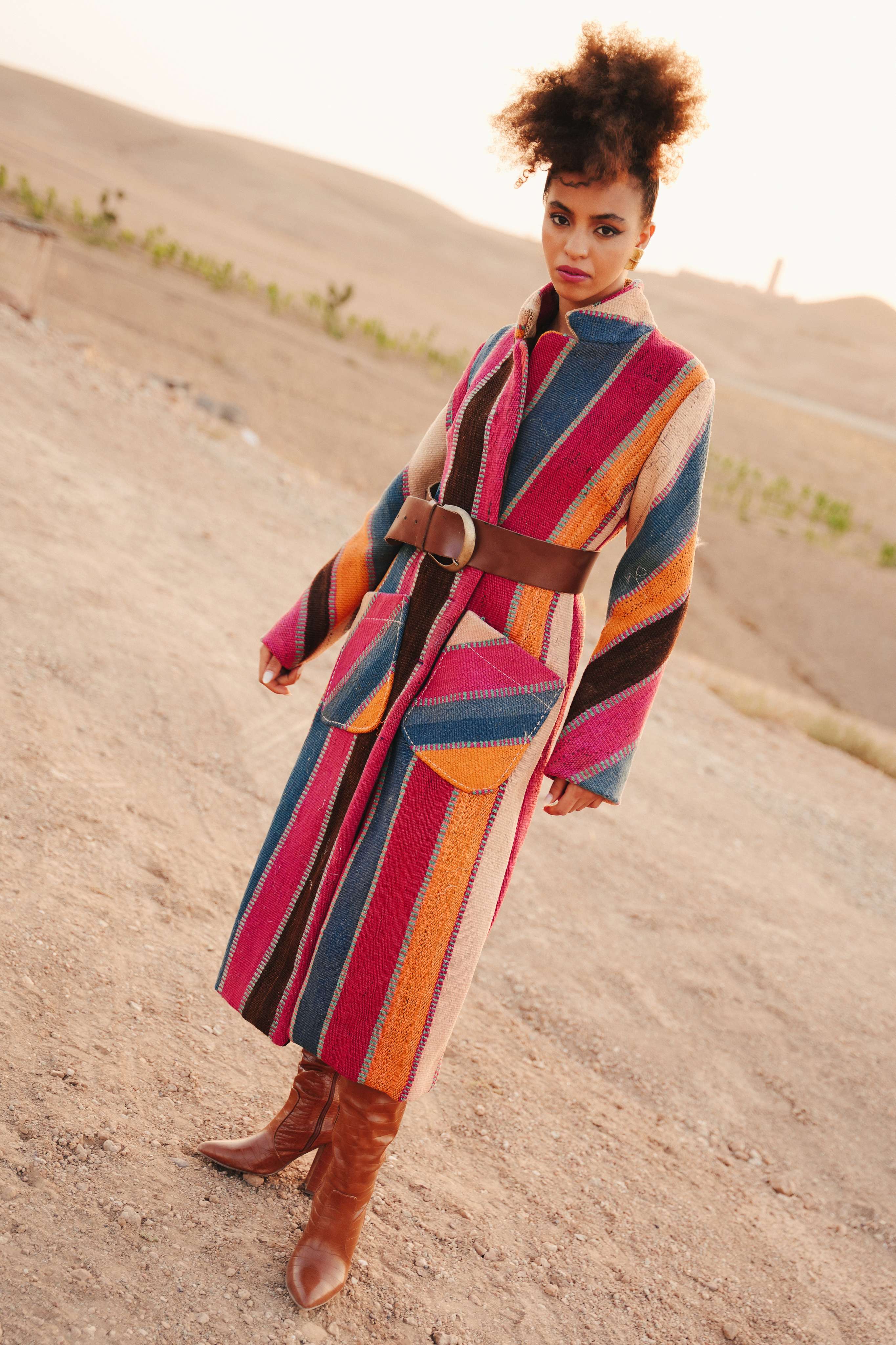 Find inspiration in the final moments of daylight, when the sun casts a warm, rosy glow that softens the rugged texture of the city’s sandstone ramparts. This coat is an ode to that magical, fleeting light. Handcrafted in Morocco from a substantial, hand-loomed textile, its rich stripes of terracotta, ochre, and muted crimson echo the colors of a Moroccan sunset. It's a piece that radiates warmth and soulful artistry, designed for the woman who finds beauty in the quiet moments.