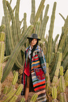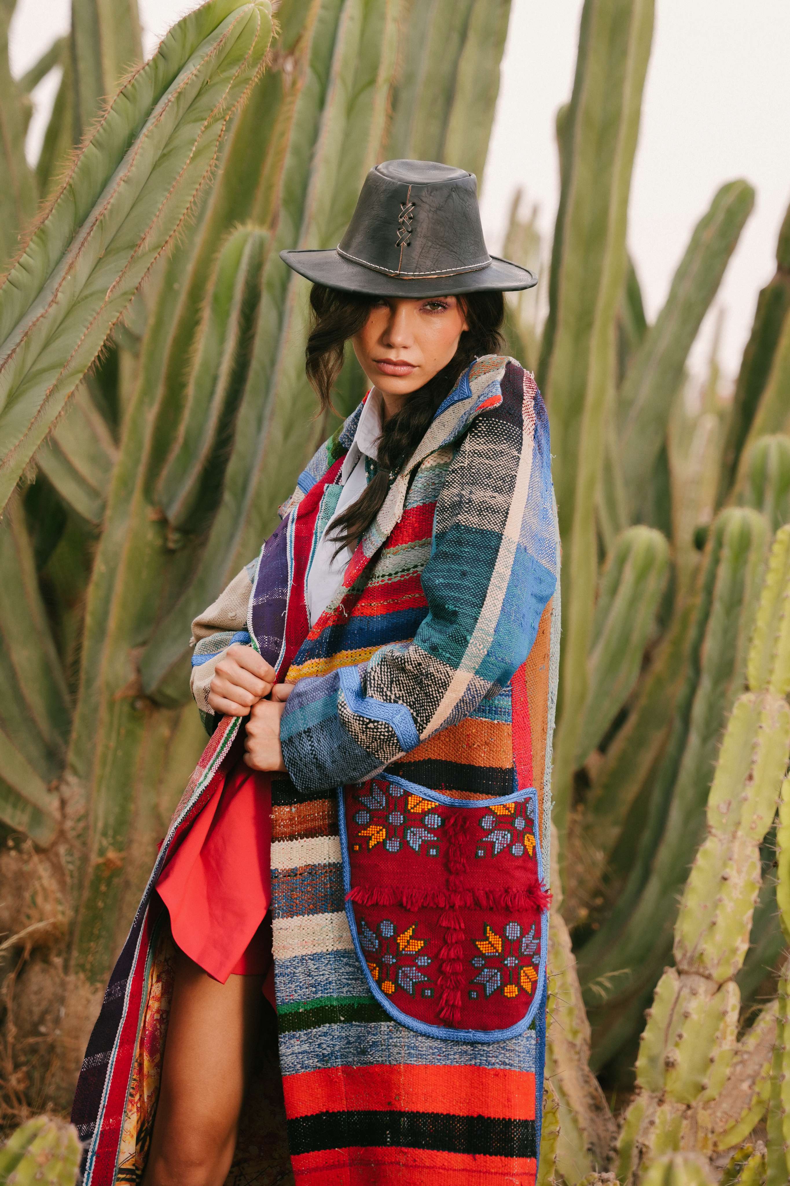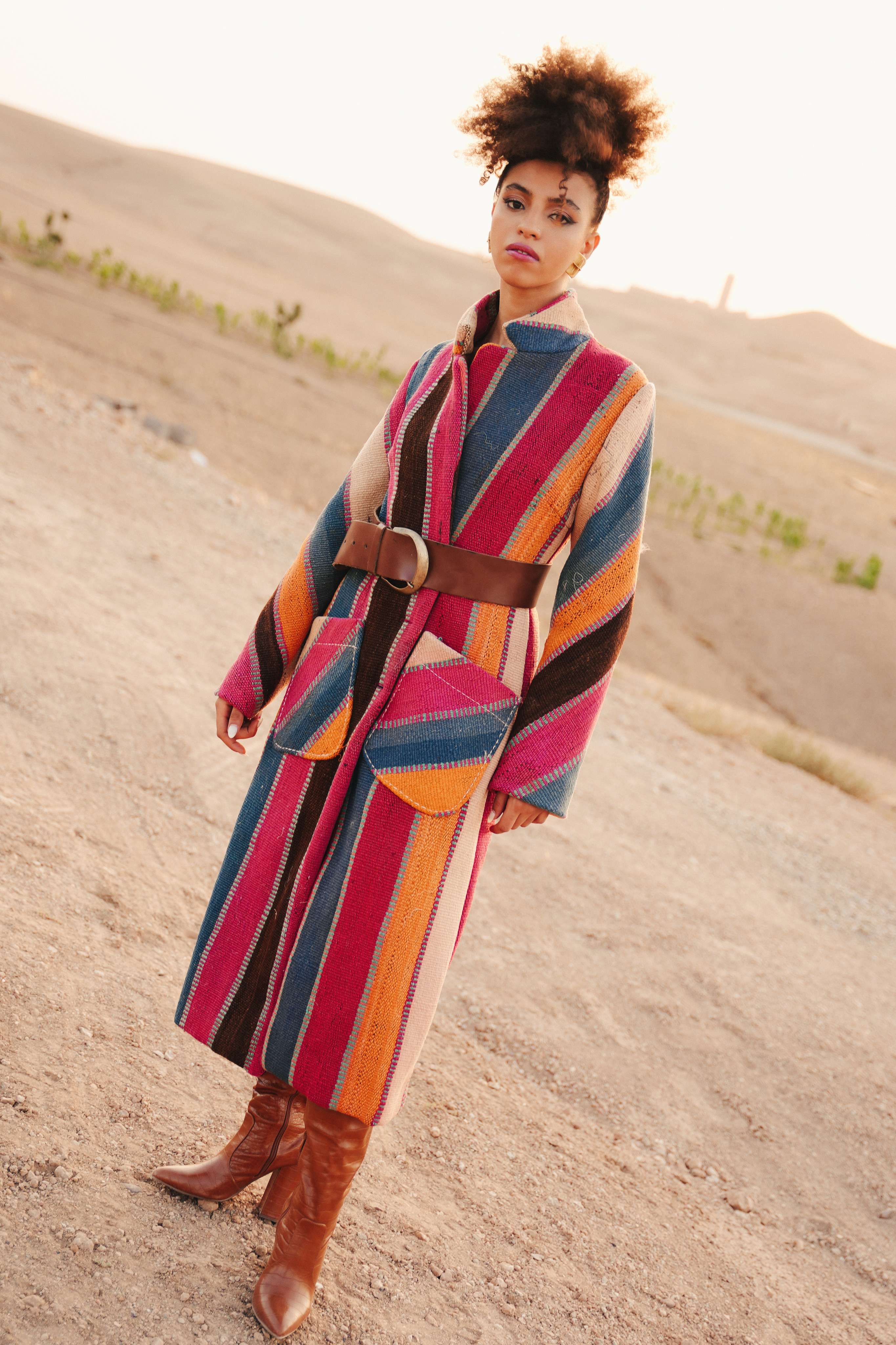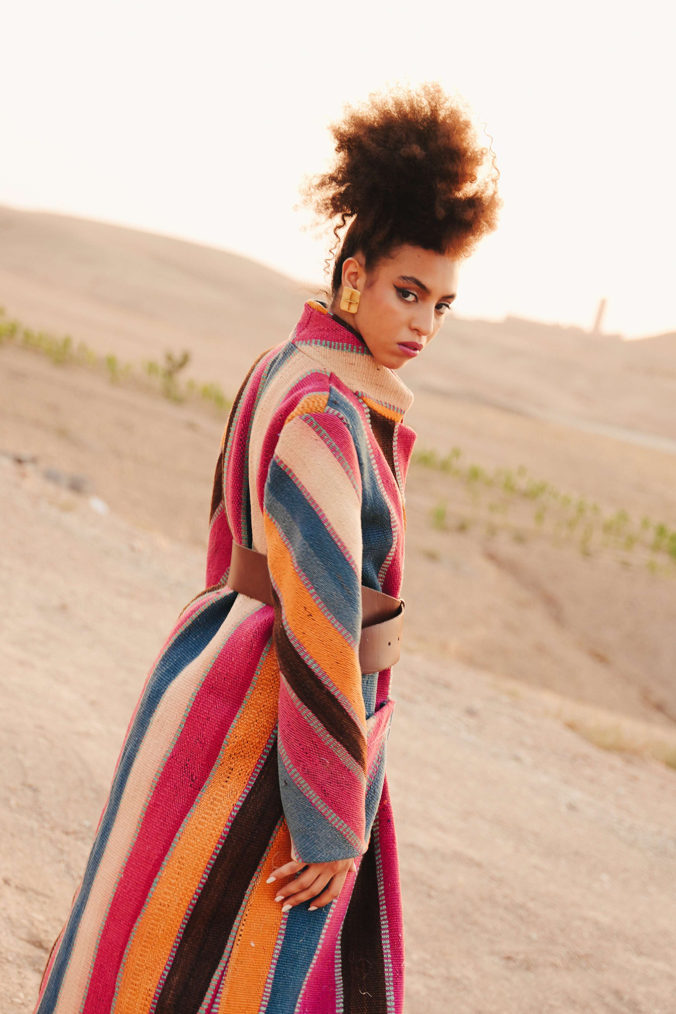 Find inspiration in the final moments of daylight, when the sun casts a warm, rosy glow that softens the rugged texture of the city’s sandstone ramparts. This coat is an ode to that magical, fleeting light. Handcrafted in Morocco from a substantial, hand-loomed textile, its rich stripes of terracotta, ochre, and muted crimson echo the colors of a Moroccan sunset. It's a piece that radiates warmth and soulful artistry, designed for the woman who finds beauty in the quiet moments.