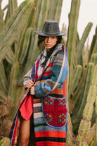 This is a piece of wearable art with endless styling potential. For a powerful, defined silhouette, add a wide leather belt at the waist as styled, to give shape and definition. For a more relaxed feel, wear it open over a simple dress or neutral separates, letting the magnificent colors and textures flow freely.