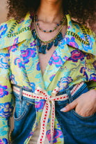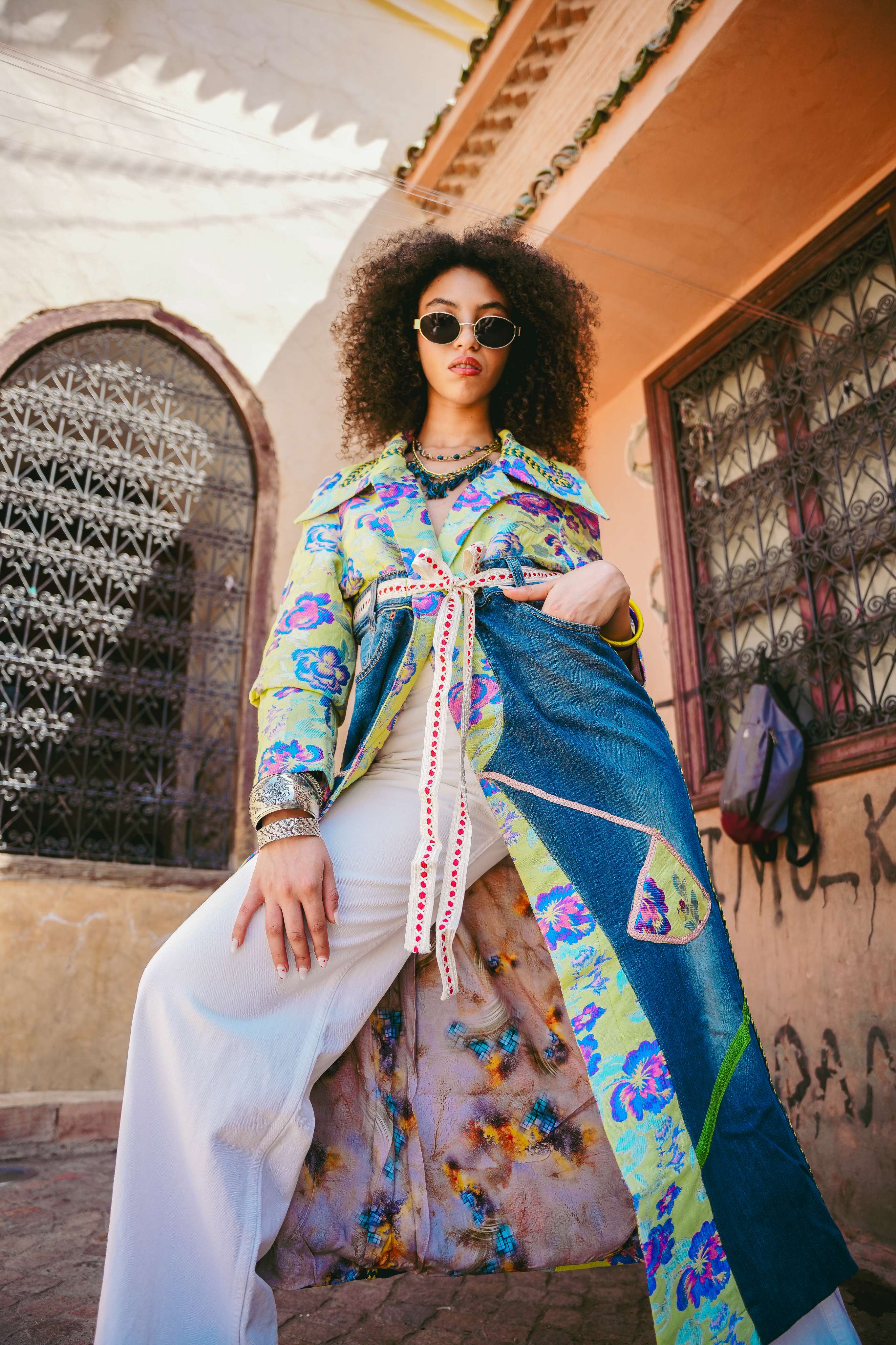 Ready for any party, from a garden soirée to a bustling street festival, this coat is a celebration of brilliant contradiction. It’s inspired by the creative energy of modern Marrakech, where luxe and utility collide in the most beautiful ways. The vibrant, floral jacquard evokes the lushness of a private riad garden, while panels of upcycled denim bring a cool, sustainable edge, echoing the resourcefulness of the city's famous souks. Handcrafted in Morocco, this is a masterpiece of fearless design for the free-spirited.