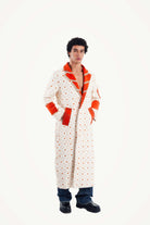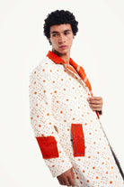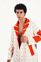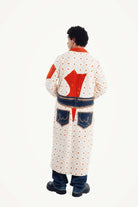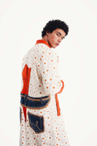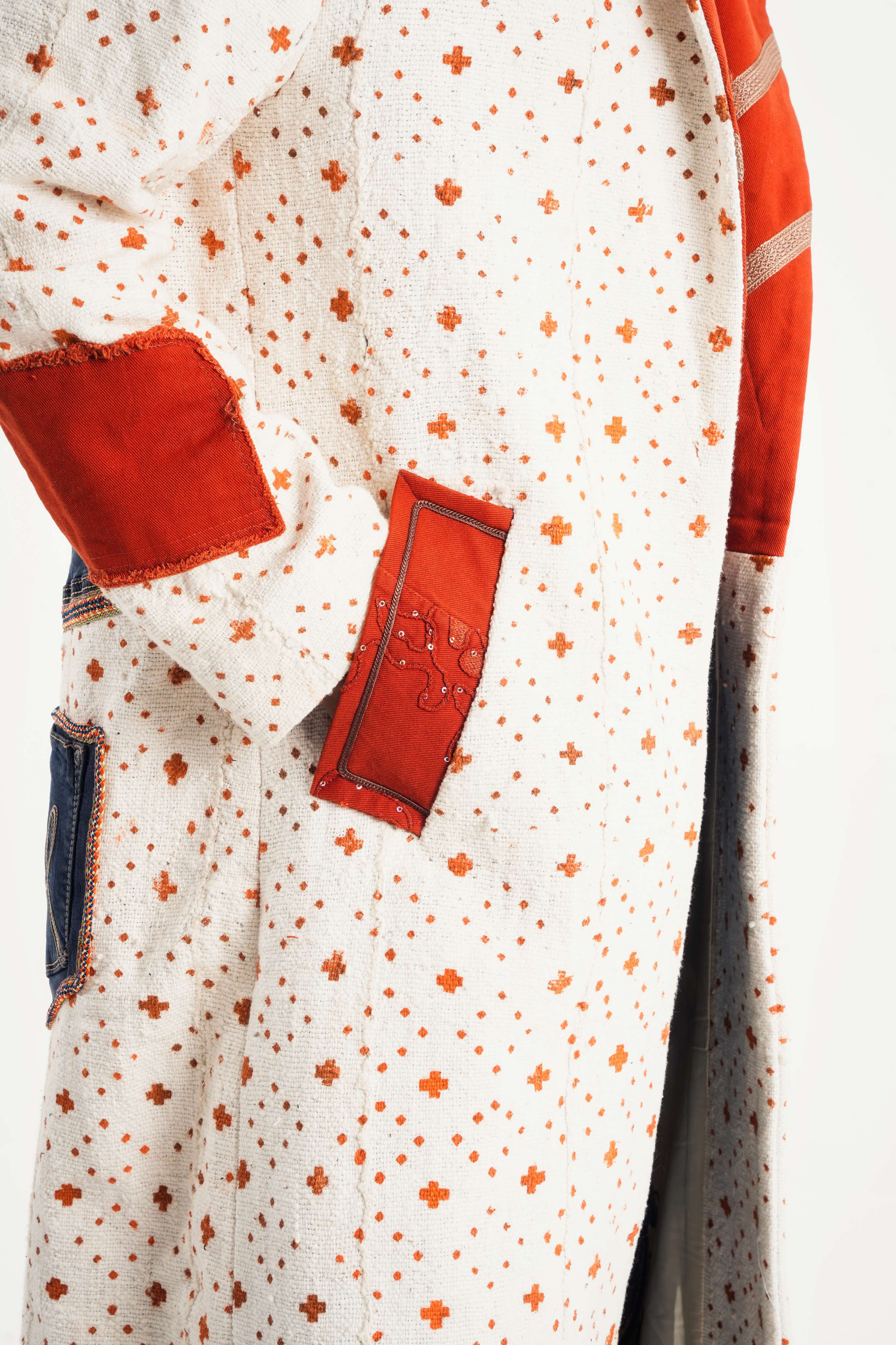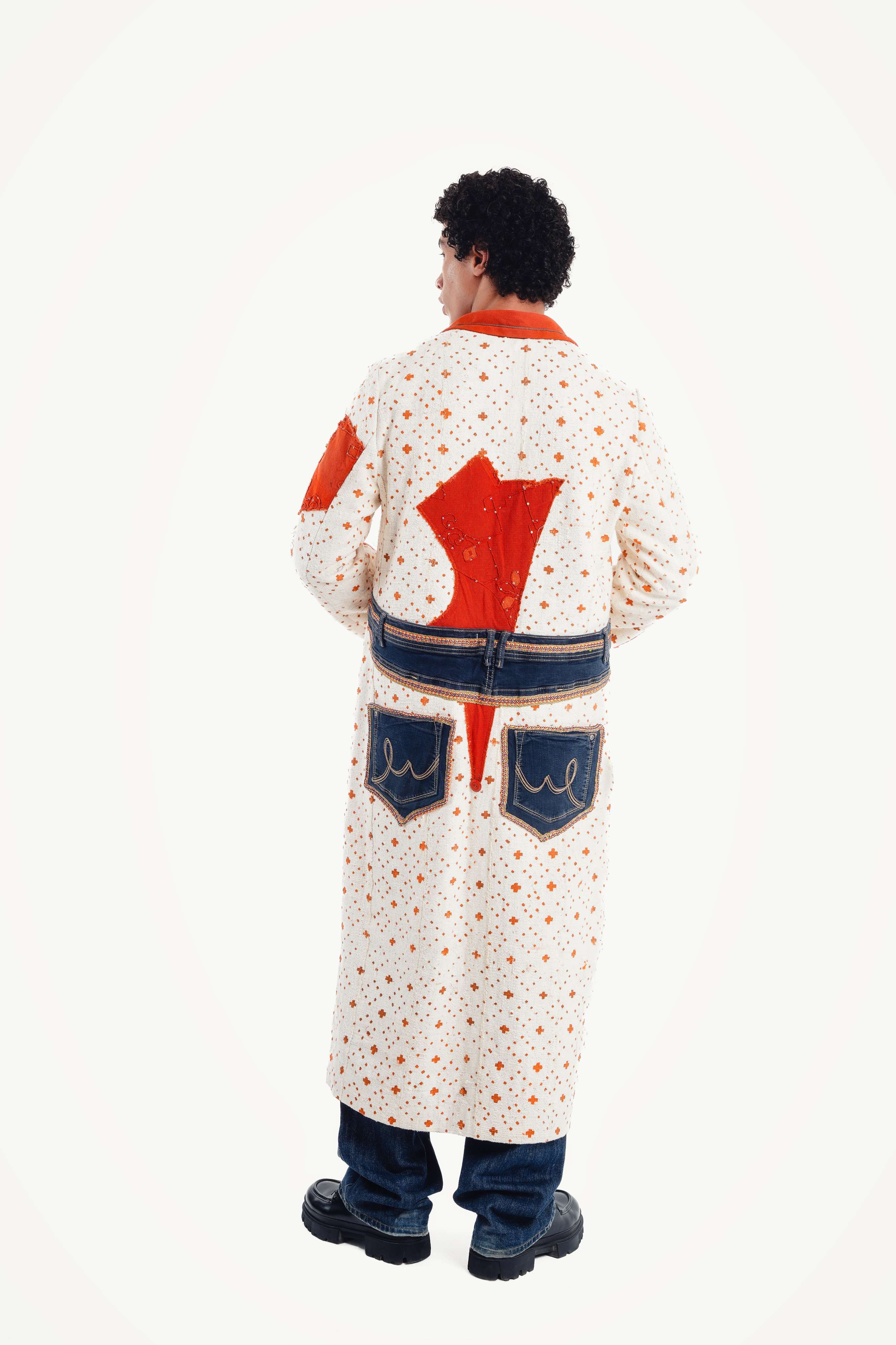 Inspired by the vibrant, golden hue of turmeric piled high in a bustling souk, this trench is a bold statement in color and creativity. Our artisan partners in Morocco began with a clean, graphic textile, a canvas of natural white patterned with spice-orange crosses. Then, they infused it with a rebellious, modern spirit, adding bold, solid orange lapels and cuffs, and a truly unexpected deconstructed denim appliqué on the back. The 'Turmeric Trench' is a fusion of tradition and street art, a coat for the individualist who isn't afraid to break the rules.