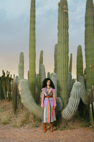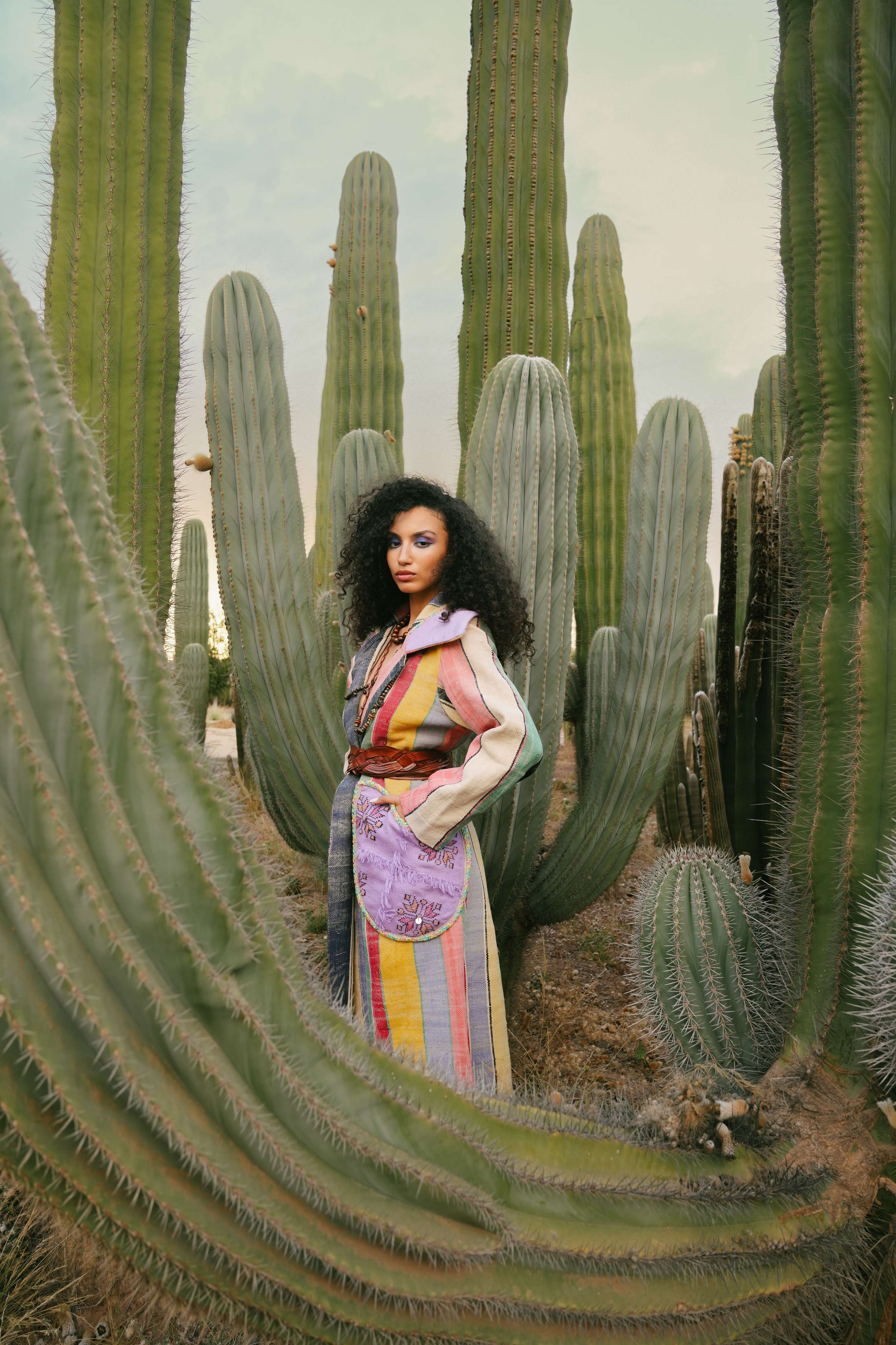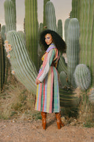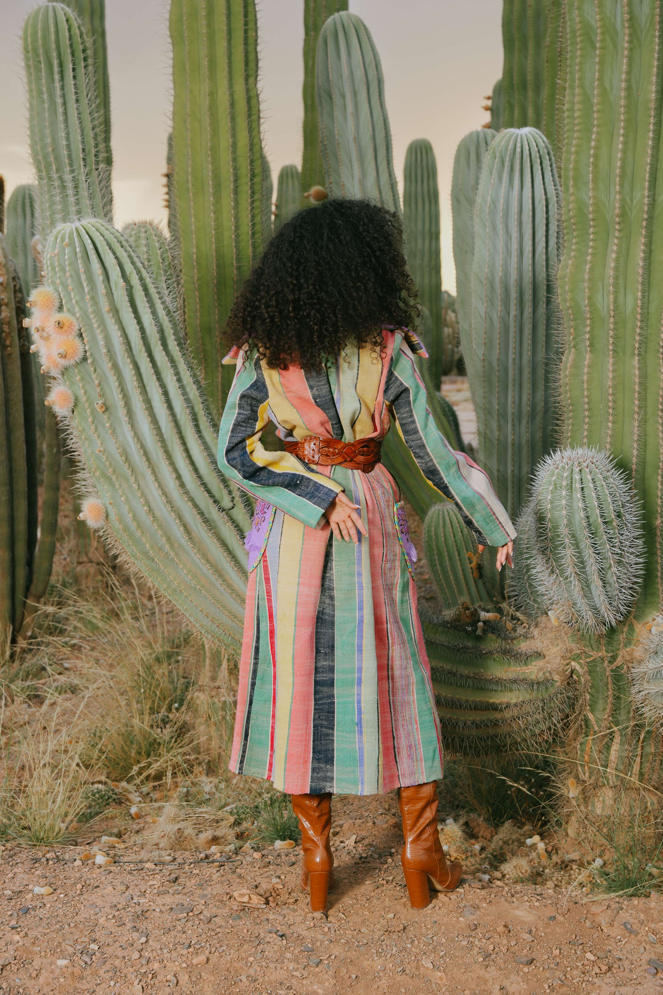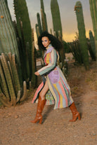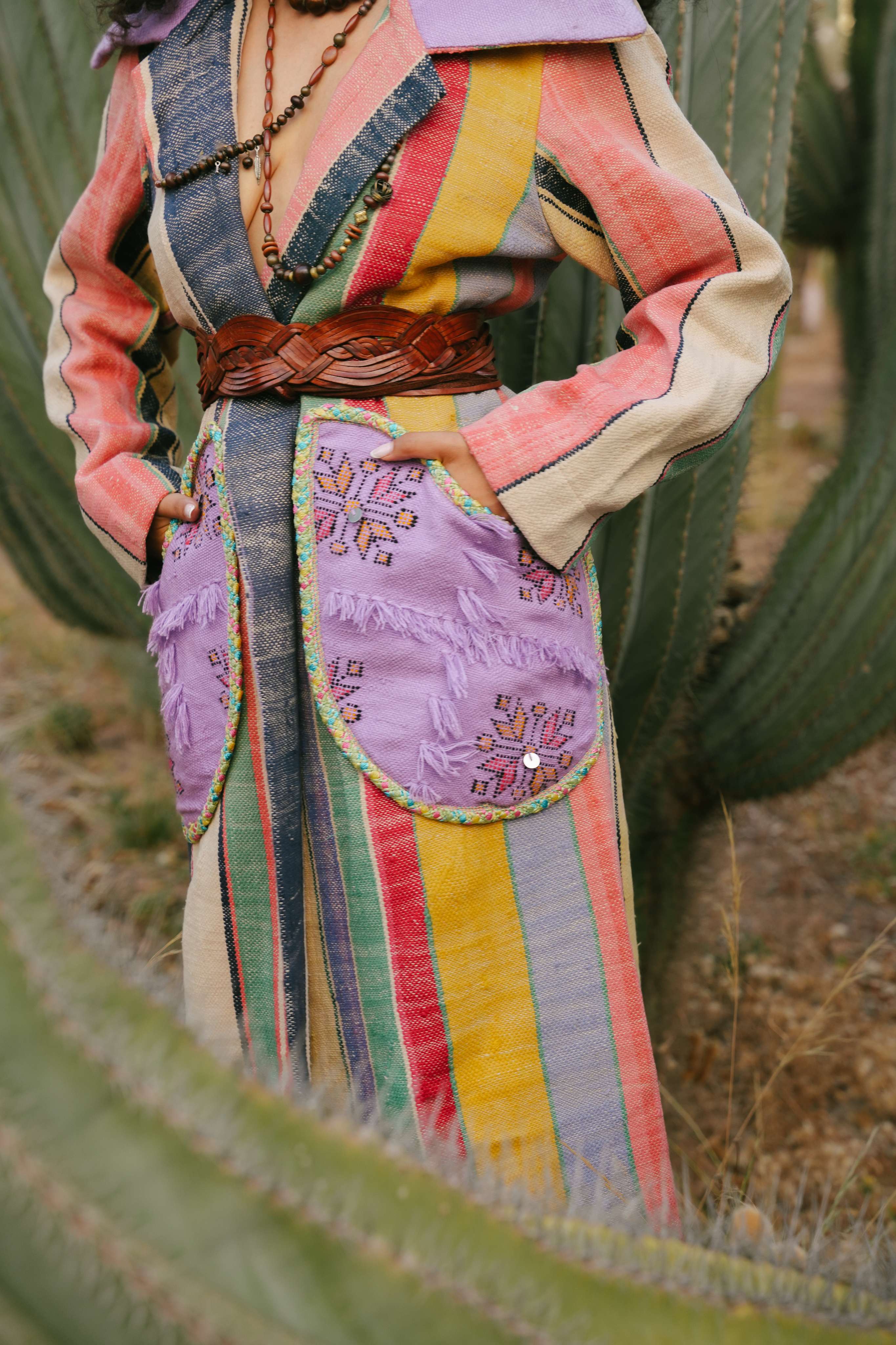 Inspired by the nomadic spirit and the endless creativity of Moroccan artisans, this trench is a wearable collage of color, texture, and pattern. It evokes the feeling of collecting treasured textiles from different souks and villages across the desert. Handcrafted in Morocco, every stripe, stitch, and detail tells a story, creating a one-of-a-kind garment that is as unique as the woman who wears it.