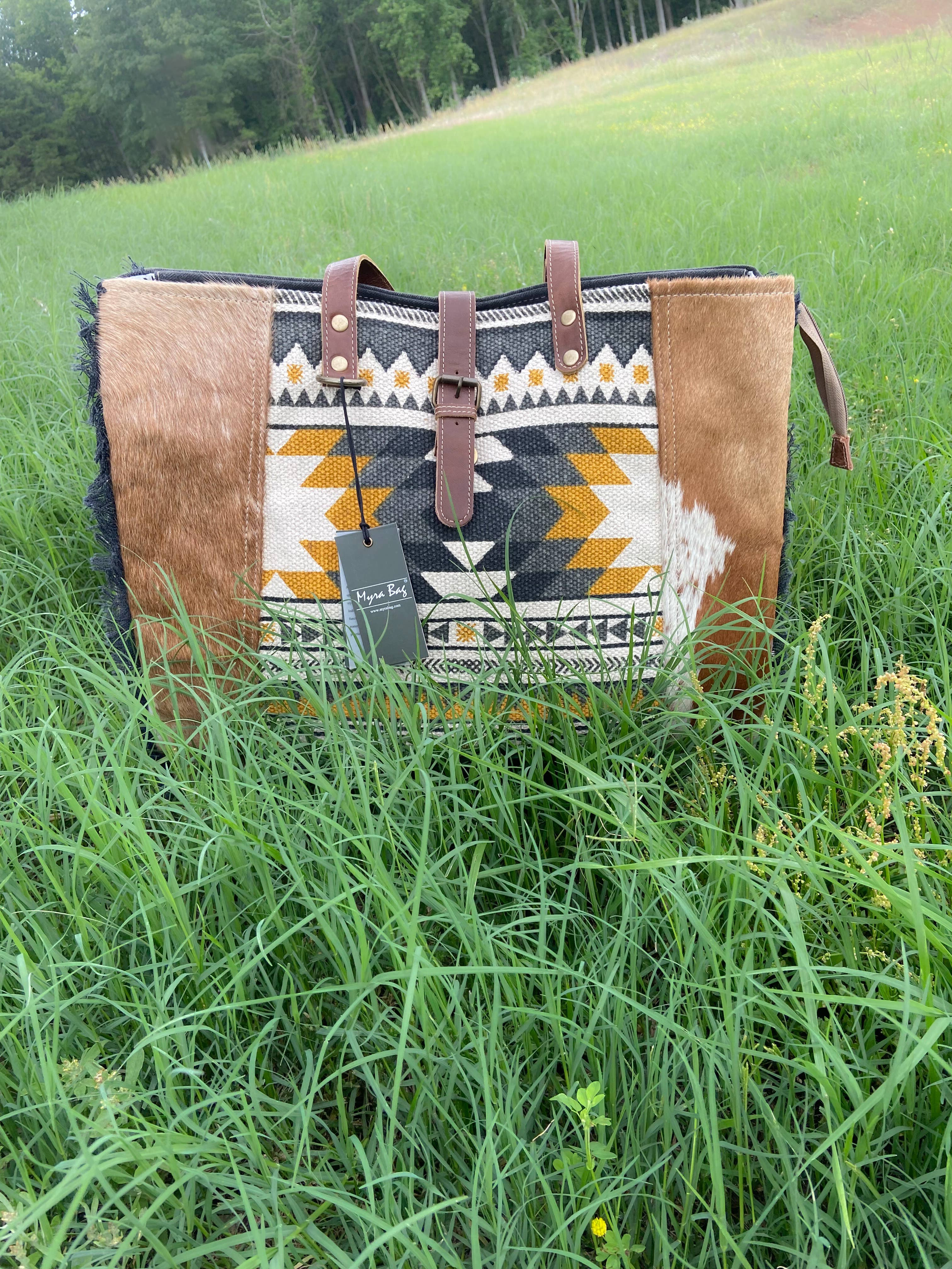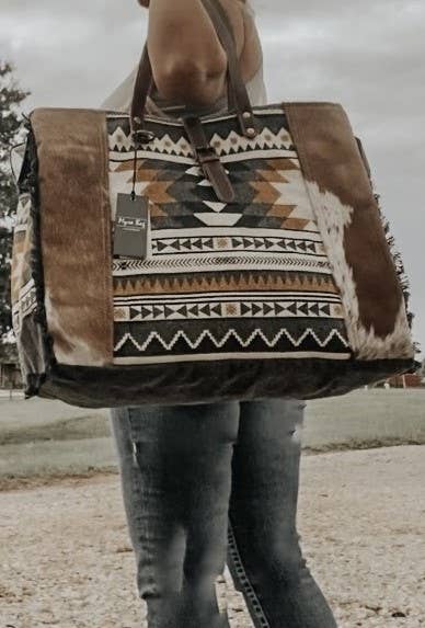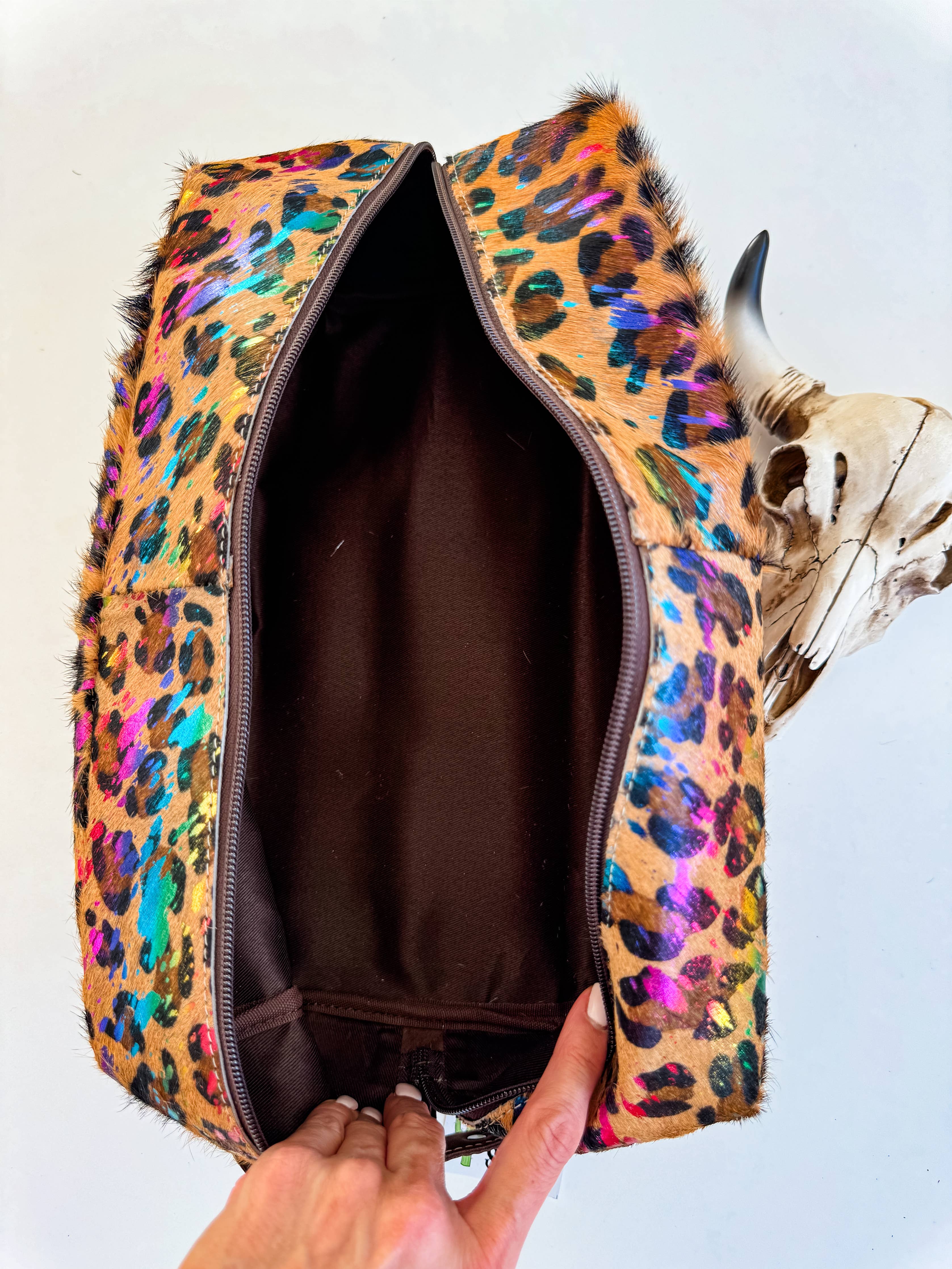 Durable Leather Accents: The back, sides, and bottom are crafted from durable, genuine leather, providing a sturdy structure and a classic contrast to the vibrant hide. A robust leather handle makes for an easy grab-and-go.