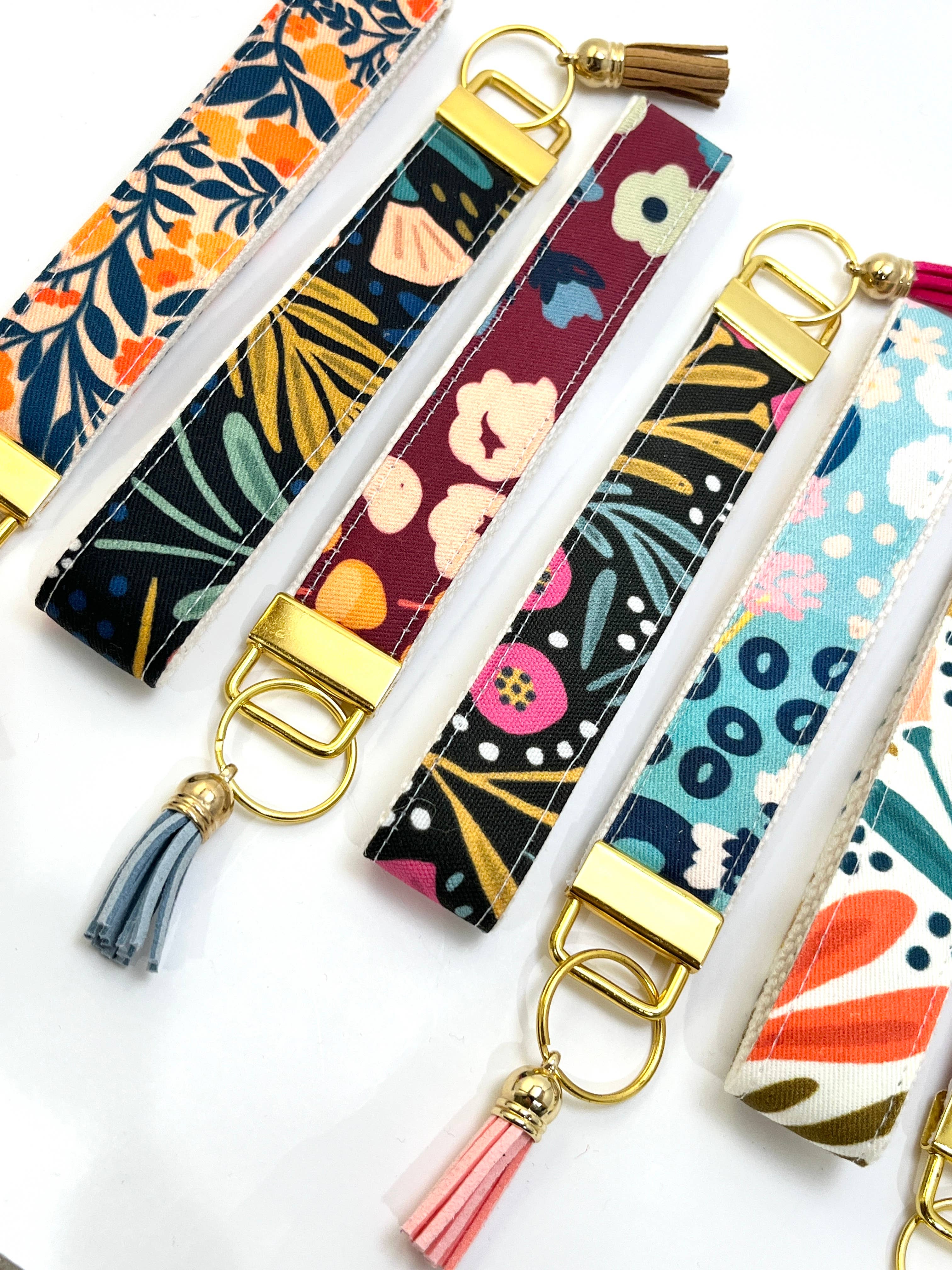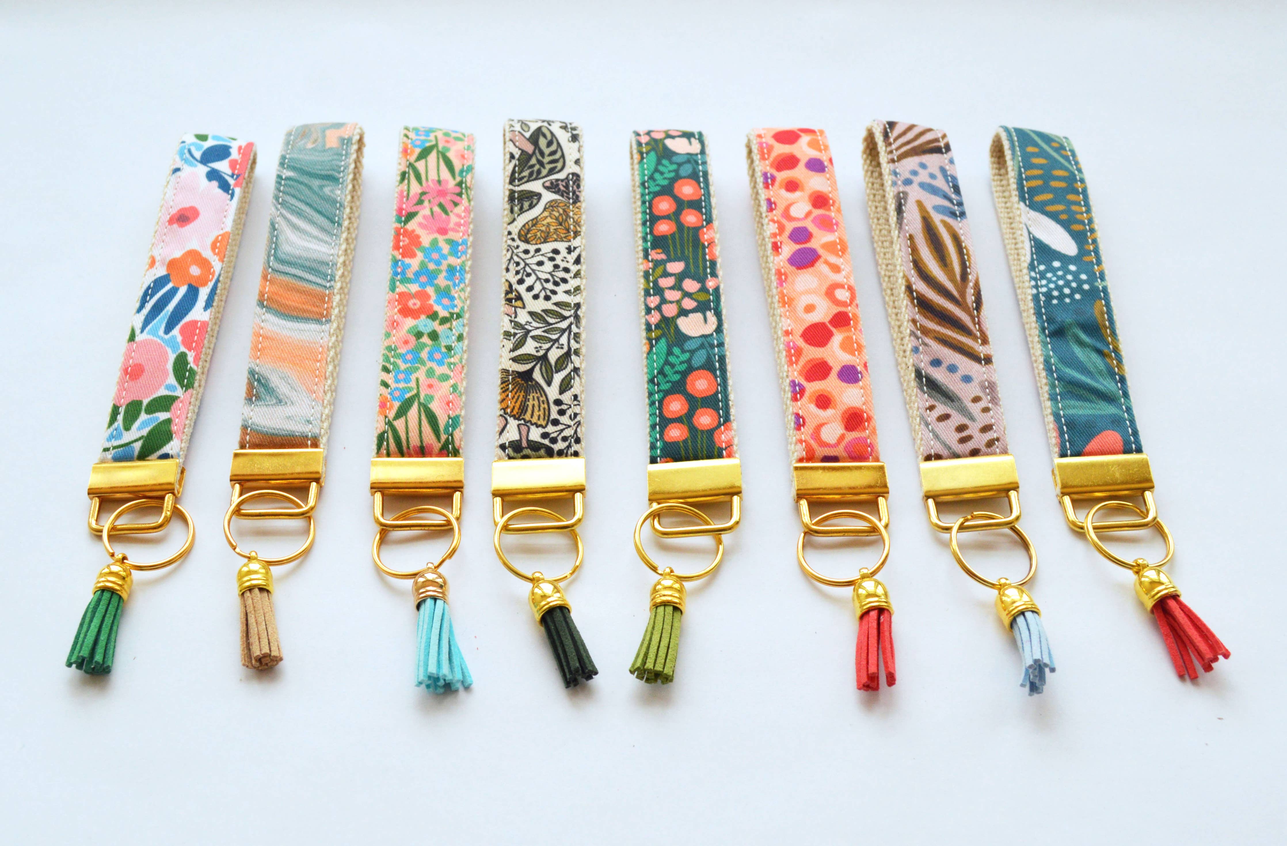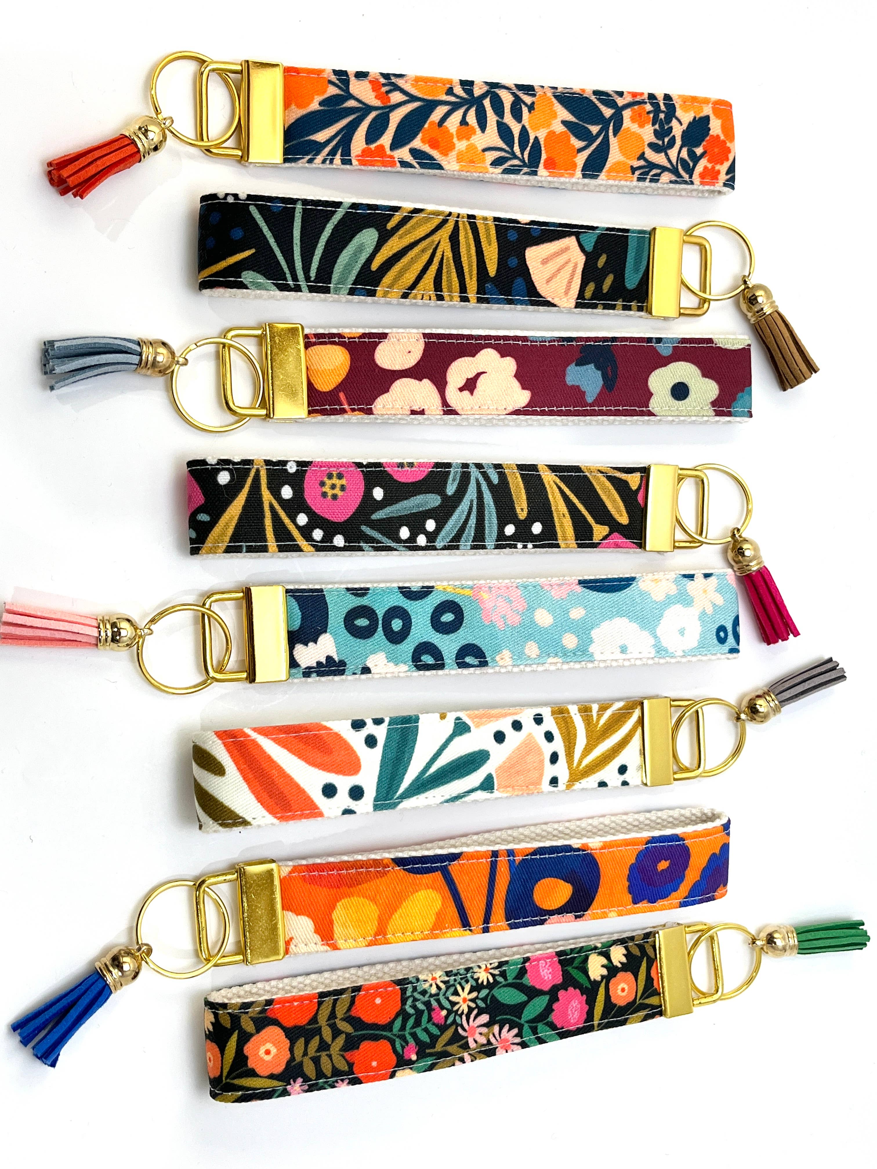 Each key fob is handmade, which means the fabric pattern may vary slightly from piece to piece. The tassel colors are designed to coordinate with the pattern but may also differ. This uniqueness adds a personal touch to every wristlet.