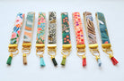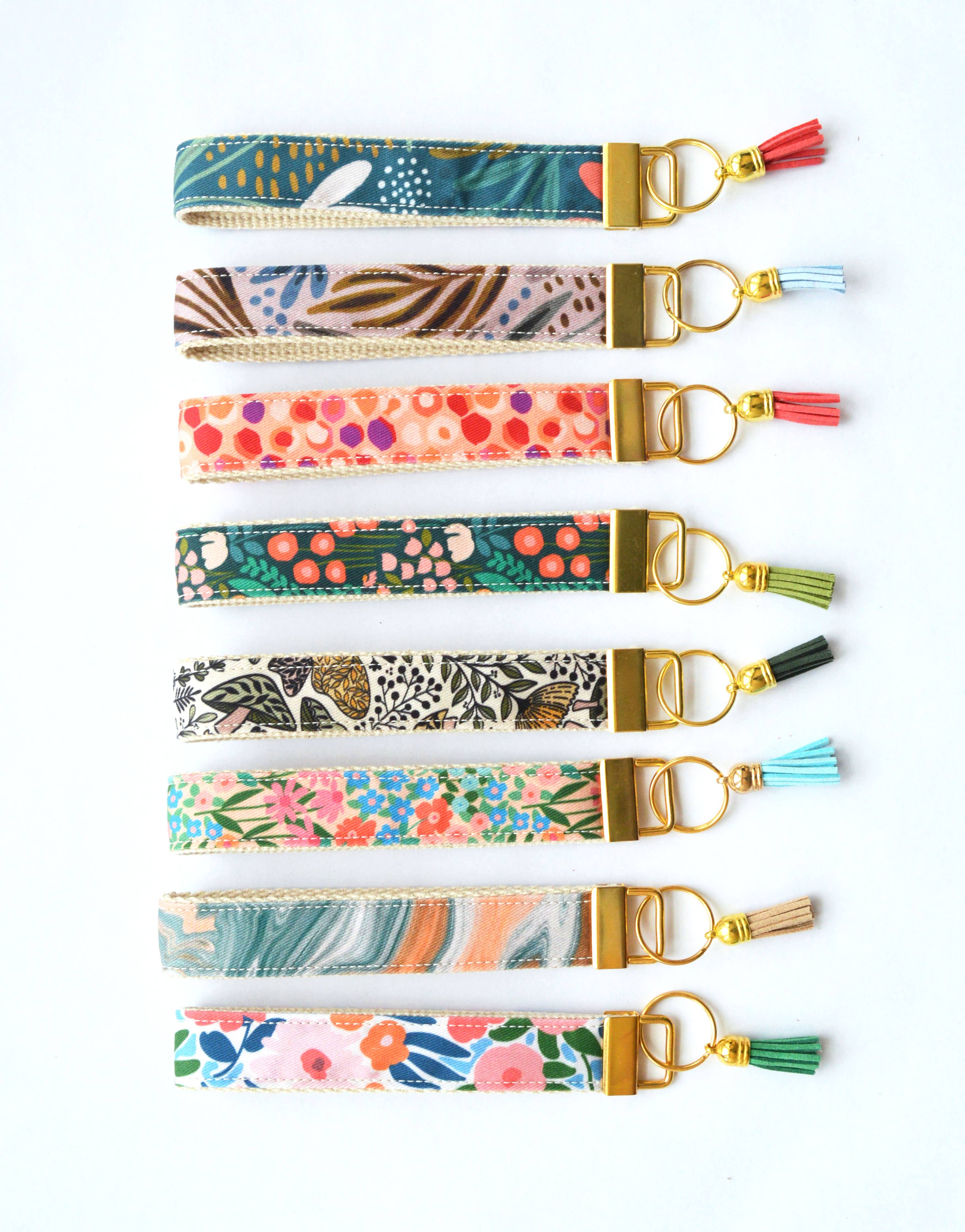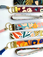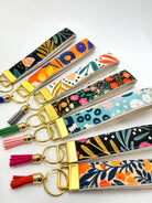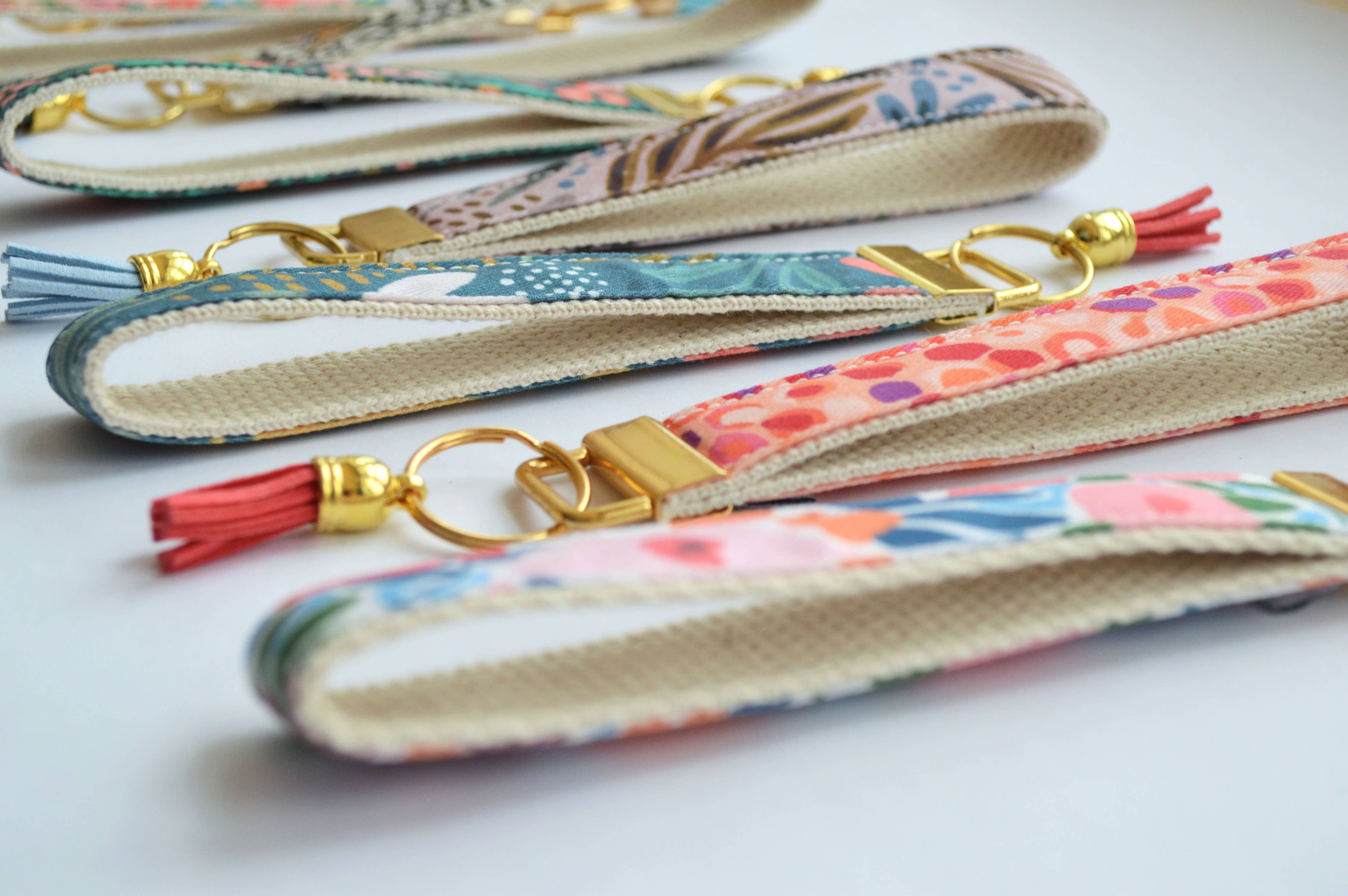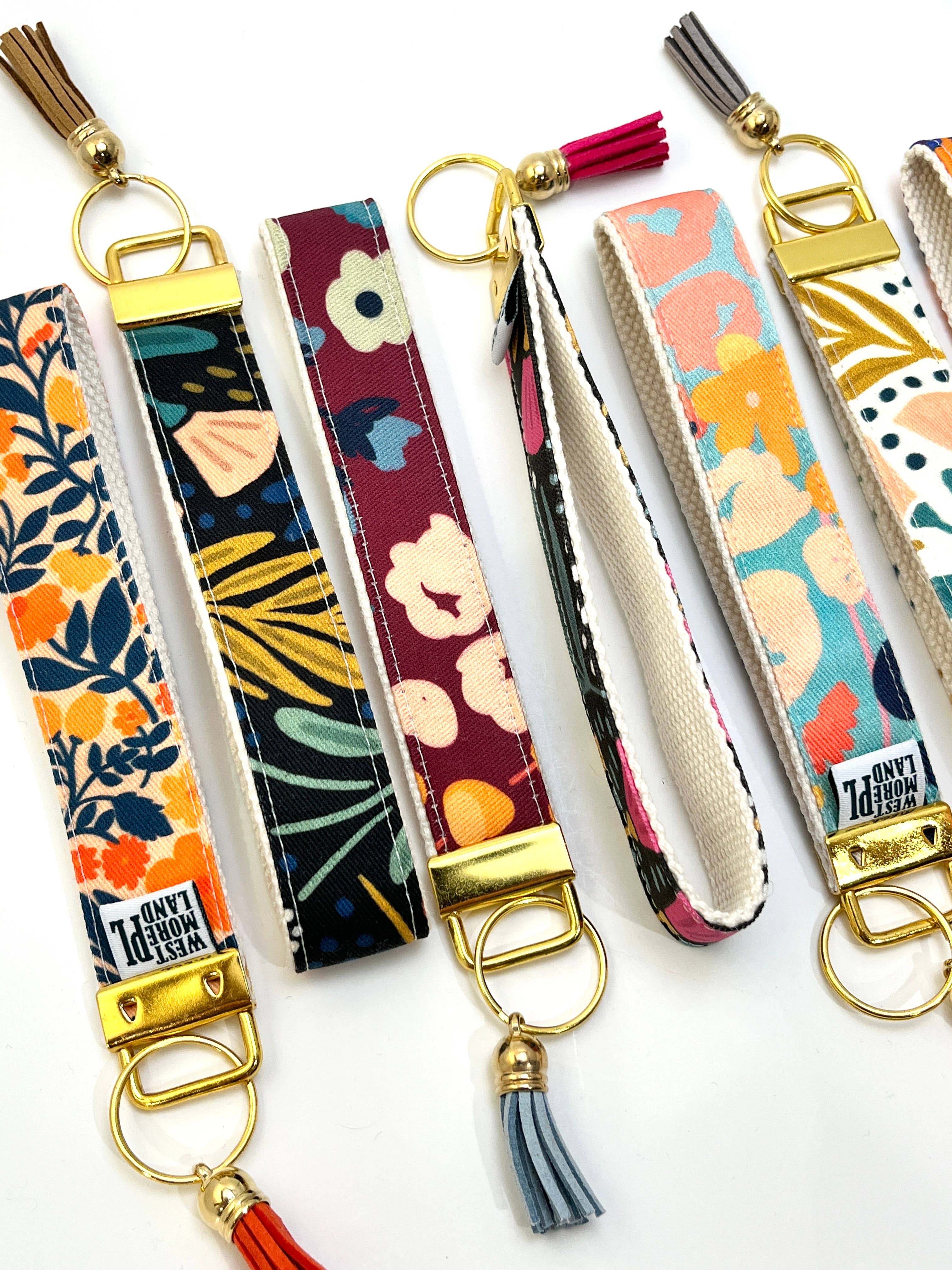 Each key fob is handmade, which means the fabric pattern may vary slightly from piece to piece. The tassel colors are designed to coordinate with the pattern but may also differ. This uniqueness adds a personal touch to every wristlet.