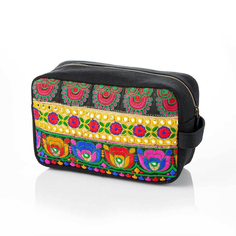 Sustainable, stylish, and spacious. This toiletry bag features a vibrant mashup of upcycled embellished cotton sari patchwork and rugged black canvas.
