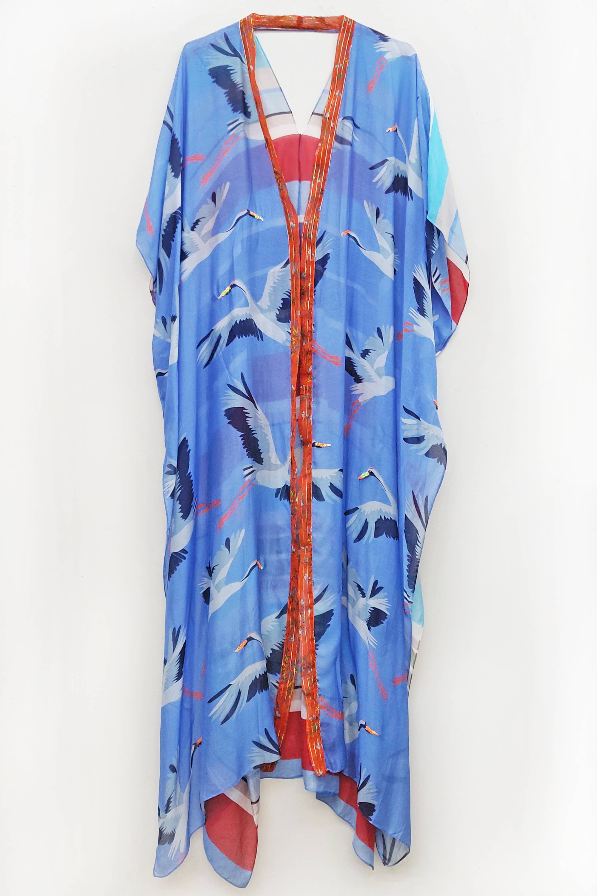- Hand-Embellished Sequin Accents: Majestic blue cranes soar across the front panels, intricately accented with shimmering gold sequins on the beaks and heads that add texture and a luxurious sparkle to the avian design.