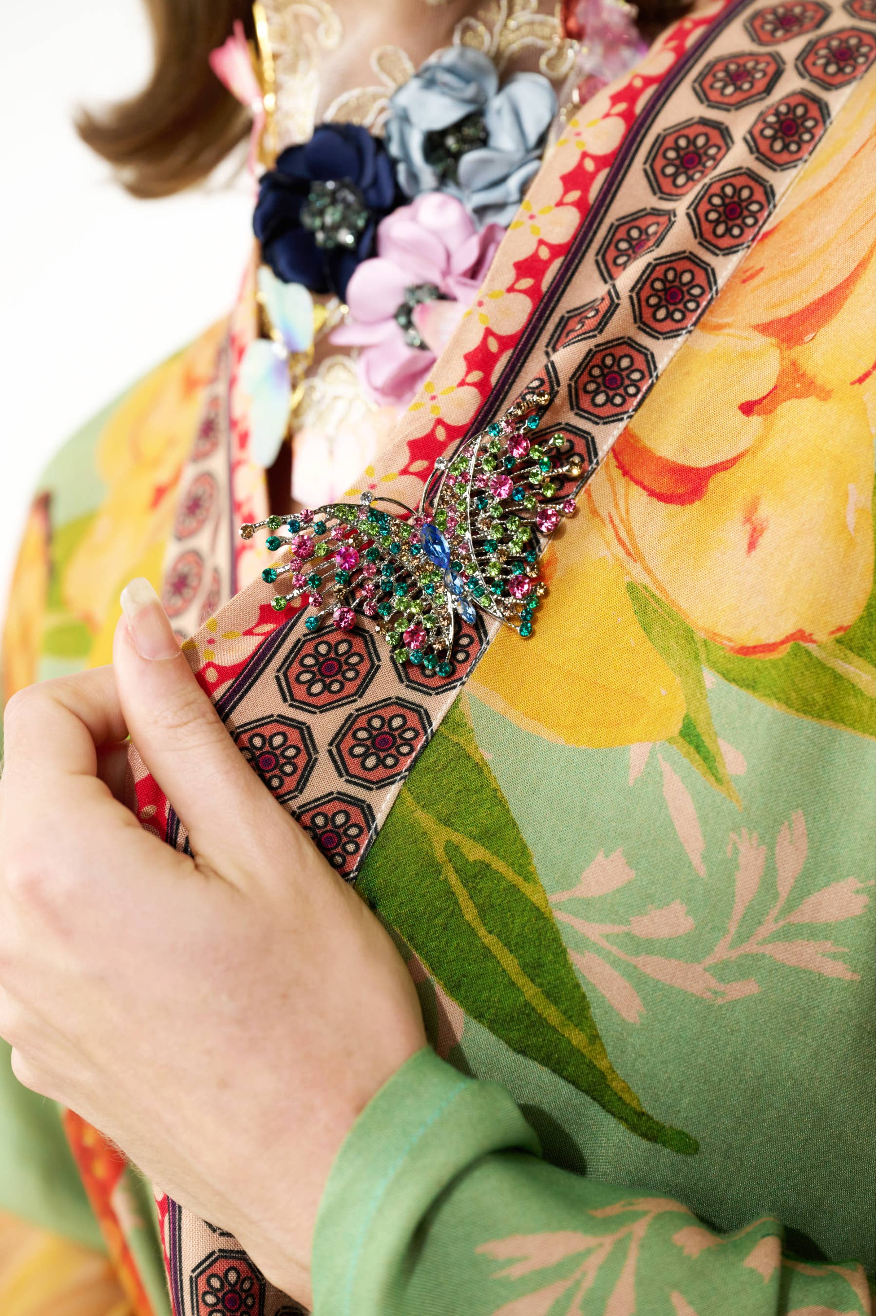- Sage Green: Finished with an intricate geometric contrast print on the neckband and a sparkling crystal butterfly pin attached to the lapel.
