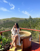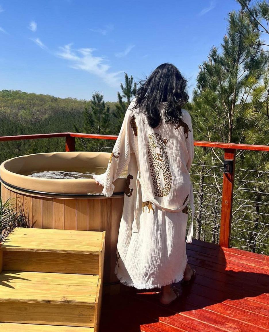 The Cheetah Robe is a study in untamed elegance. Handcrafted by Turkish artisans from 100% organic cotton, this garment feels as light as air and serves as a living textile that grows softer with every wear. The creamy, gauze-like fabric serves as a canvas for majestic gold and tan cheetahs, painted with artistic precision, that prowl across the back and sleeves, adding a touch of fierce sophistication to your downtime.