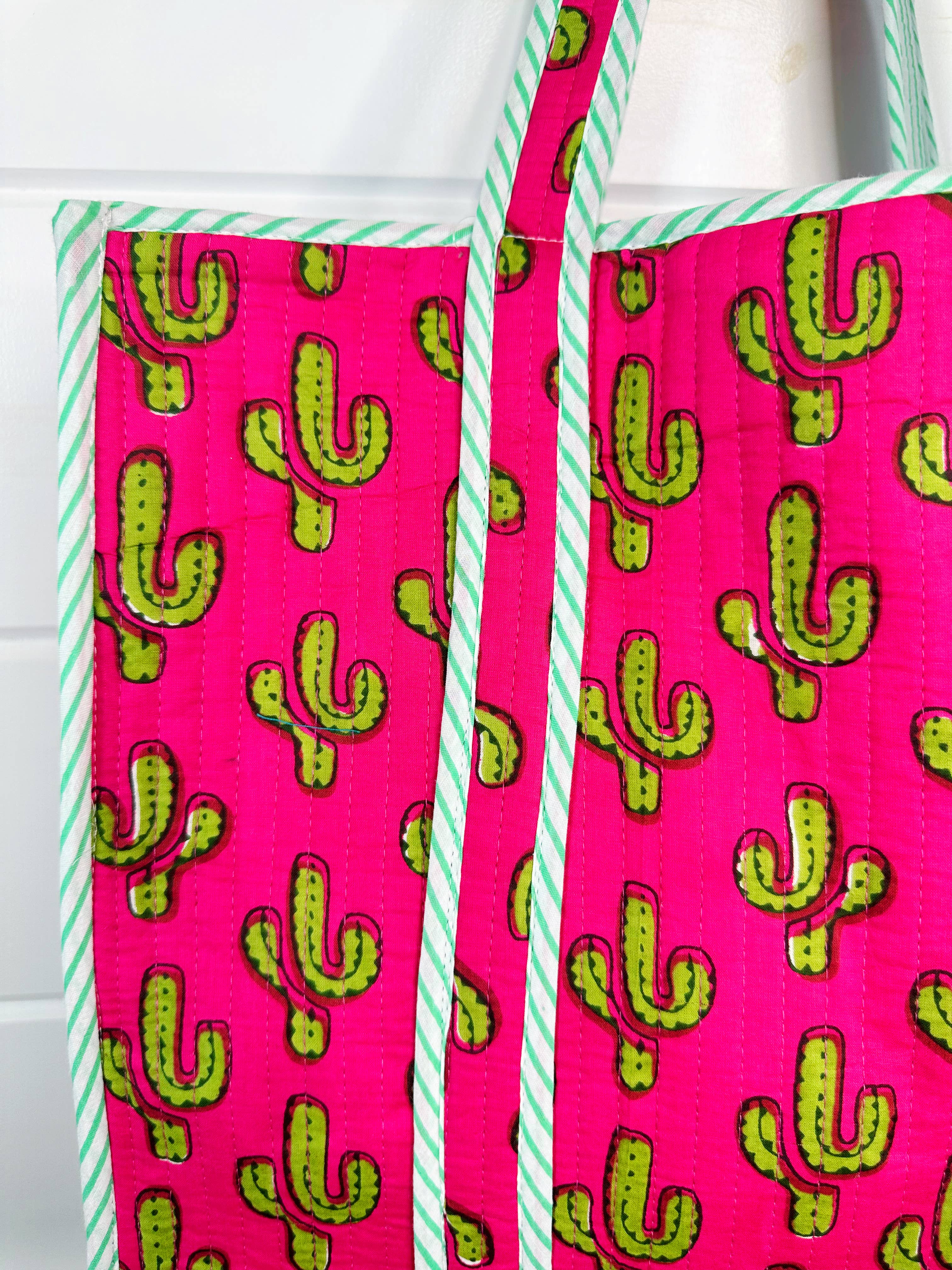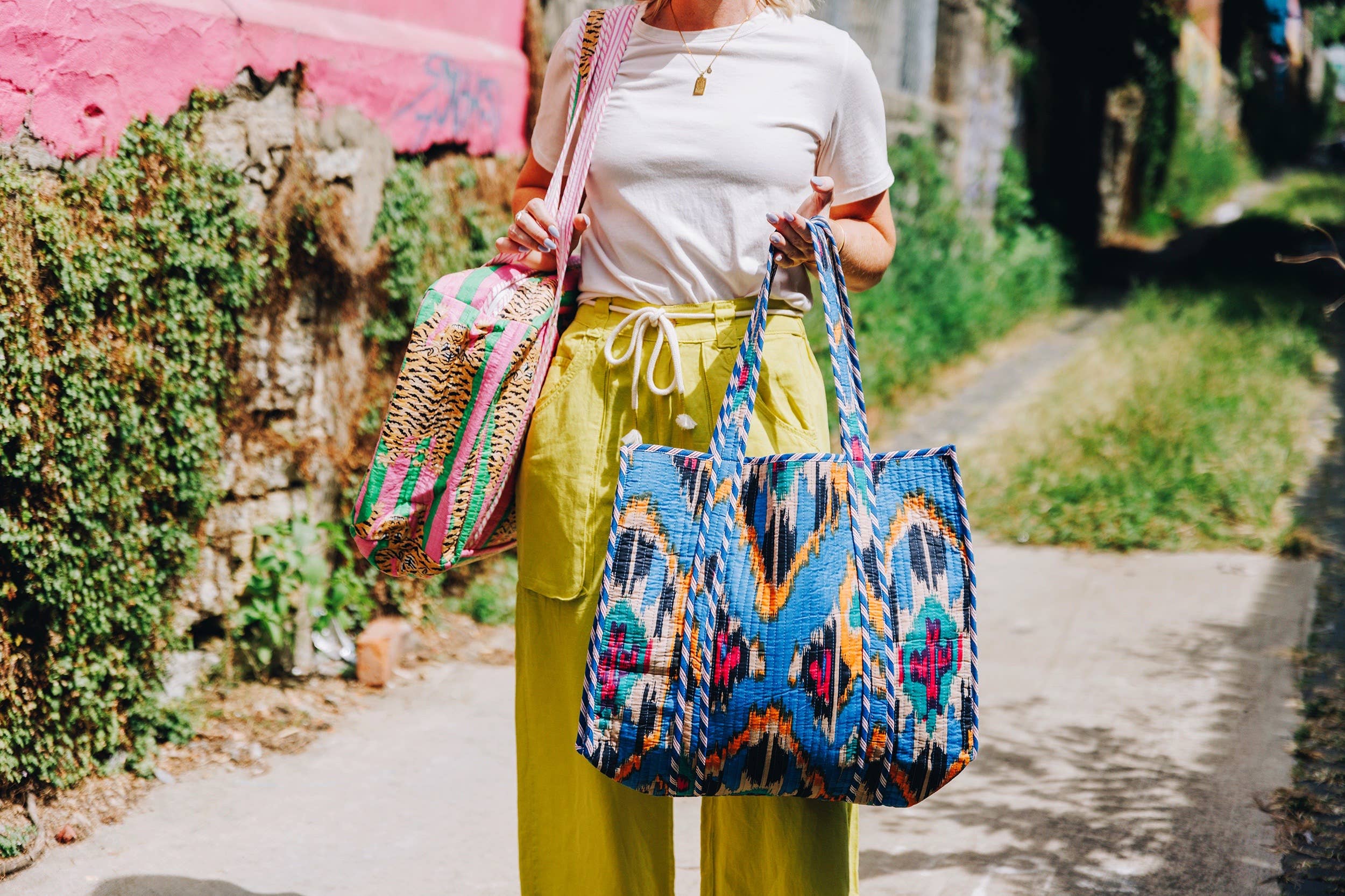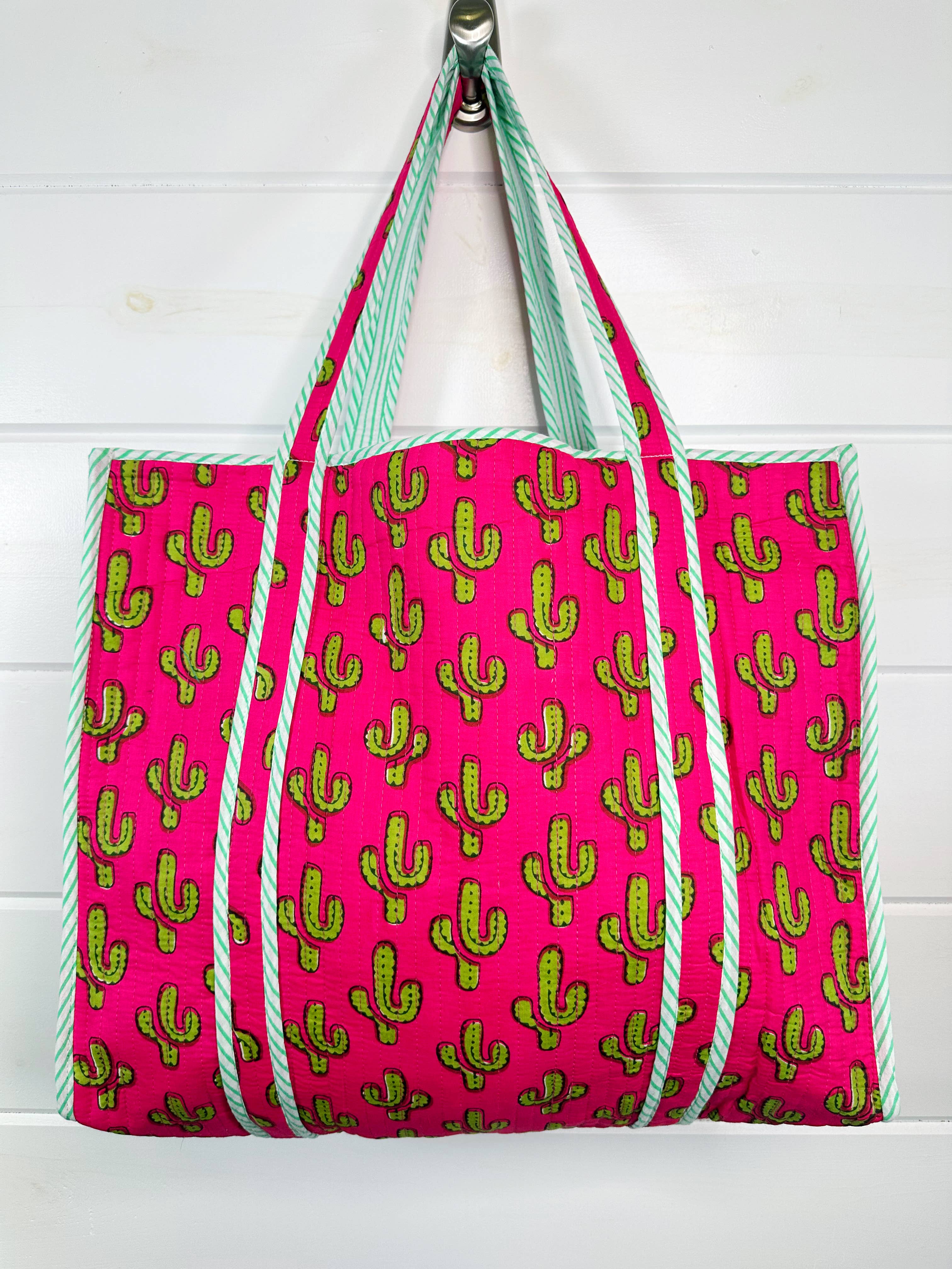 The Carpe Quilted Tote is the oversized, reversible answer to "how am I going to carry all this?" Designed for the person who refuses to pack light, this bag features bold, hand-blocked prints that scream dopamine dressing. Whether you choose the electric "Pink Cactus" print with its preppy green-striped interior or the vibrant "Blue Ikat" that flips to a nautical stripe, you get two loud looks in one soft, quilted package. Handcrafted by artisans in India, it’s big, it’s beautiful, and it’s ready for the weekend.