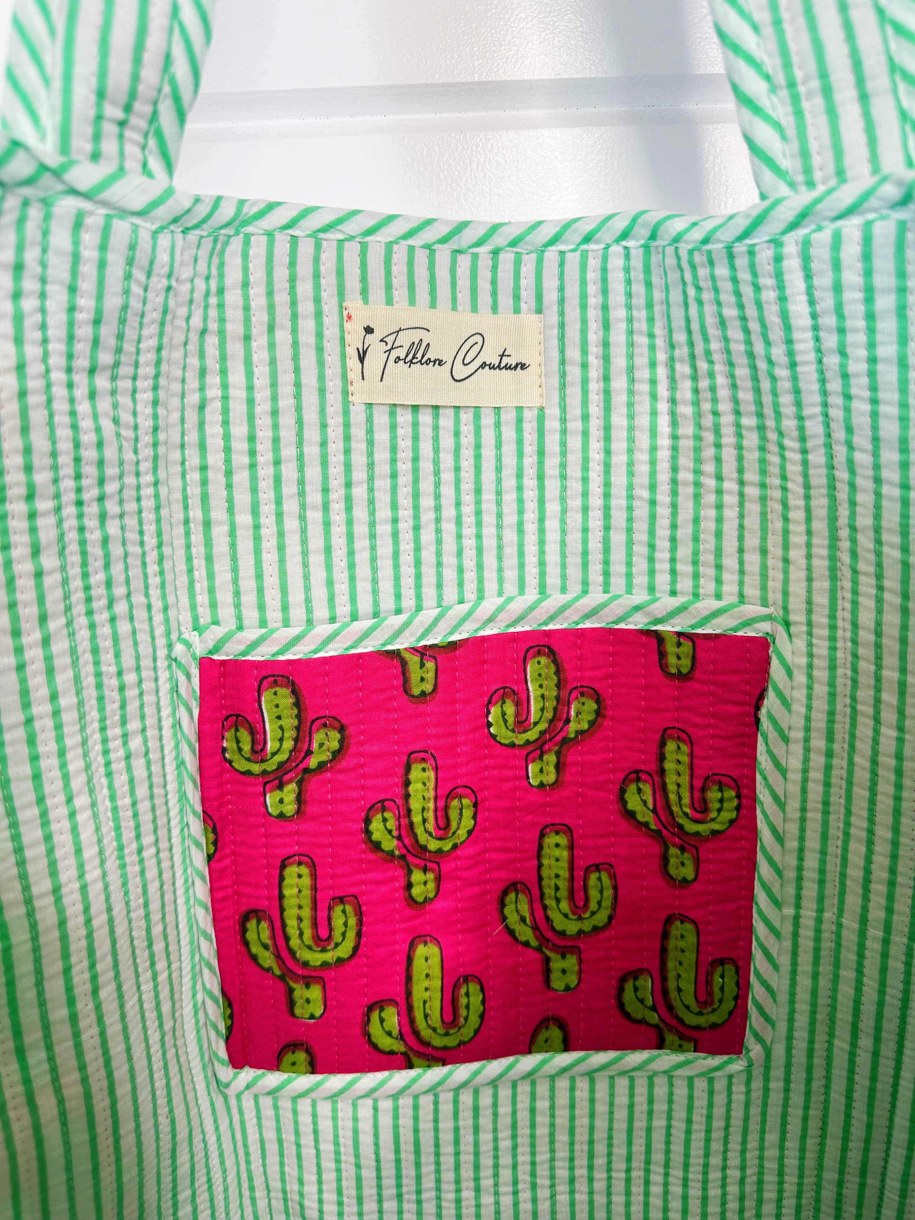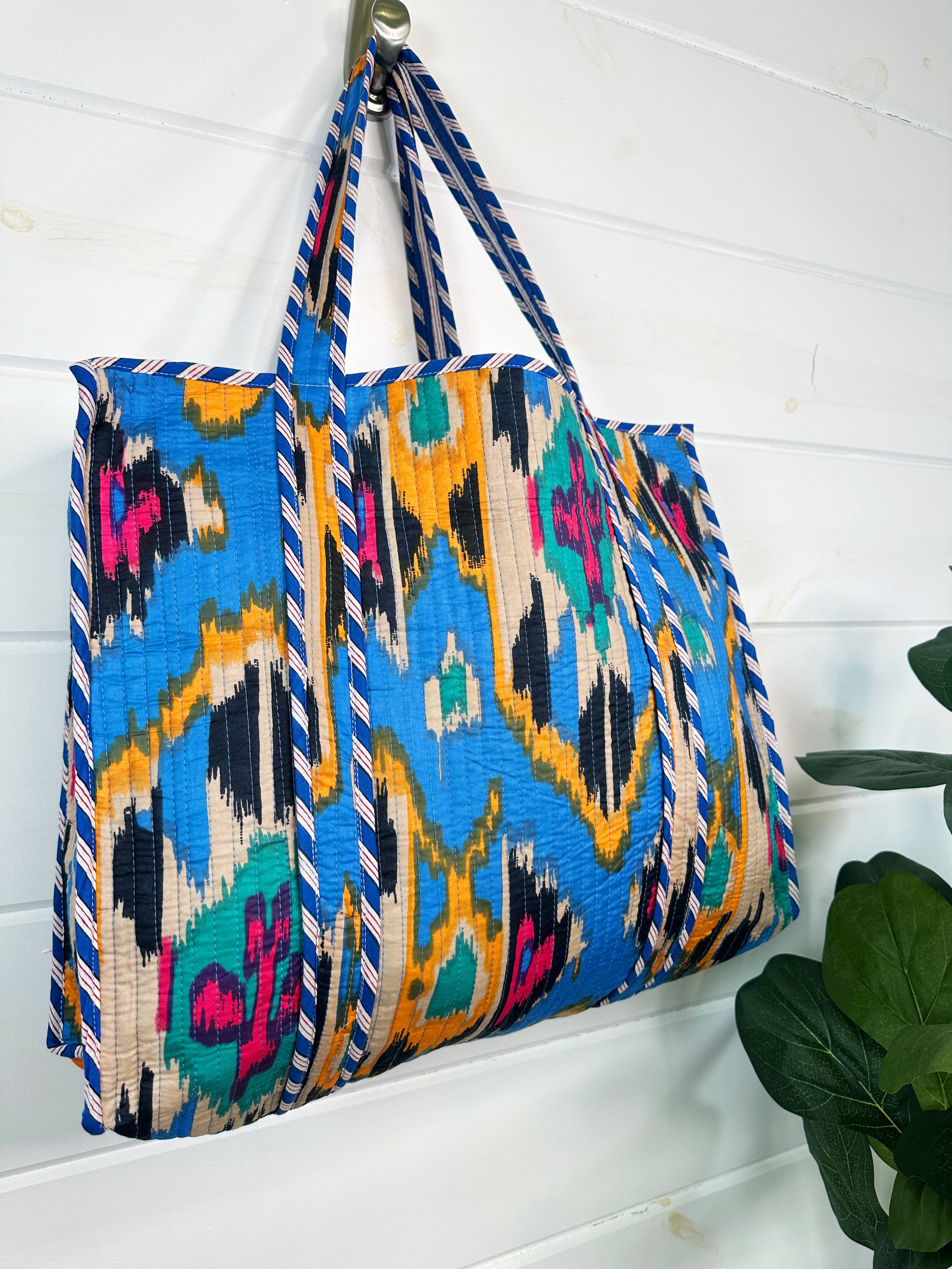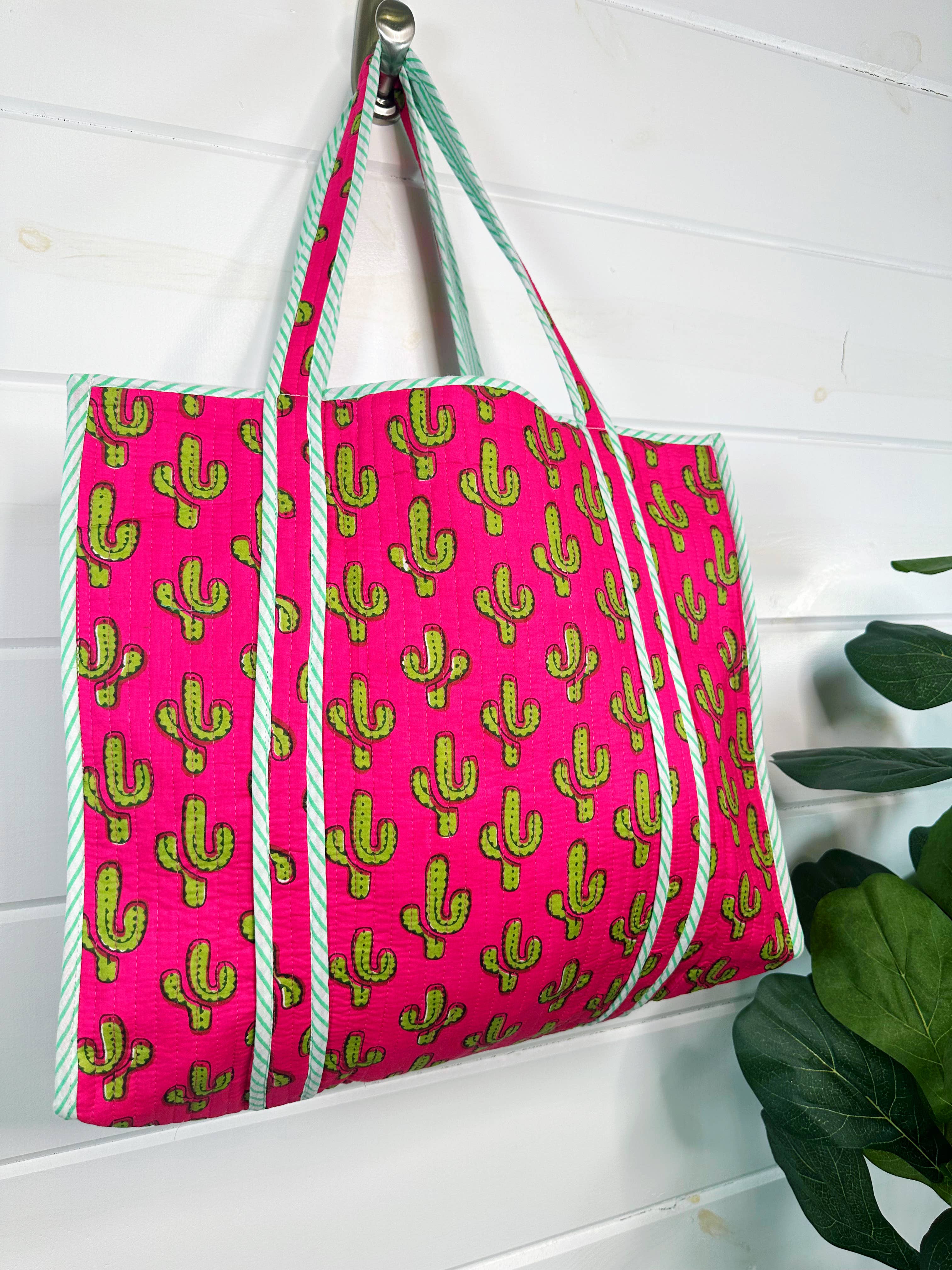 The Carpe Quilted Tote is the oversized, reversible answer to "how am I going to carry all this?" Designed for the person who refuses to pack light, this bag features bold, hand-blocked prints that scream dopamine dressing. Whether you choose the electric "Pink Cactus" print with its preppy green-striped interior or the vibrant "Blue Ikat" that flips to a nautical stripe, you get two loud looks in one soft, quilted package. Handcrafted by artisans in India, it’s big, it’s beautiful, and it’s ready for the weekend.