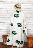 The Evil Eye Kimono is more than just a cover-up; it is a wearable talisman. Crafted from 100% organic cotton, this piece offers a texture that is delightfully soft, light, and fluffy against the skin, making it perfect for sun-drenched beach days or quiet mornings at home. Adorned with the timeless "Evil Eye" motif—painted in vibrant strokes of pink, turquoise, lime, or classic blue—it serves as a chic protector against negative energies, ensuring that you carry nothing but good vibes wherever you go.