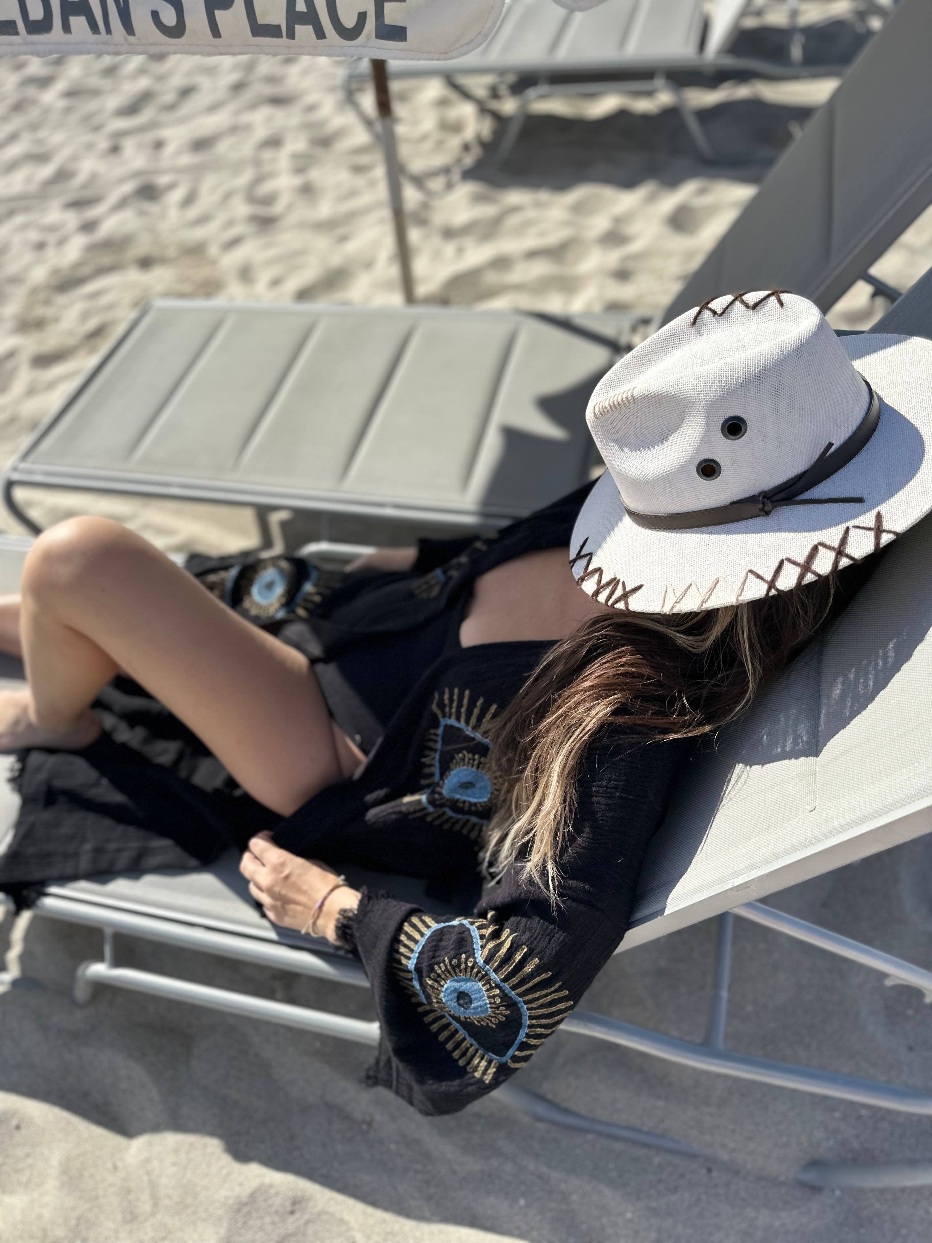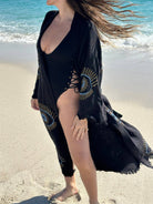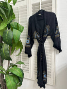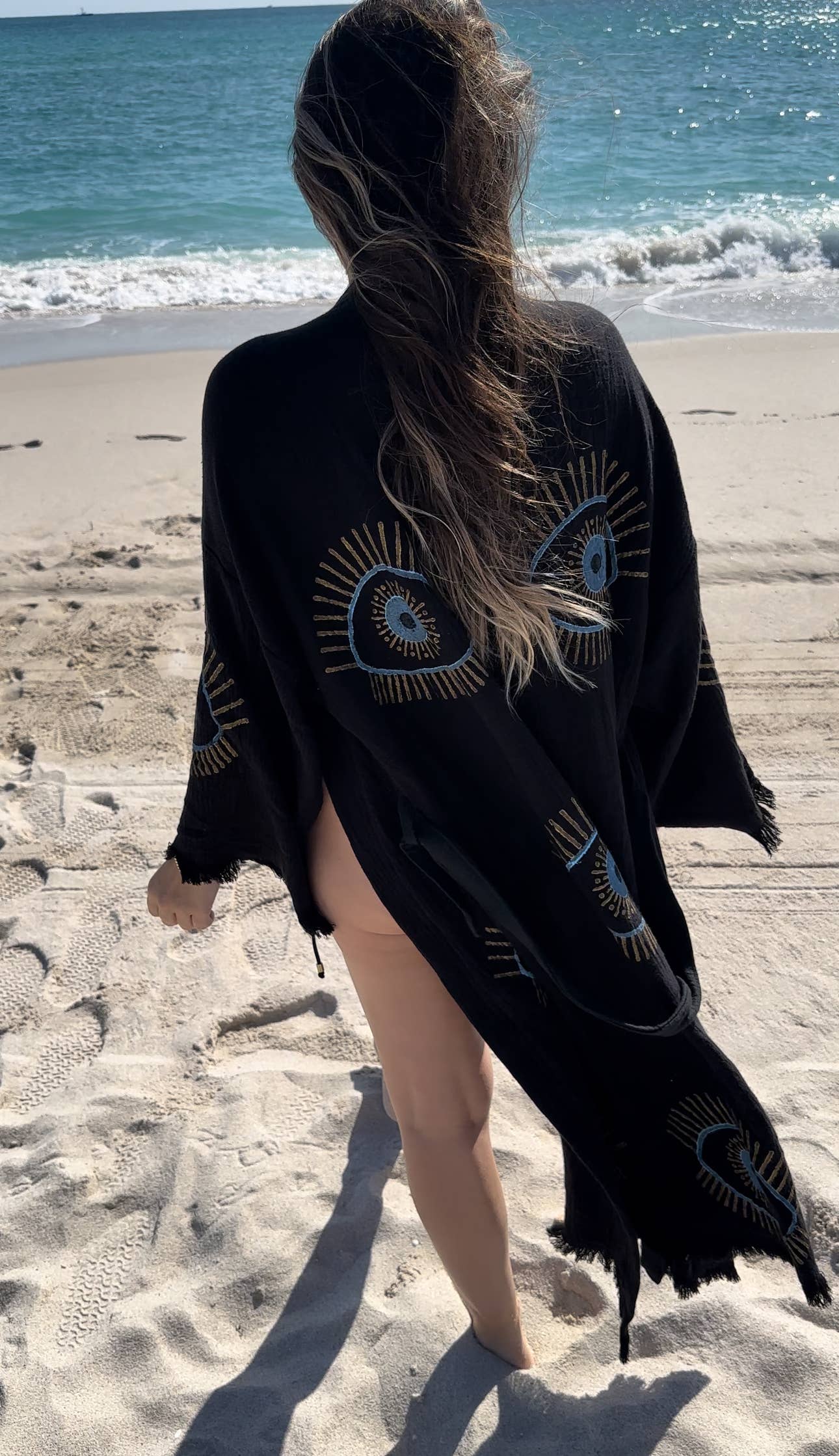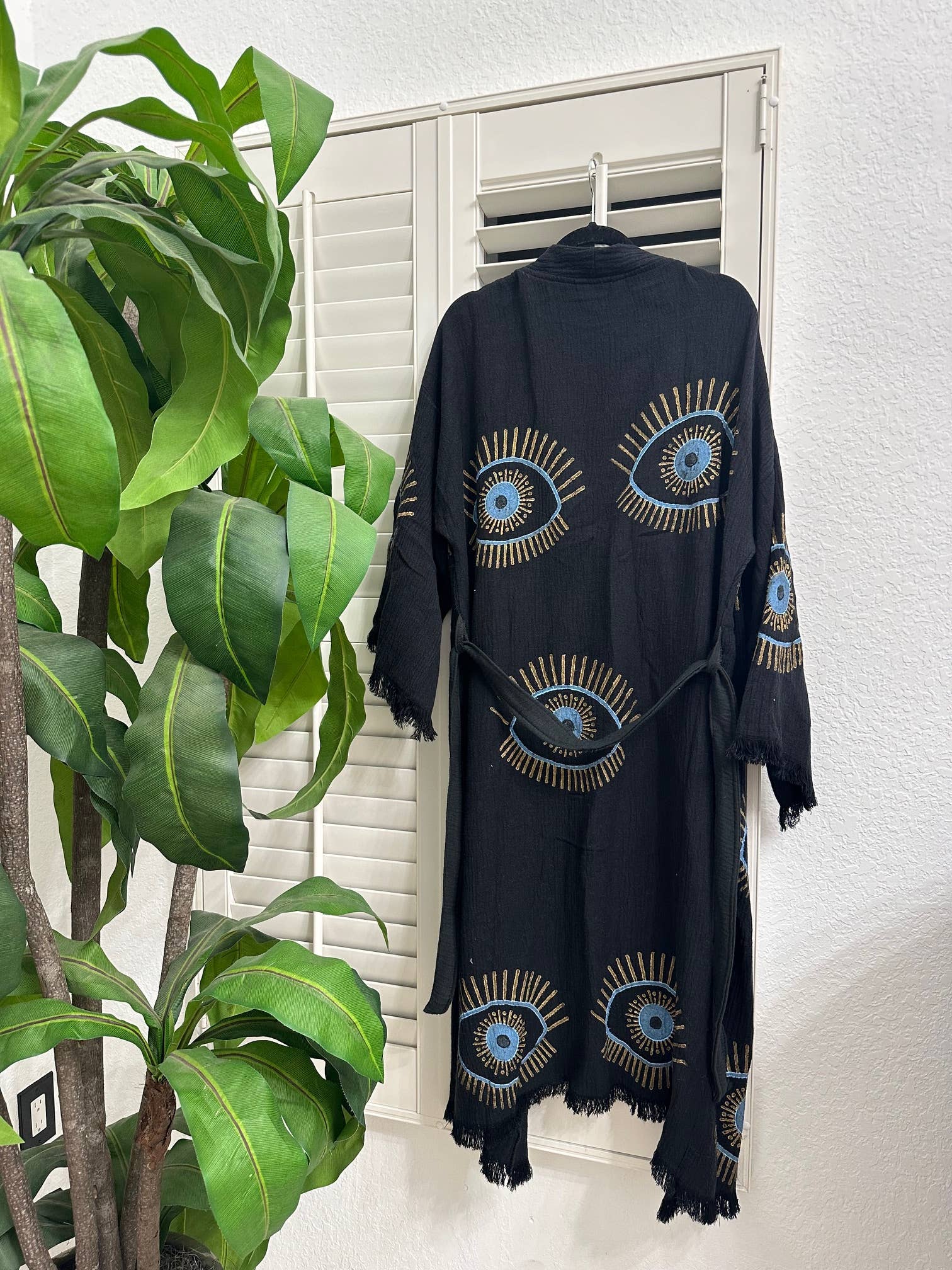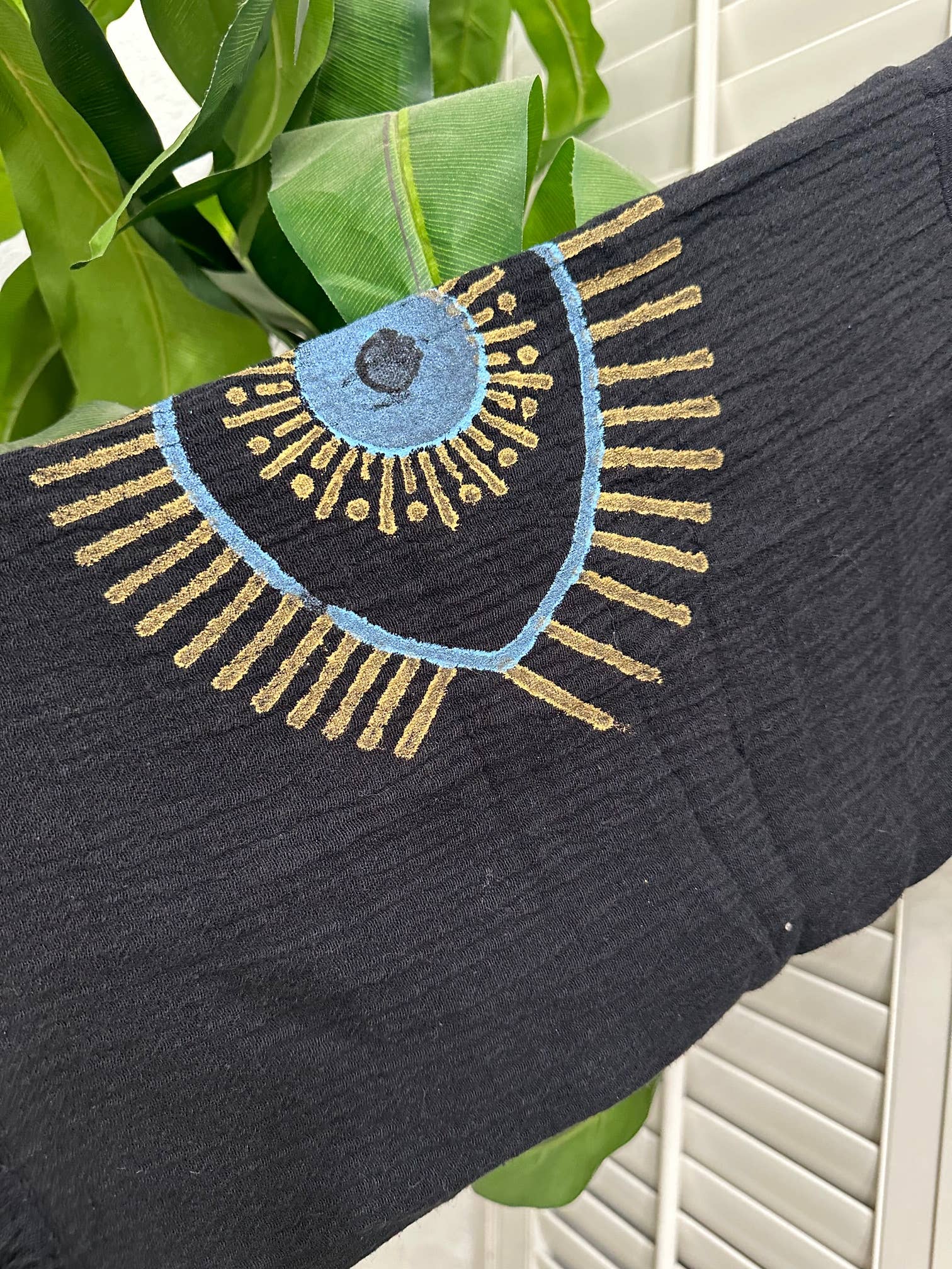 The Gold Coast Kimono is a garment of striking contrast. Crafted from 100% organic Turkish cotton in a deep, dramatic black, it serves as the perfect backdrop for its shimmering hand-painted details. Adorned with stylized "Evil Eye" motifs in rich blue and metallic gold, this piece wraps you in a shield of positivity while radiating an air of nocturnal elegance. Meticulously handcrafted by artisans, it bridges the gap between a relaxing robe and a statement evening layer.