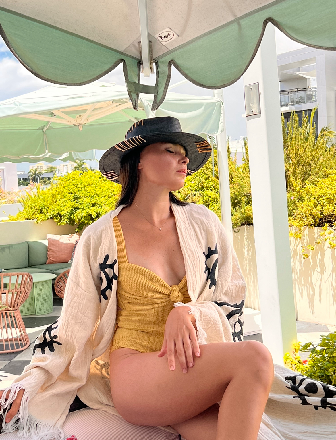 This hat pairs best with confidence. We love it styled with a mustard yellow swimsuit for a high-contrast resort look, or worn with an oversized white linen shirt to add some edge to a classic outfit. It’s sophisticated, slightly rebellious, and completely unforgettable.