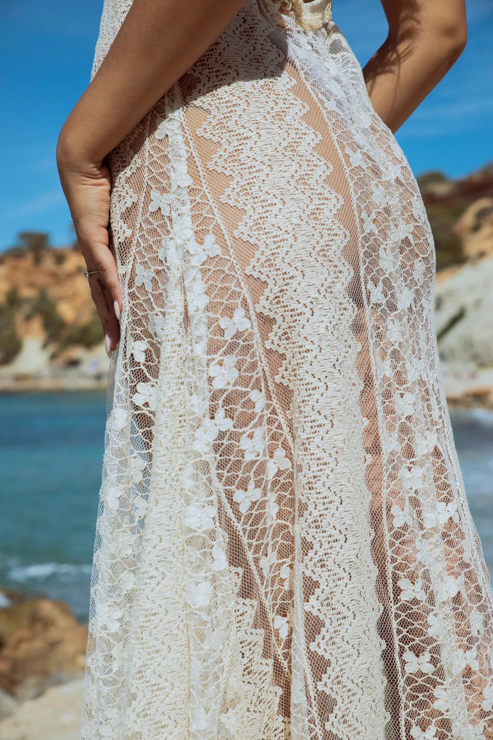 The Palma Maxi Dress is a study in sensual elegance, designed for the woman who moves effortlessly from the sun-drenched sands to the moonlit terrace. Inspired by the intricate architectural details of Ibiza’s old town, this piece is crafted from a luxurious cotton net that feels as light as a sea breeze against the skin. Whether in the midnight depth of Black or the soft, organic purity of Cream, it frames the body in an intricate pattern of floral and geometric motifs, creating a mesmerizing interplay of concealment and reveal.