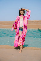 The Free Spirit Silk Kimono is designed for the woman who carries the world with her. Crafted from 100% luminous silk, this piece is a wearable travelogue, featuring prints inspired by global destinations, from the aquamarine depths of "Tulum" and the spicy, red-hued energy of "Marrakesh" to the pastel sunsets of "Venice Beach". With its dramatic butterfly sleeves and shimmering gold metallic accents, it offers instant glamour that packs down to nothing, ready to unfurl wherever the journey takes you.