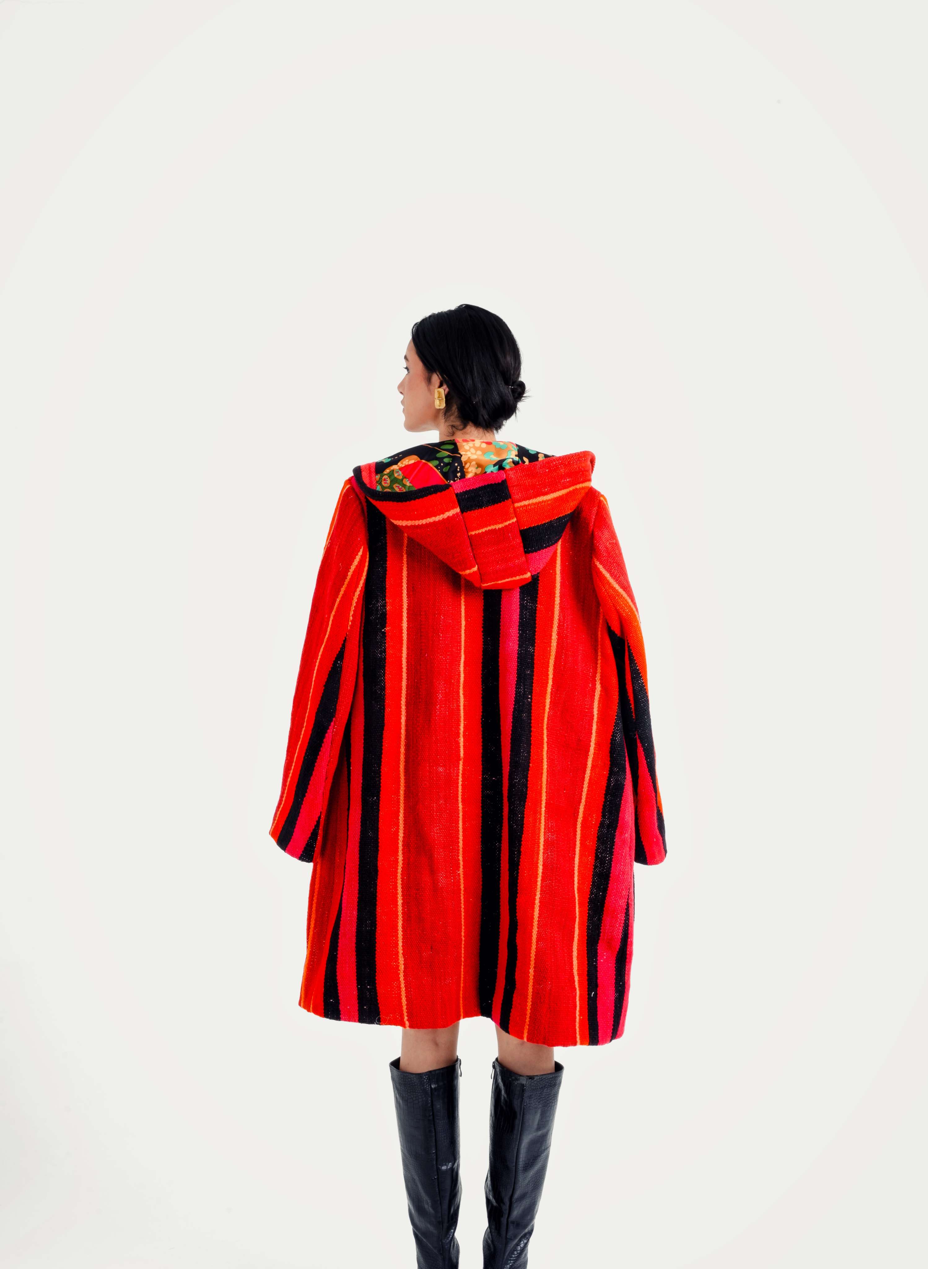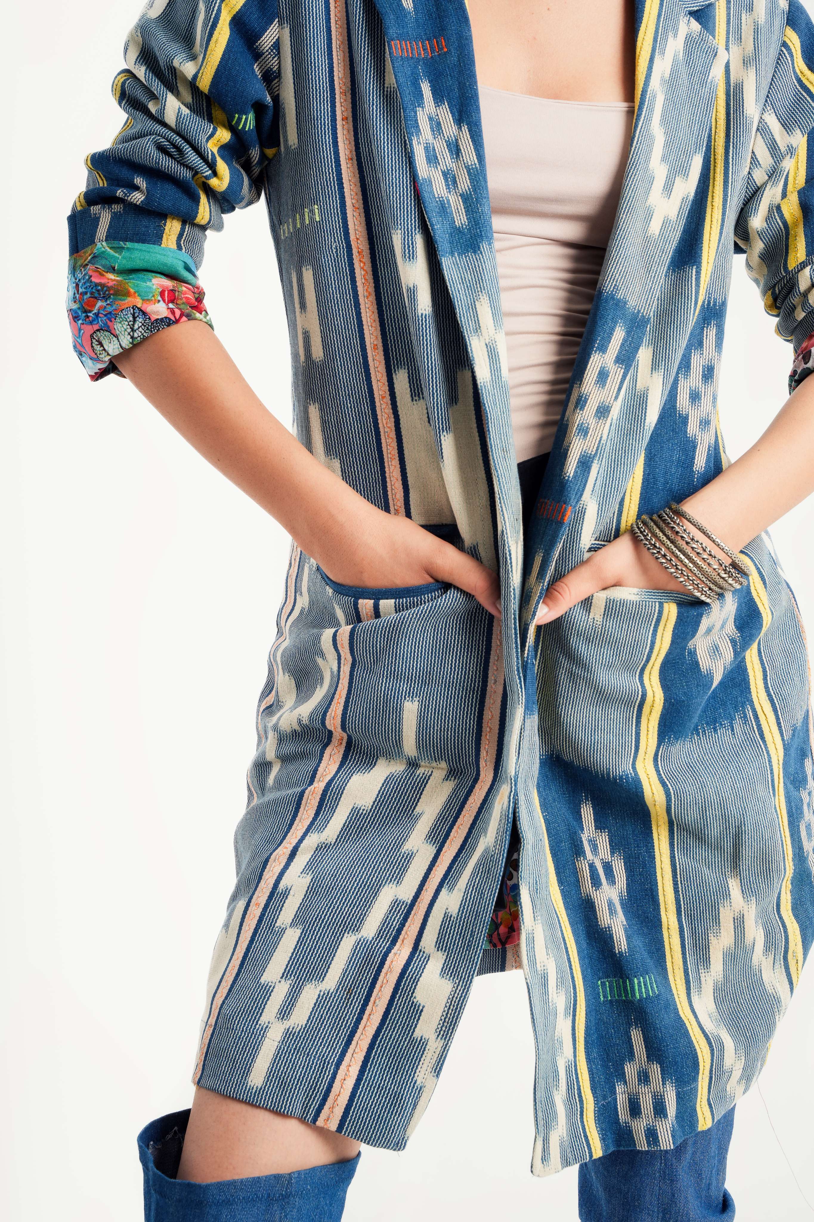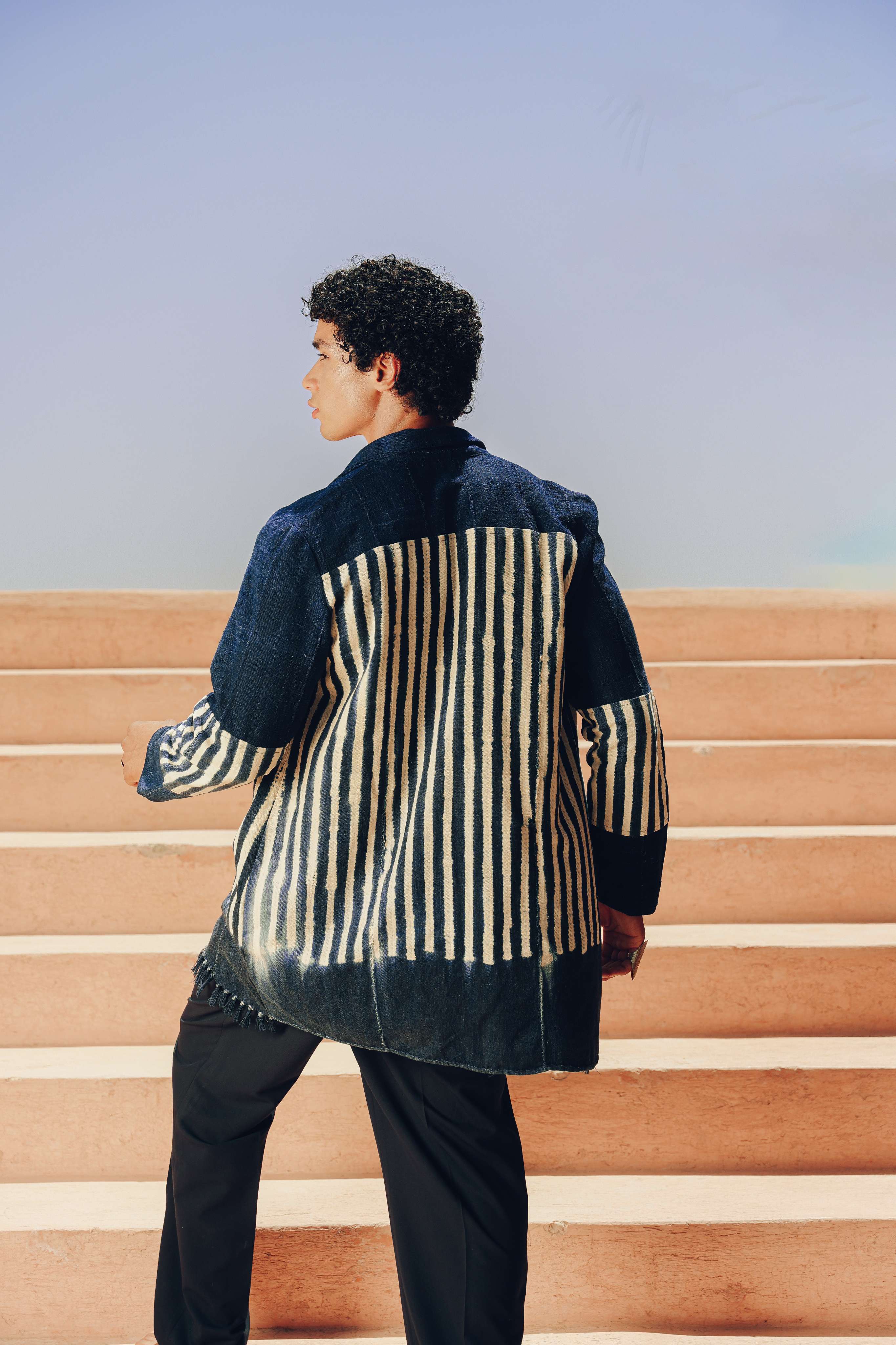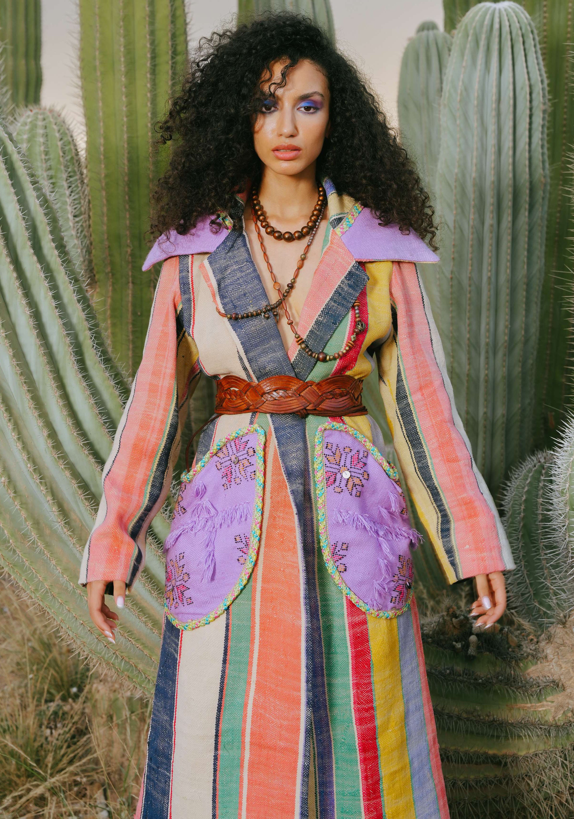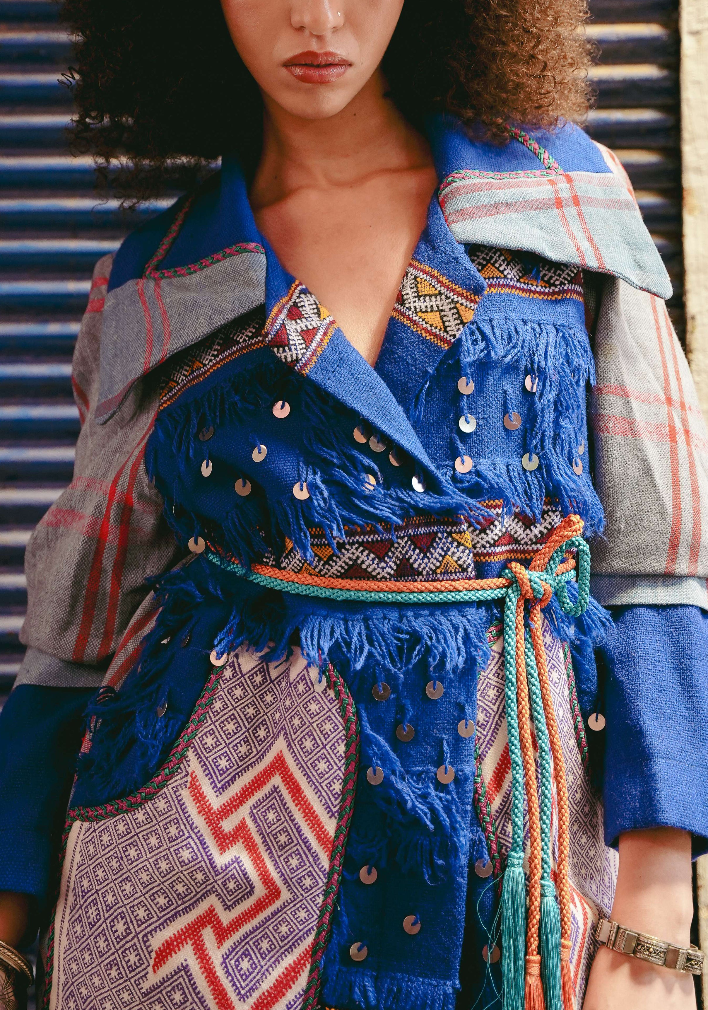 Each coat is a true one-of-a-kind piece upcycled from vintage Moroccan textiles: Berber kilims, mud cloths, indigo cloth, denim, wool rugs, and ceremonial weaves.