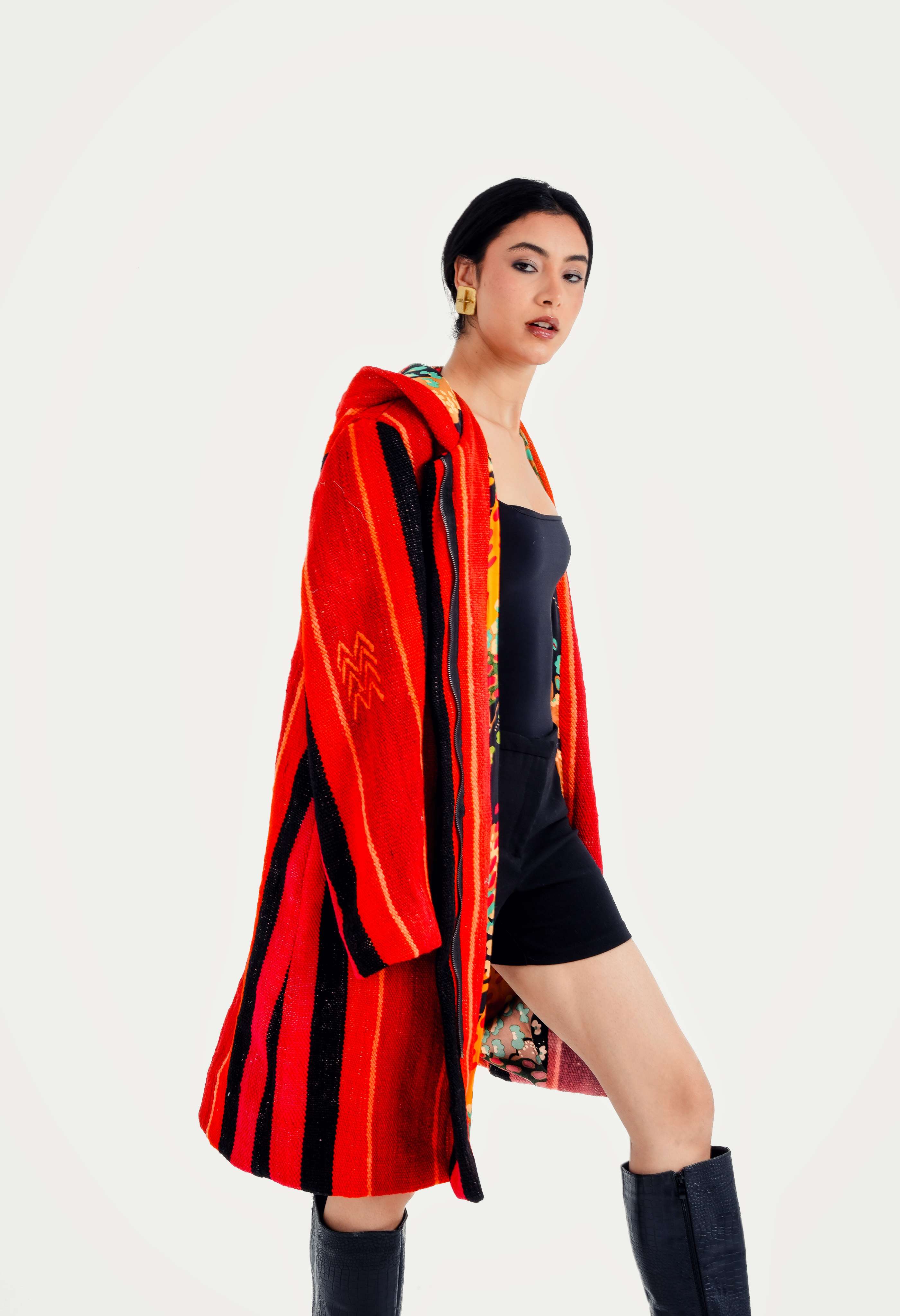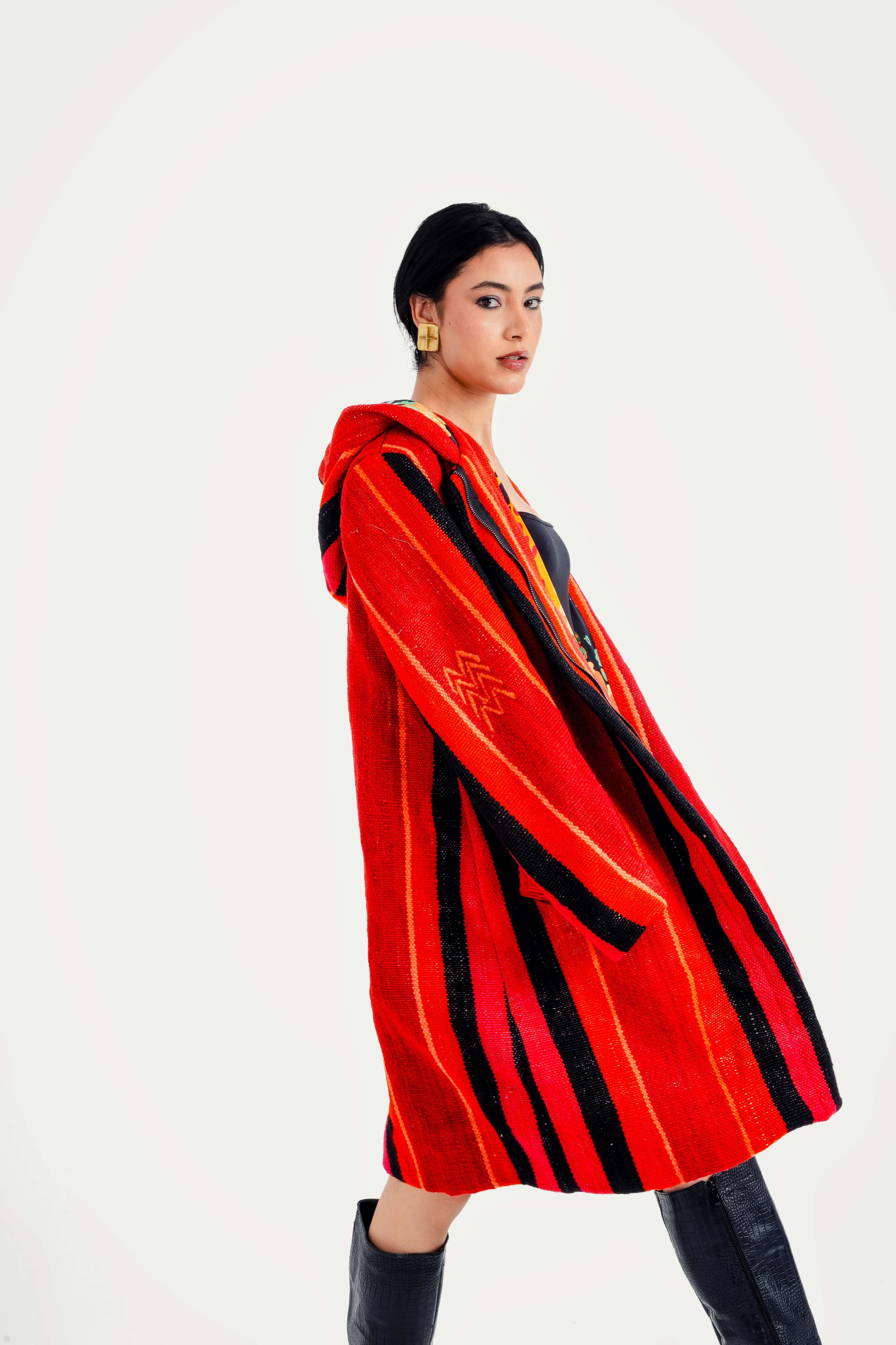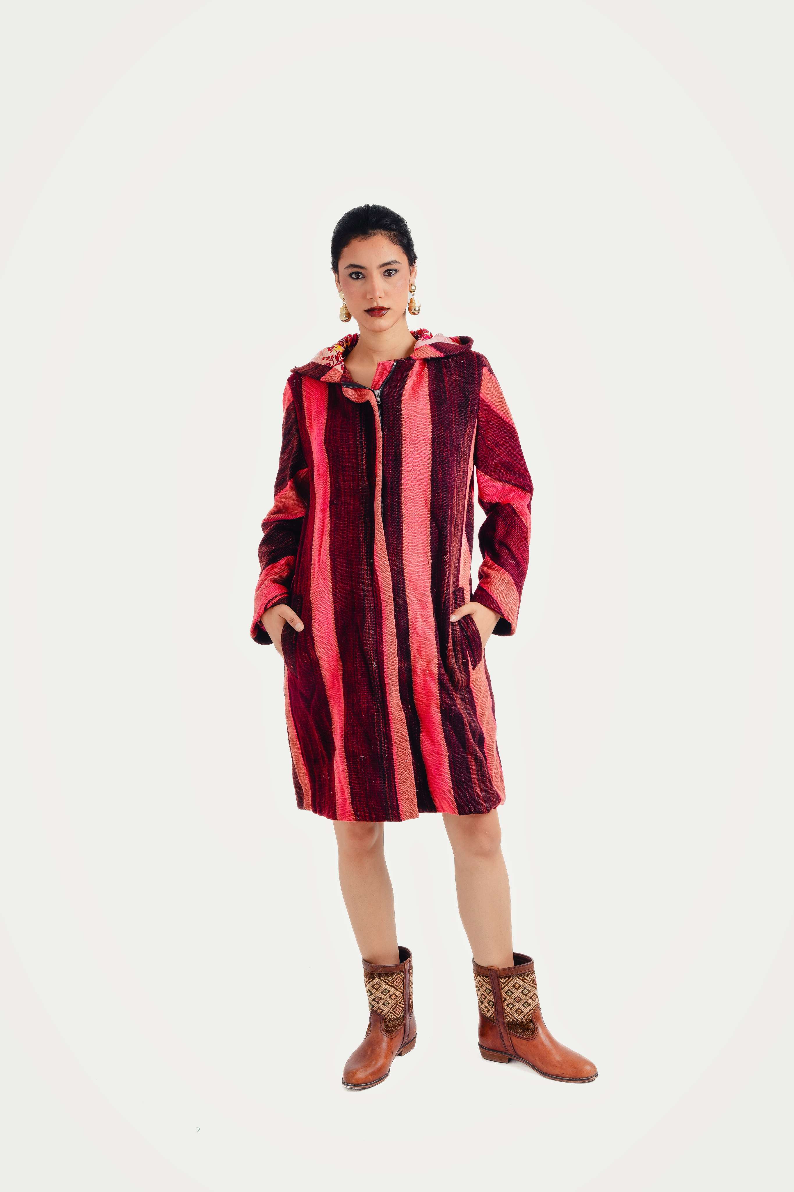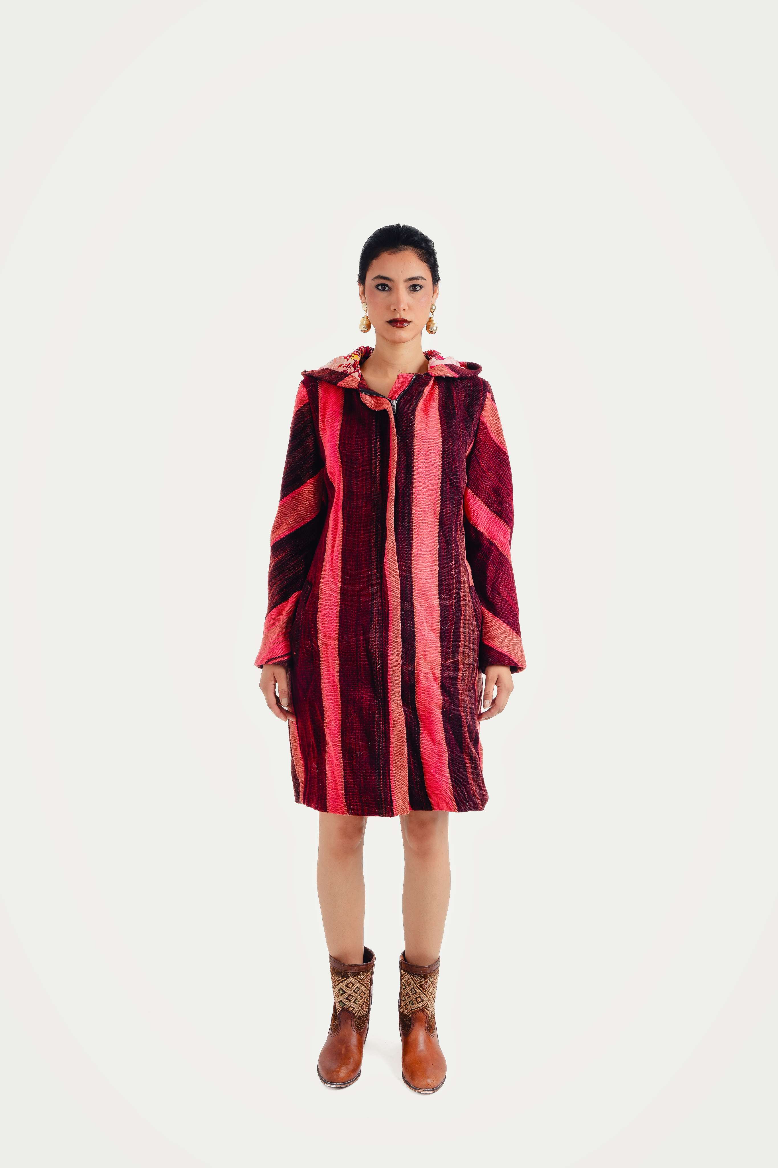 Each coat is a true one-of-a-kind piece upcycled from vintage Moroccan textiles: Berber kilims, mud cloths, indigo cloth, denim, wool rugs, and ceremonial weaves.