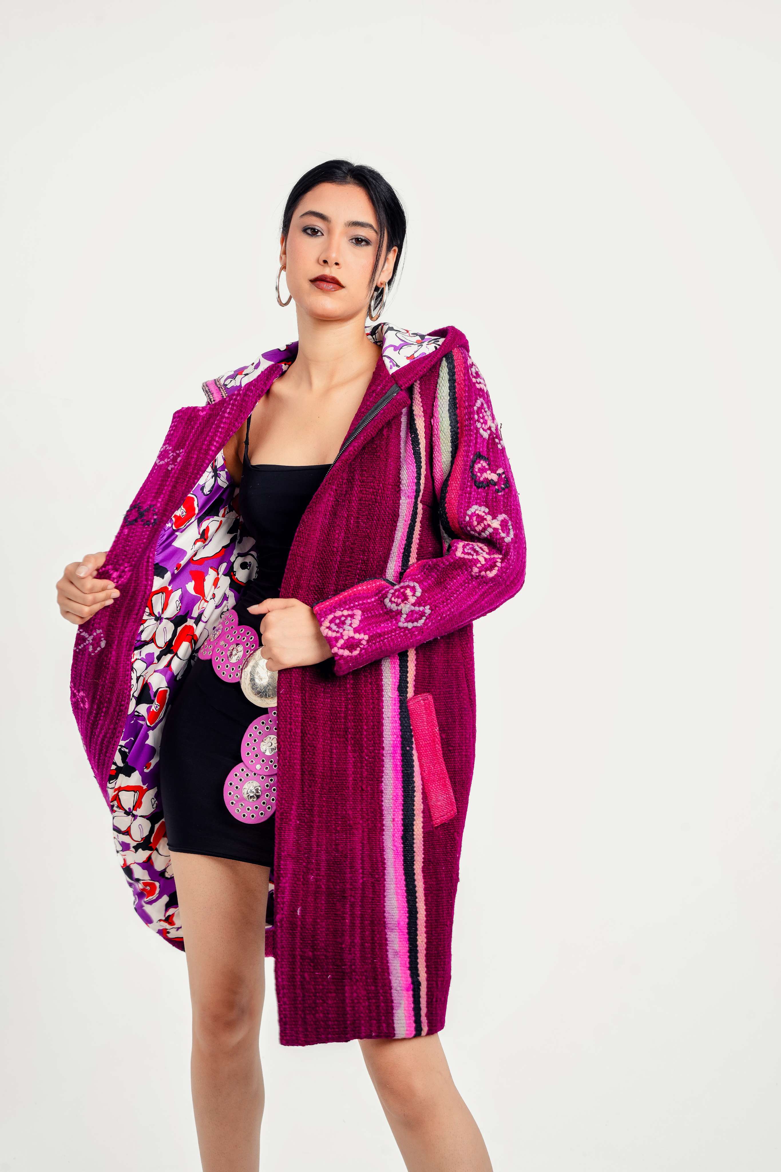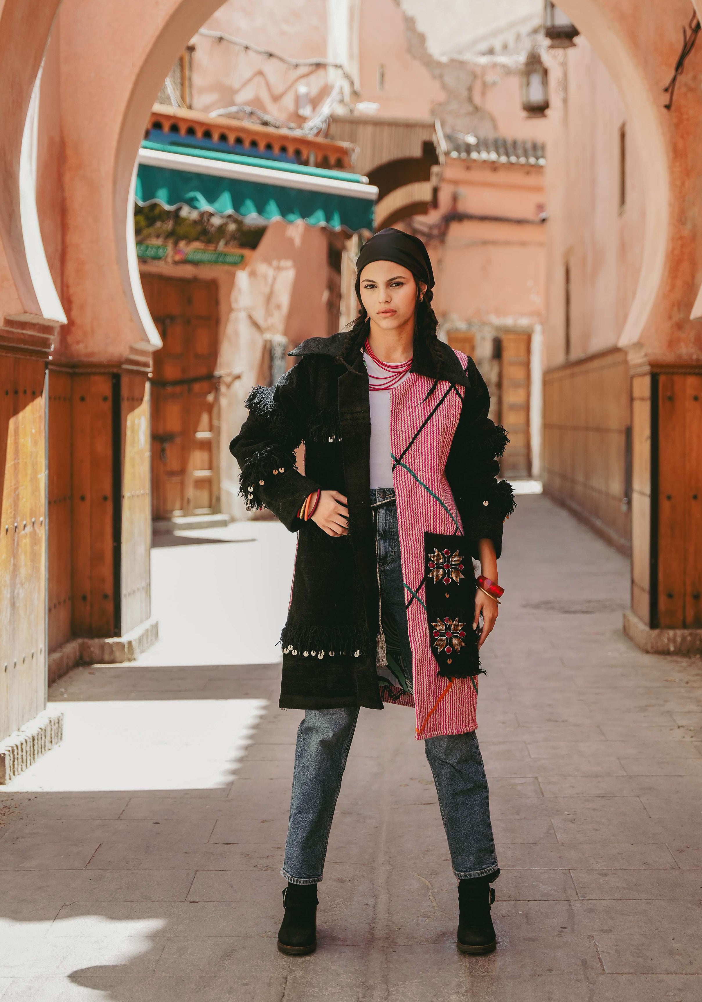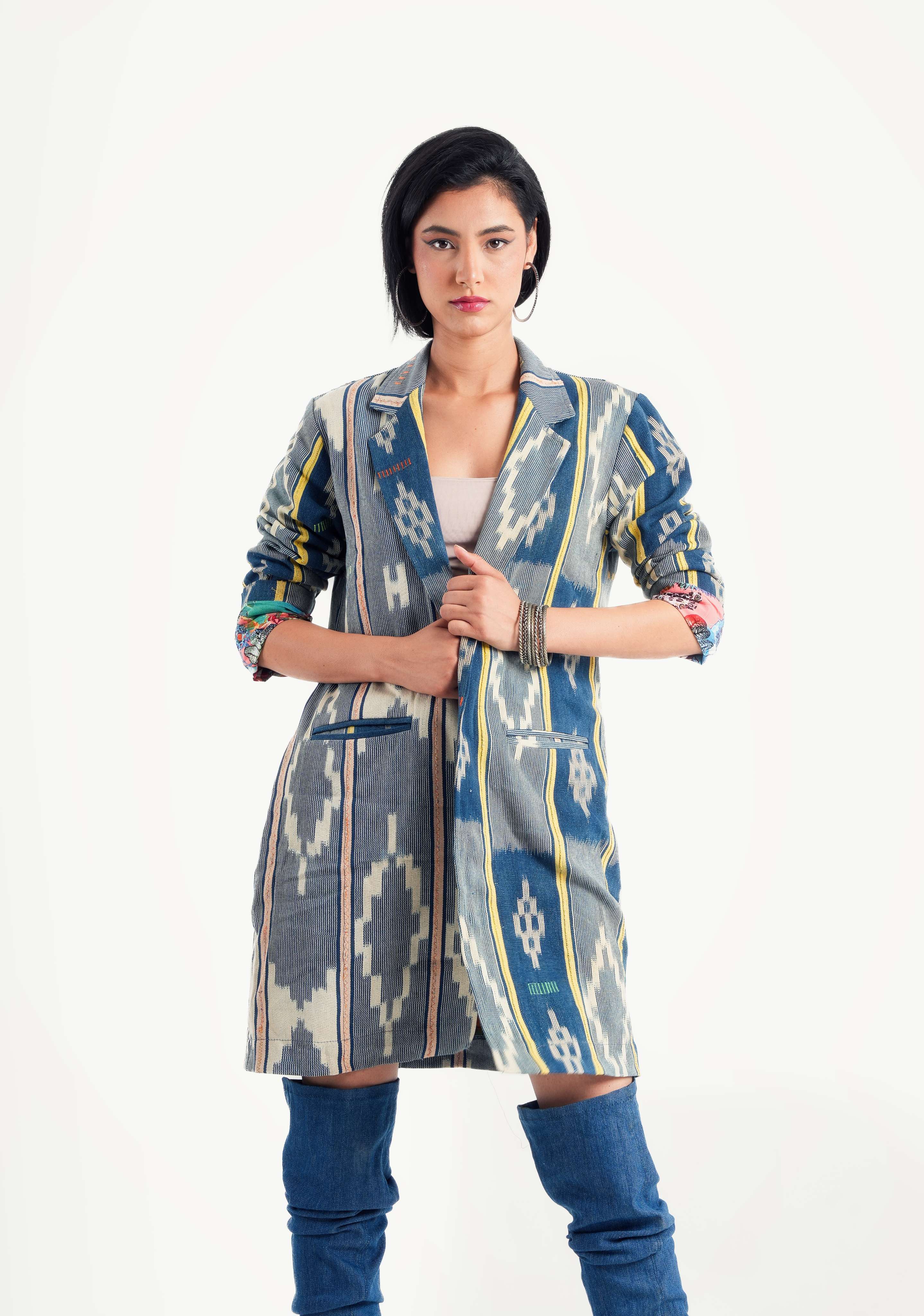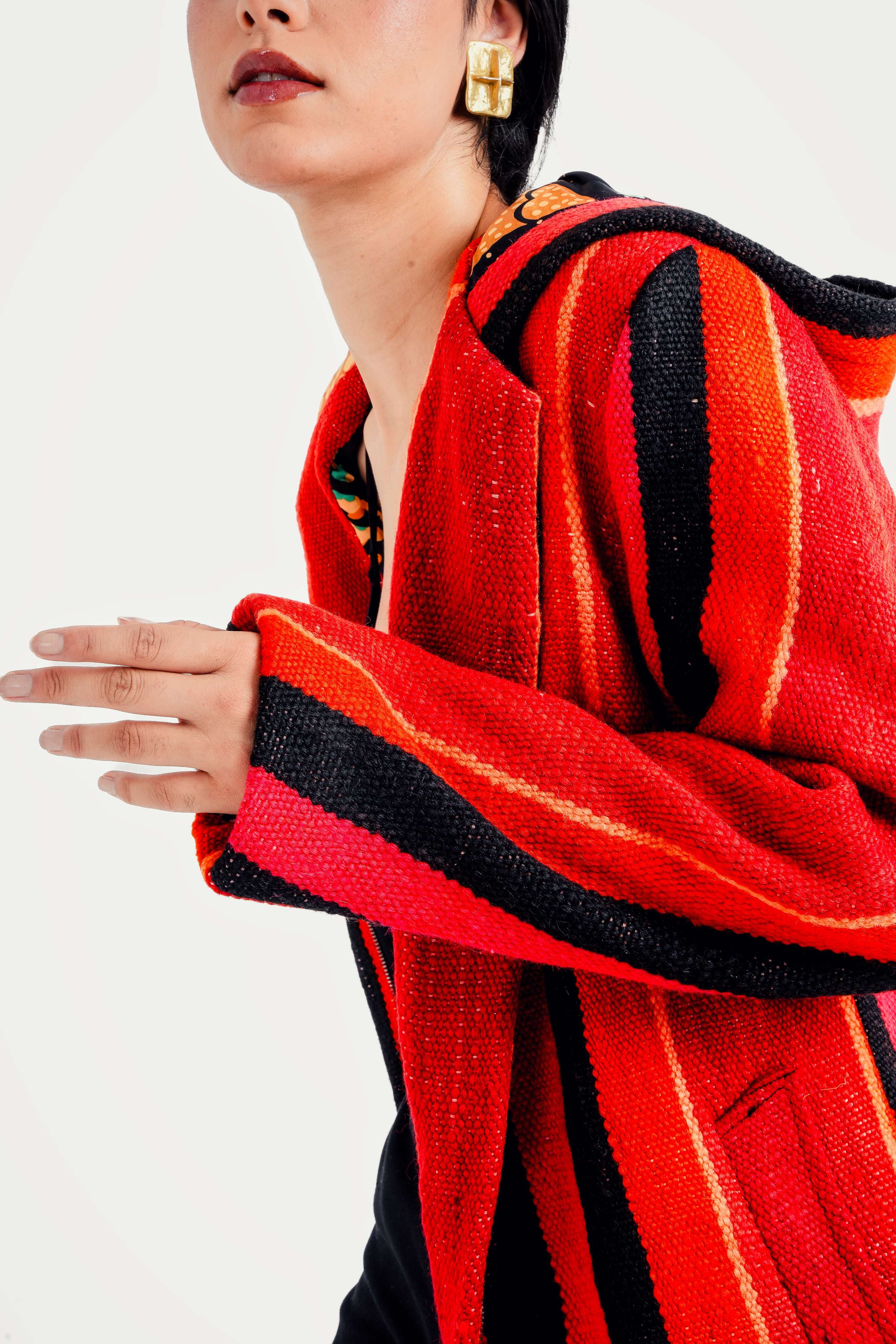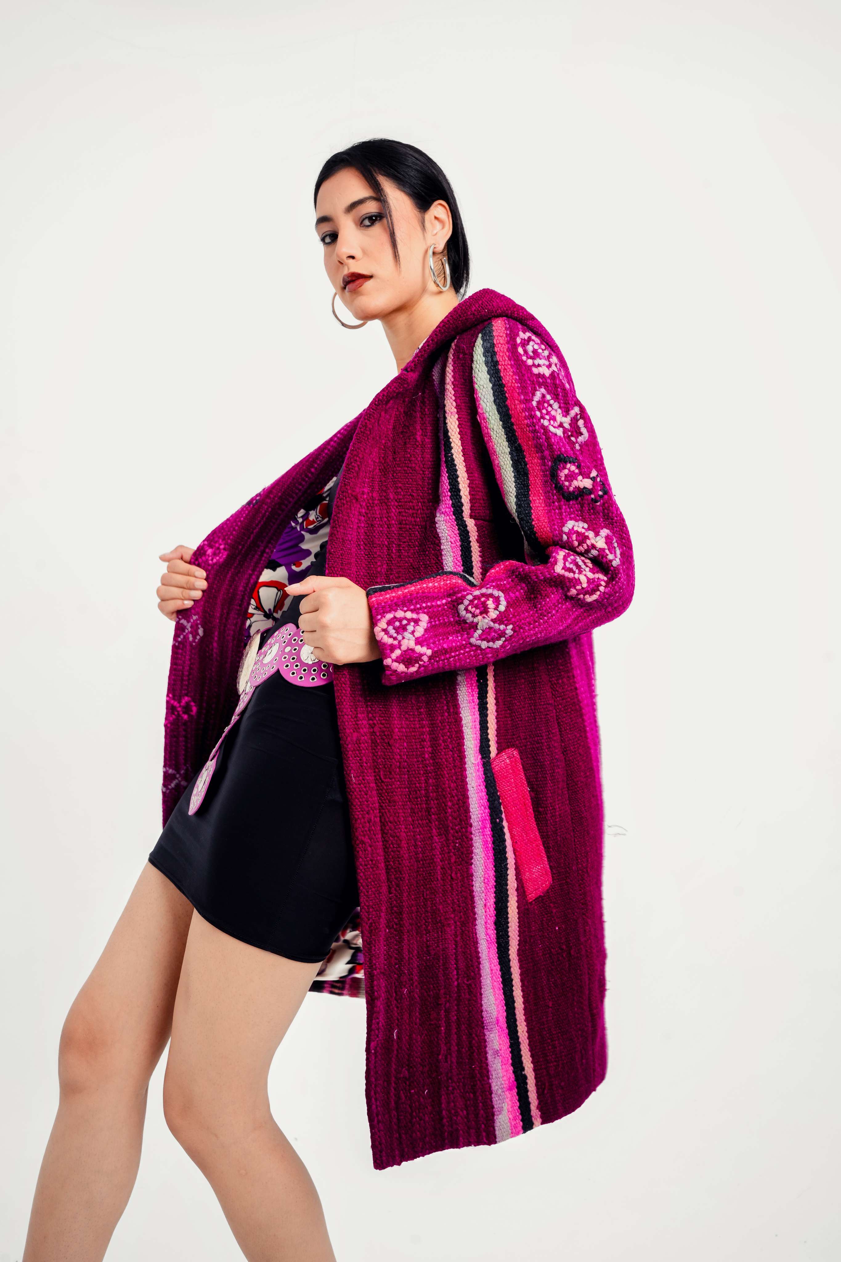 Each coat is a true one-of-a-kind piece upcycled from vintage Moroccan textiles: Berber kilims, mud cloths, indigo cloth, denim, wool rugs, and ceremonial weaves.