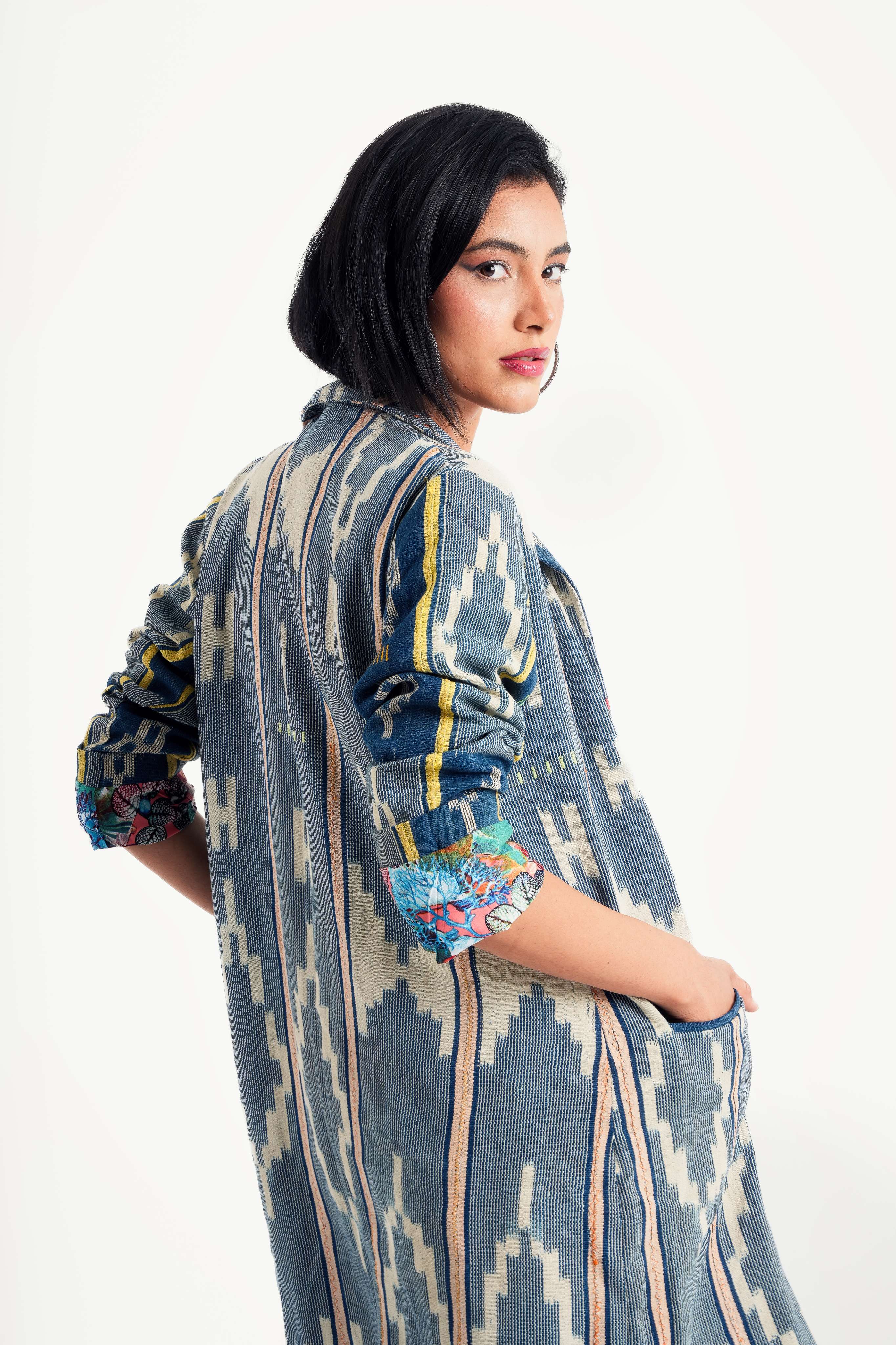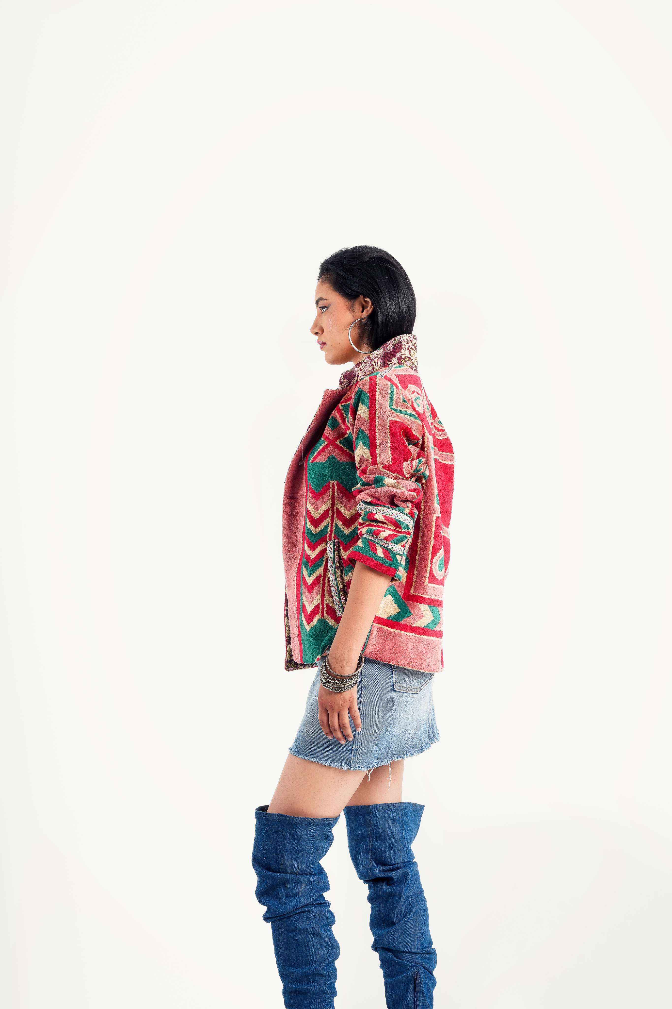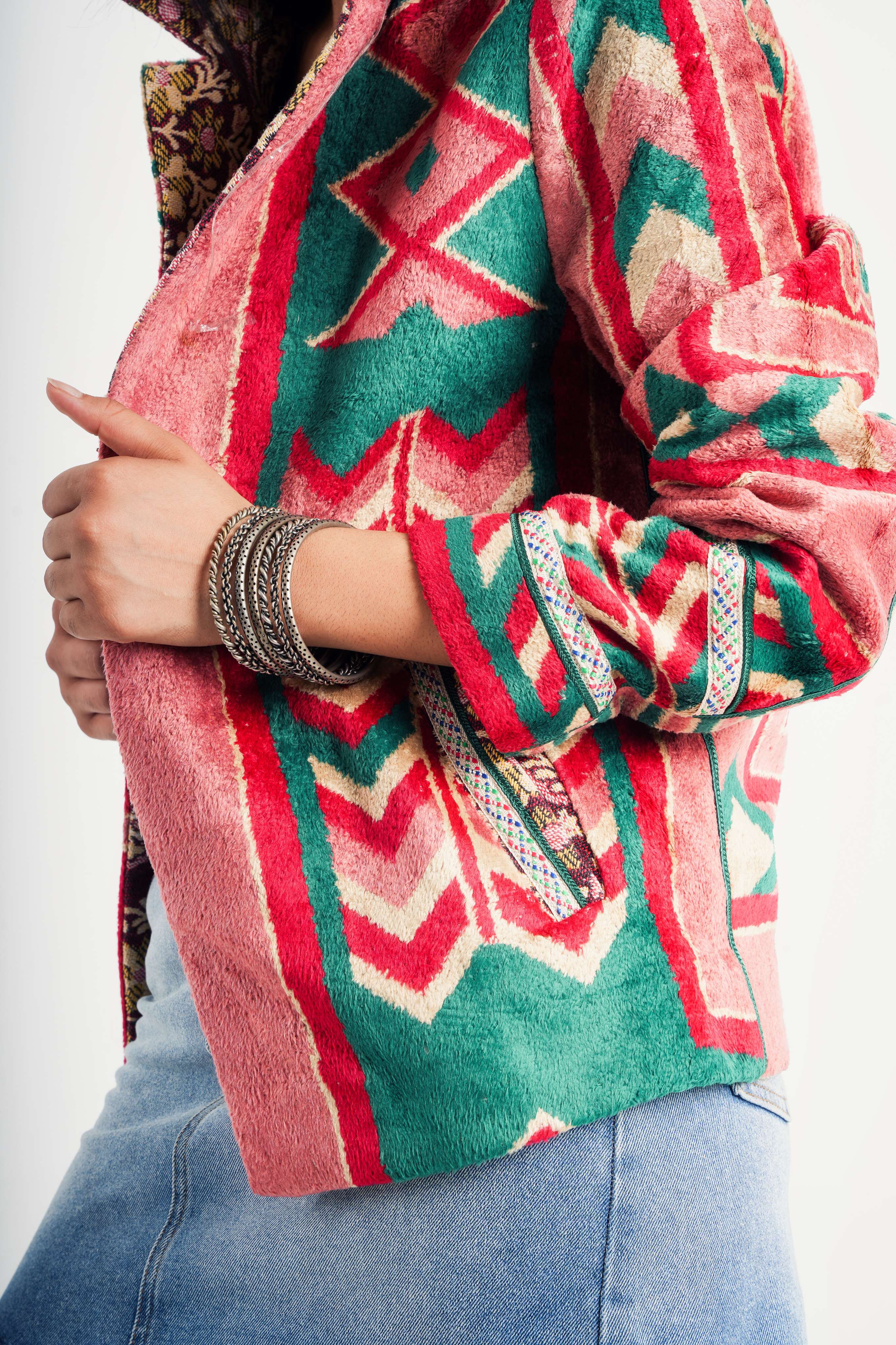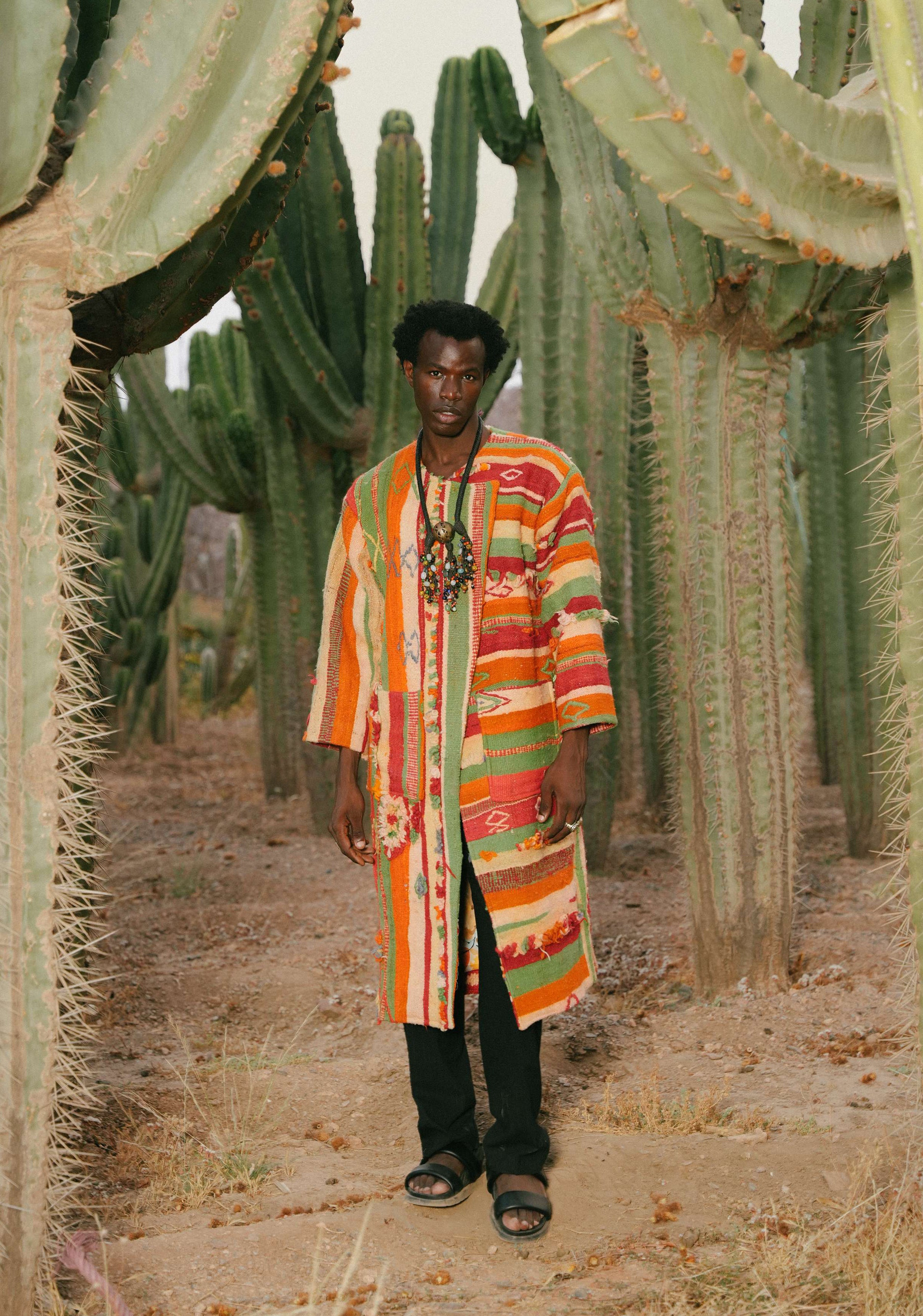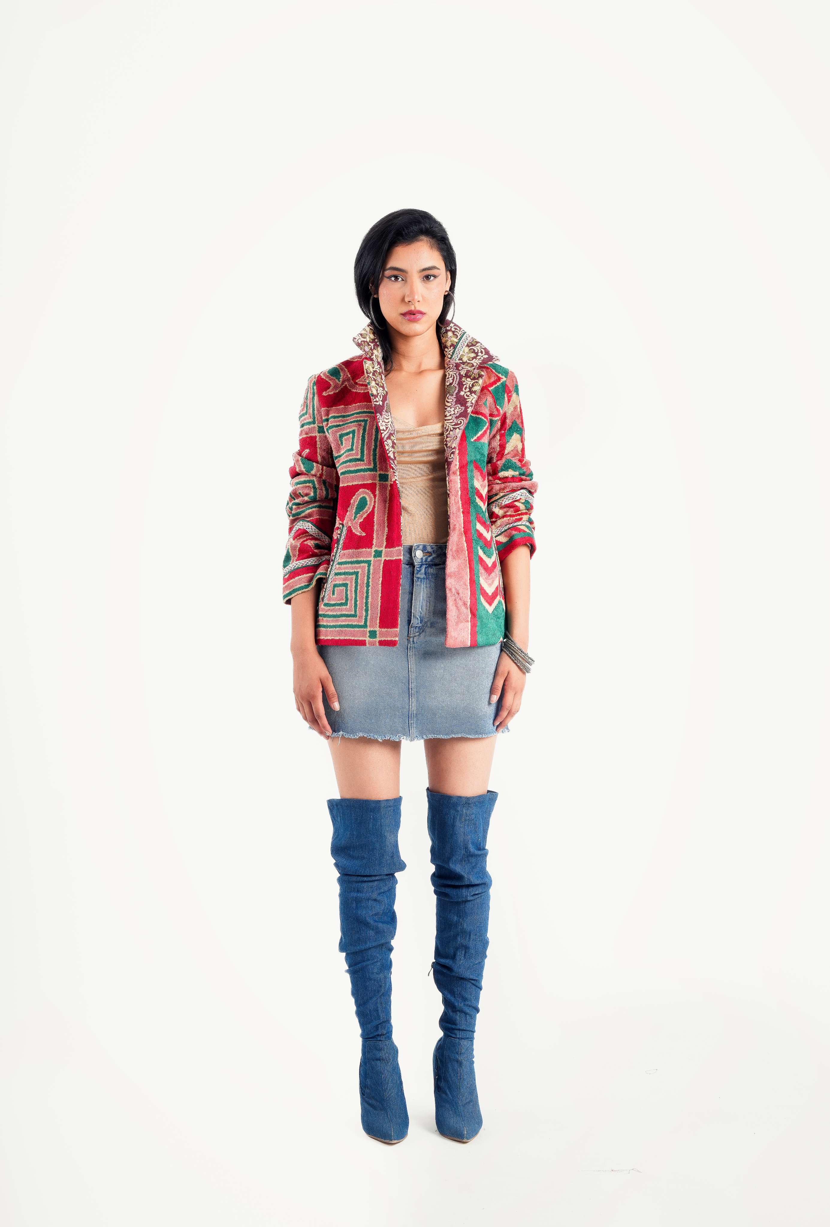 Each coat is a true one-of-a-kind piece upcycled from vintage Moroccan textiles: Berber kilims, mud cloths, indigo cloth, denim, wool rugs, and ceremonial weaves.