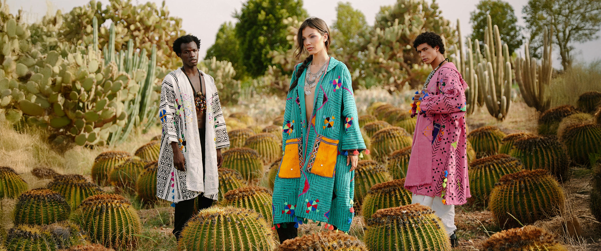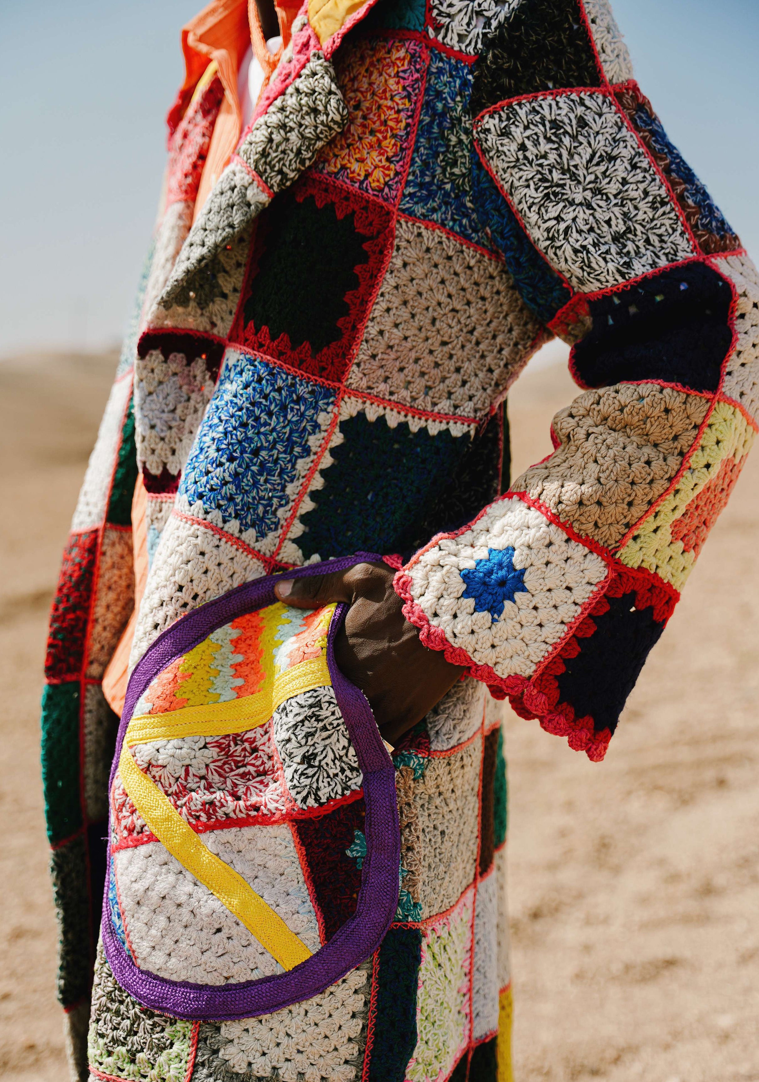 Each Desert Loom coat begins its journey in the heart of a desert village where generations of women sit together weaving, one knot at a time, what they believe will one day become a part of their daughters’ dowries, or adorn the family home with pride.
