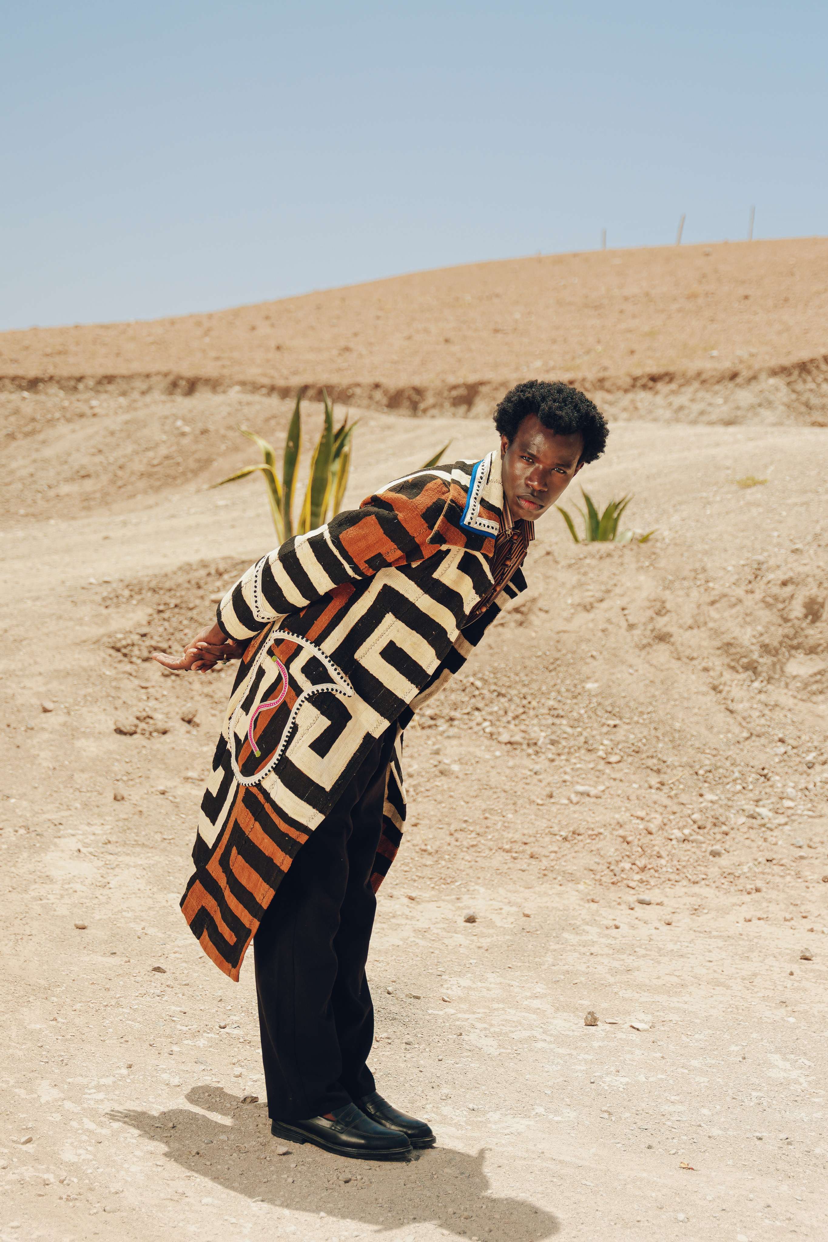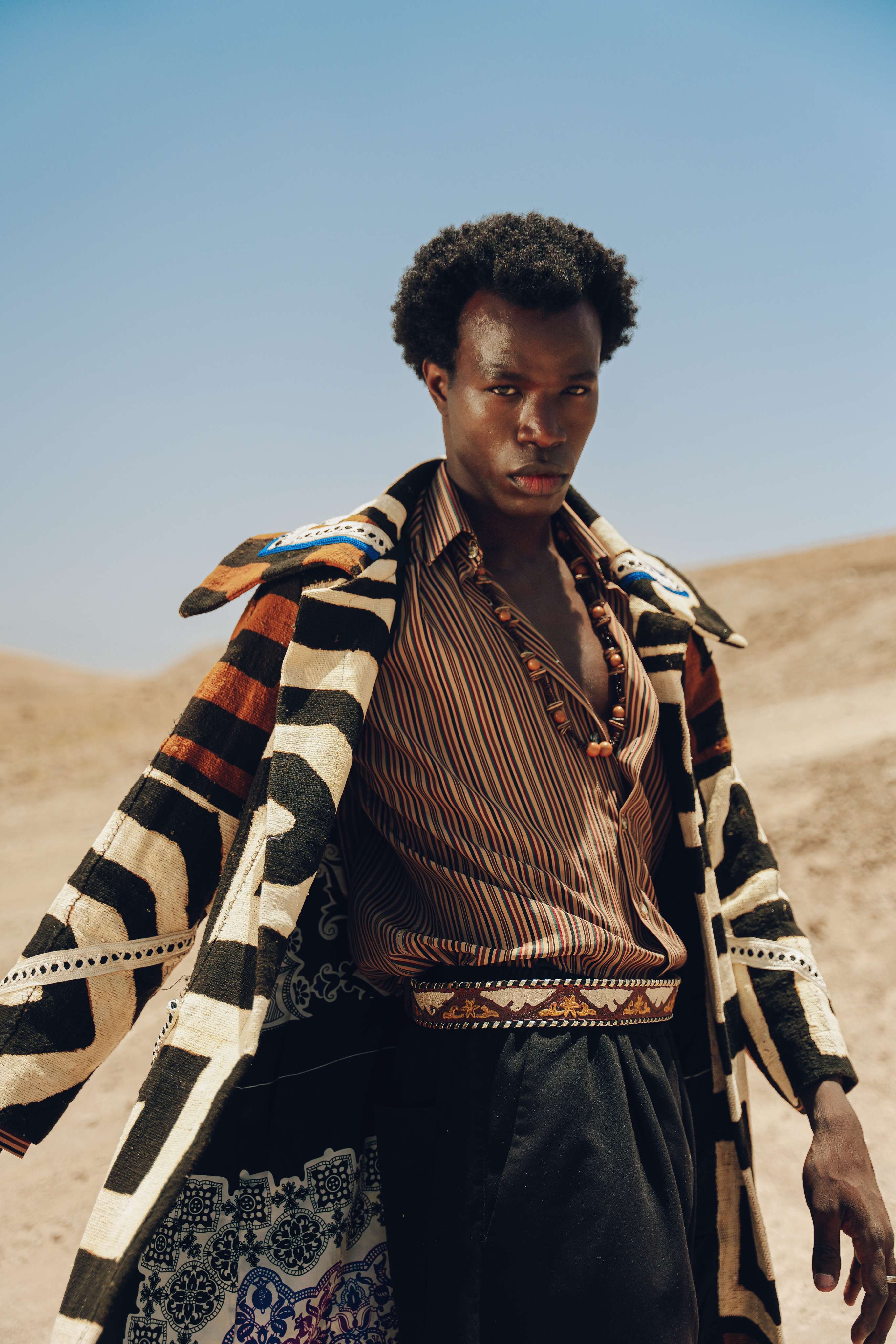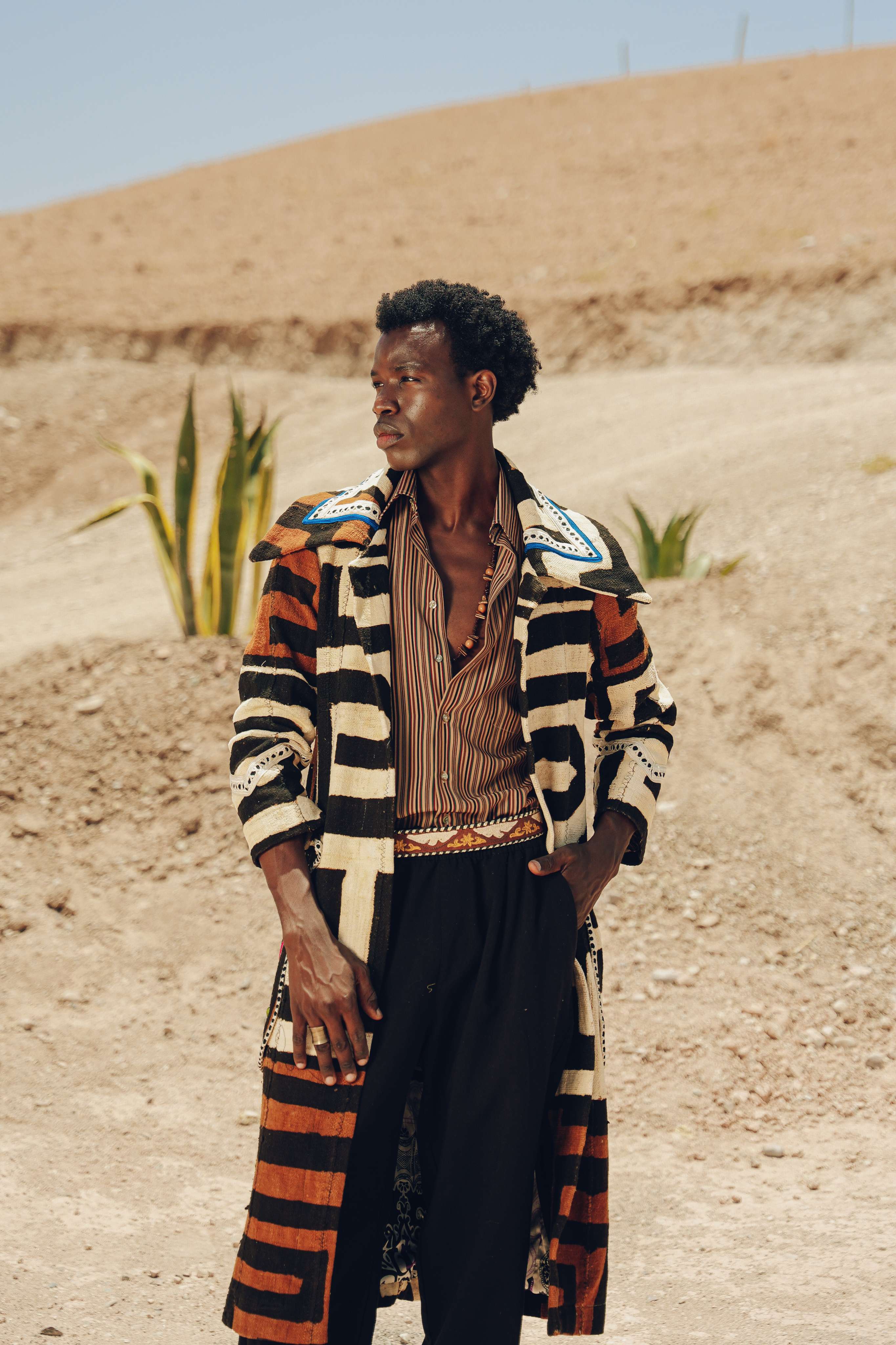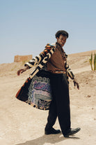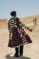 Inspired by the breathtaking beauty of a Ciel Rouge—a red sky at sunset—over a tranquil oasis, this trench coat is a piece of wearable poetry. Its incredibly plush, carpet-like weave offers comforting warmth, like being wrapped in the soft glow of twilight. The complex, interwoven colors of seafoam green, deep indigo, and dusty rose are like the layers of color in the evening sky reflecting on the cool, green landscape below. Handcrafted in Morocco, this is a gender-neutral coat for the wanderer who finds beauty in the quiet, magical moments of the day.
